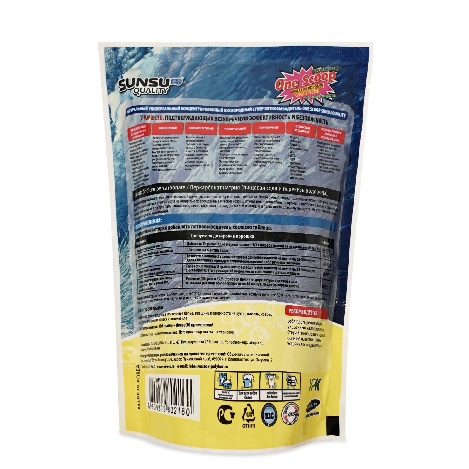 Пятновыводитель sunsu-q one scoop, универсальный, 300г. Универсальный пятновыводитель эффективно выводит пятна со всего: одежда, постельное белье, внешние поверхности на кухне, кафель, ковры, мягкая мебель, внутренняя обивка в автомобиле. Эффективно устраняет 99, 9% загрязнений. Экологичен, безопасен для человека и окружающей среды. Гипоаллергенный, без красителей и ароматизаторов, подходит для стирки детского белья. Не остается в волокнах одежды, полностью вымывается, не оставляя следов моющего средства на ткани. Универсальный, подходит для всех видов белья: белого, черного, цветного. Сохраняет цвет, продлевает презентабельный вид различных тканей. Вещь прослужит гораздо дольше. Безопасный, не содержит: фосфаты, фосфонаты, акрилаты, агрессивные ПАВ, SLS, SLES, ЭДТА, красители, искусственные ароматизаторы, оптические отбеливатели. Технологичный и удобный в использовании. Подходит для машинной стирки, для ручной стирки, для замачивания, для уборки помещений и мойки внешних поверхностей на кухне, сан. узлов, автомобиля, ковров, мебели. Способ применения: подходит для всех видов поверхностей. Используется для устранения застаревшей грязи раковин, плит, кафеля, сантехники. Экономичный, количество требуемого концентрата на 4 литра воды достаточно 10 грамм - это треть столовой ложки. Состав: Перкарбонат натрия (перекись водорода, пищевая сода). parts count: 0 Вес, г/Объём, мл: 300 Форма выпуска: Порошок Назначение: Для всех видов тканей : 0  развернуть описание ▼