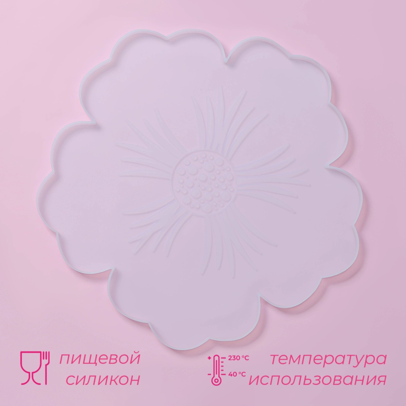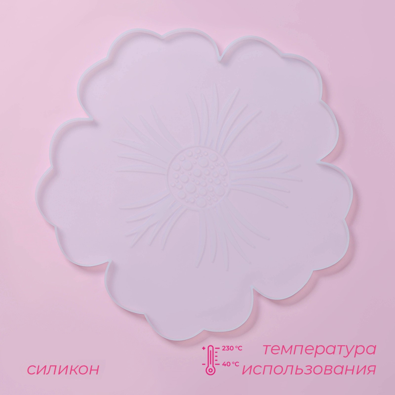 Молд доляна «петуния», силикон, d=34 см, прозрачный. Силиконовый молд – это отличный инструмент, который поможет вам создать разнообразные поделки и украшения. Преимущества: Молд может использоваться для создания мыла, изделий из полимерной глины, гипса и эпоксидной смолы.Молд силиконовый очень прост в использовании. Достаточно сделать нужную консистенцию смеси и аккуратно залить в форму. После застывания осторожно вынуть изделие из формы.Силиконовый молд многоразовый, и при правильном уходе форма прослужит вам долгие годы.Уход за молдом: Молды очень сильно притягивают пыль и грязь. Поэтому хранить их нужно пакетах. При загрязнении мыть только водой, либо водой с мылом и дать высохнуть естественным путем. Не протирать. Набор:Нет|Цвет:Прозрачный|Форма:Фигурная|Количество ячеек:1|Рисунок:Нет|Материал:Силикон|Наличие палочек для форм:Нет|Тематика:Растения, цветы|Можно мыть в посудомоечной машине:Нет|Пищевой материал:Нет|Страна:Китай  развернуть описание ▼
