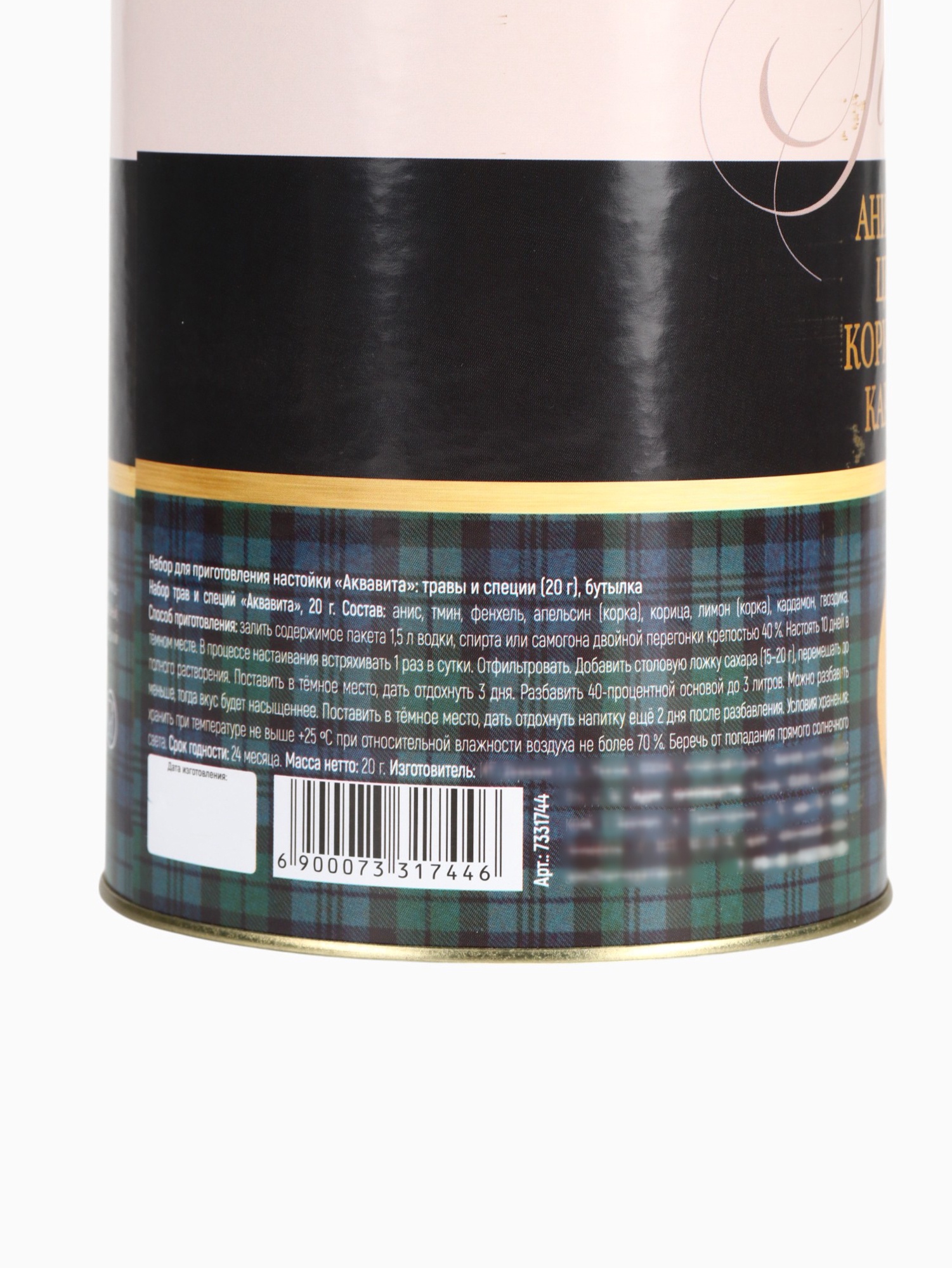 Подарочный набор для приготовления настойки «аквавита», набор трав и специй 20 г., бутылка 500 мл., инструкция. При оформление заказа, просим запрашивать актуальные сроки годности у менеджераСостав: анис, гвоздика, кардамон, корица, цедра лимона, тмин, фенхель. Срок годности: 24 месяца Масса нетто: 20 г. Бутылка Состав: стекло. Объём: 0,5 л. В наборе, шт.:2|Вес нетто, г:20|Вид упаковки:Металлический тубус|Тематика праздника:Универсальная тематика|Адресат:Без адресата|Составляющие набора:Травы|Составляющие набора:Бутылка|Составляющие набора:Специи|Возраст:Для взрослых|Страна:Россия  развернуть описание ▼