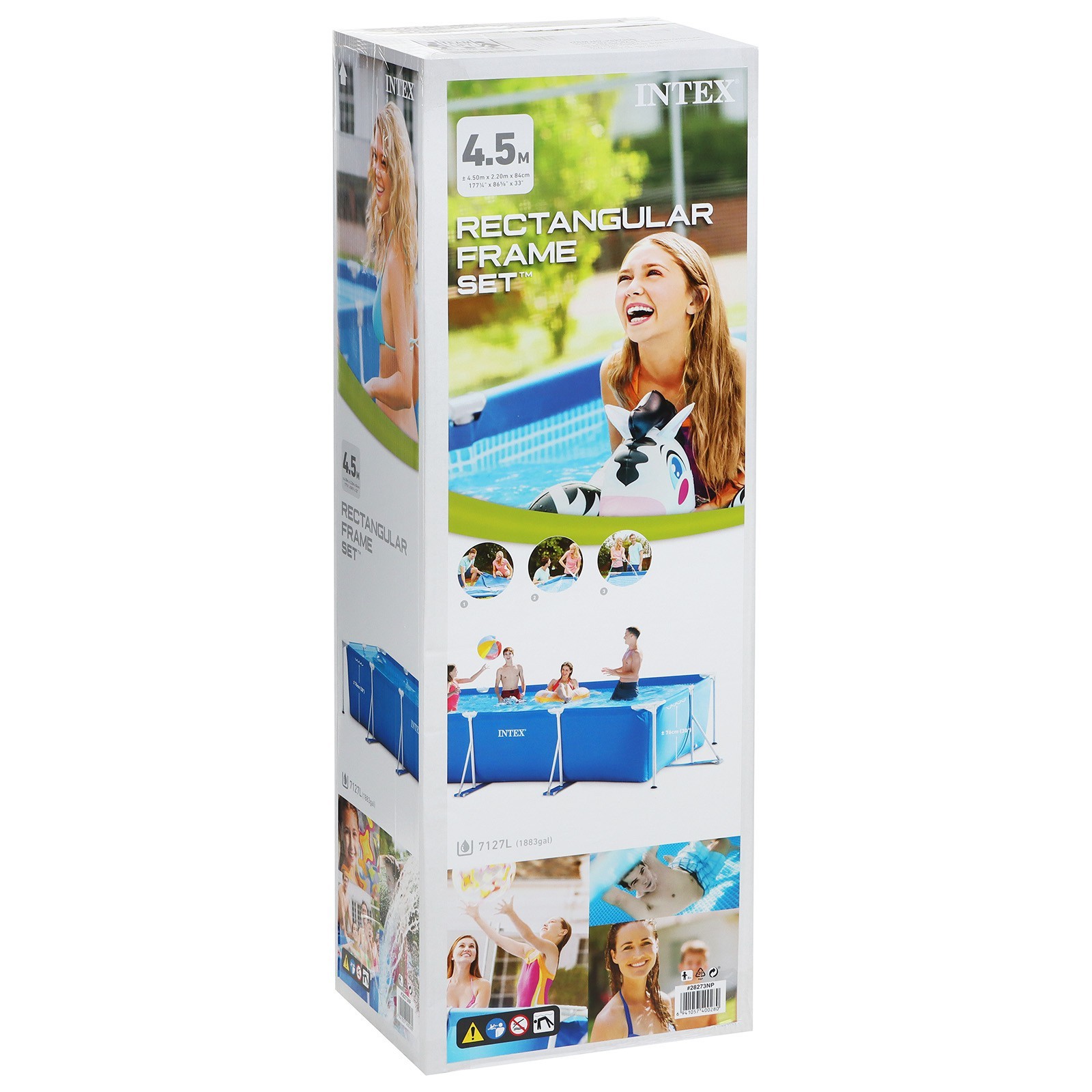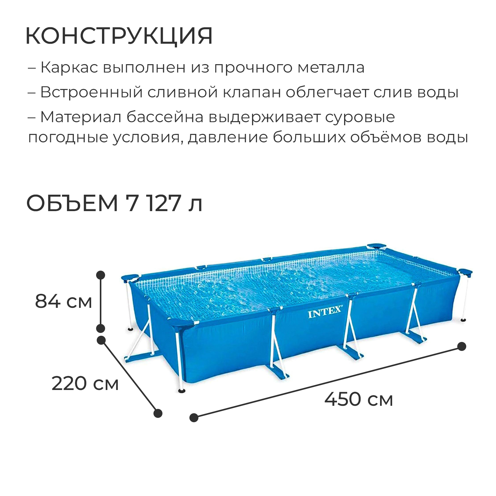 Бассейн каркасный frame set, прямоугольный, 450 х 220 х 84 см, от 6 лет, 28273np intex. Каркасный бассейн — это отличный выбор для всей семьи. Каркас бассейна сделан из прочного металла, что позволяет выдерживать ему большие нагрузки. Материал бассейна выдерживает суровые погодные условия, устойчив к прямым попаданиям солнечных лучей и воздействию хлора, выдерживает давление больших объёмов воды. Встроенный сливной клапан облегчает слив воды, путём присоединения садового шланга с входящим в комплект адаптером. Таким образом, воду можно слить в любое удобное место или, например, полить сад. Форма: Прямоугольная Длина, см: 450 Ширина, см: 220 Высота, см: 84 Наличие насоса: Нет Тип фильтра для насоса: Нет Количество слоёв: 3 Объём, л: 7127 Тент: Нет Подстилка: Нет Лестница: Нет : 0 Диспенсер: Нет Наличие фильтр-насоса: Нет  развернуть описание ▼