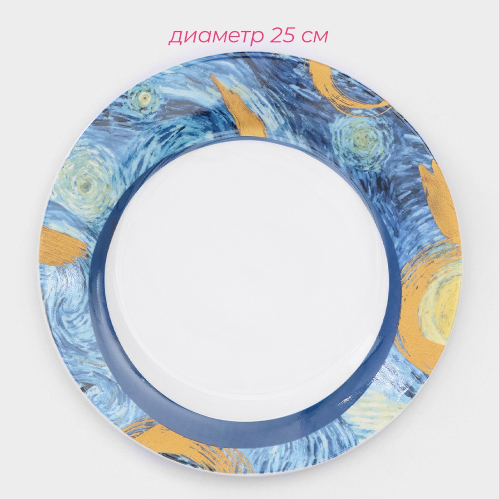 Набор тарелок фарфоровых доляна «звёздная ночь», 18 предметов: 6 тарелок d=20 см, 6 тарелок d=25 см, 6 тарелок глубоких 340 мл. Серия посуды «Звездная ночь» вдохновлена полотнами Винсента Ван Гога. Она выполнена из фарфора с изображением предрассветного неба. Невероятно приятная, контрастная цветовая комбинация шедевра воодушевляет и завораживает. Такая посуда станет украшением обеденного стола, а также замечательным подарком. Соберите свою уникальную коллекцию из нашего многообразия предметов. тарелка глубокая – 160 мл, d=20 см, 6 шт;тарелка – d=20 см, 6 шт;тарелка – d=25 см, 6 шт. Вся серия изготовлена из твердого фарфора с упрочненными краями, защищенными от сколов. Посуду можно греть в микроволновой печи. Можно мыть в ПММ, что позволит вам меньше времени проводить на кухне и больше времени посвящать семье и друзьям. Цвет: Белый Цвет: Синий Форма: Круглая Диаметр, см: 20 Диаметр, см: 25 Количество персон: 6 В наборе, шт.: 18 Объём, мл: 340 Тематика: Узоры Материал: Фарфор (Новый костяной фарфор) Вид тарелки: Глубокая Вид тарелки: Плоская Можно мыть в посудомоечной машине: Да Можно использовать в СВЧ-печи: Да Текстура: Гладкая Особенности: Без особенностей Матовая поверхность: Нет Для горячего: Да Запрет реализации по сегментам: 00000000485  развернуть описание ▼