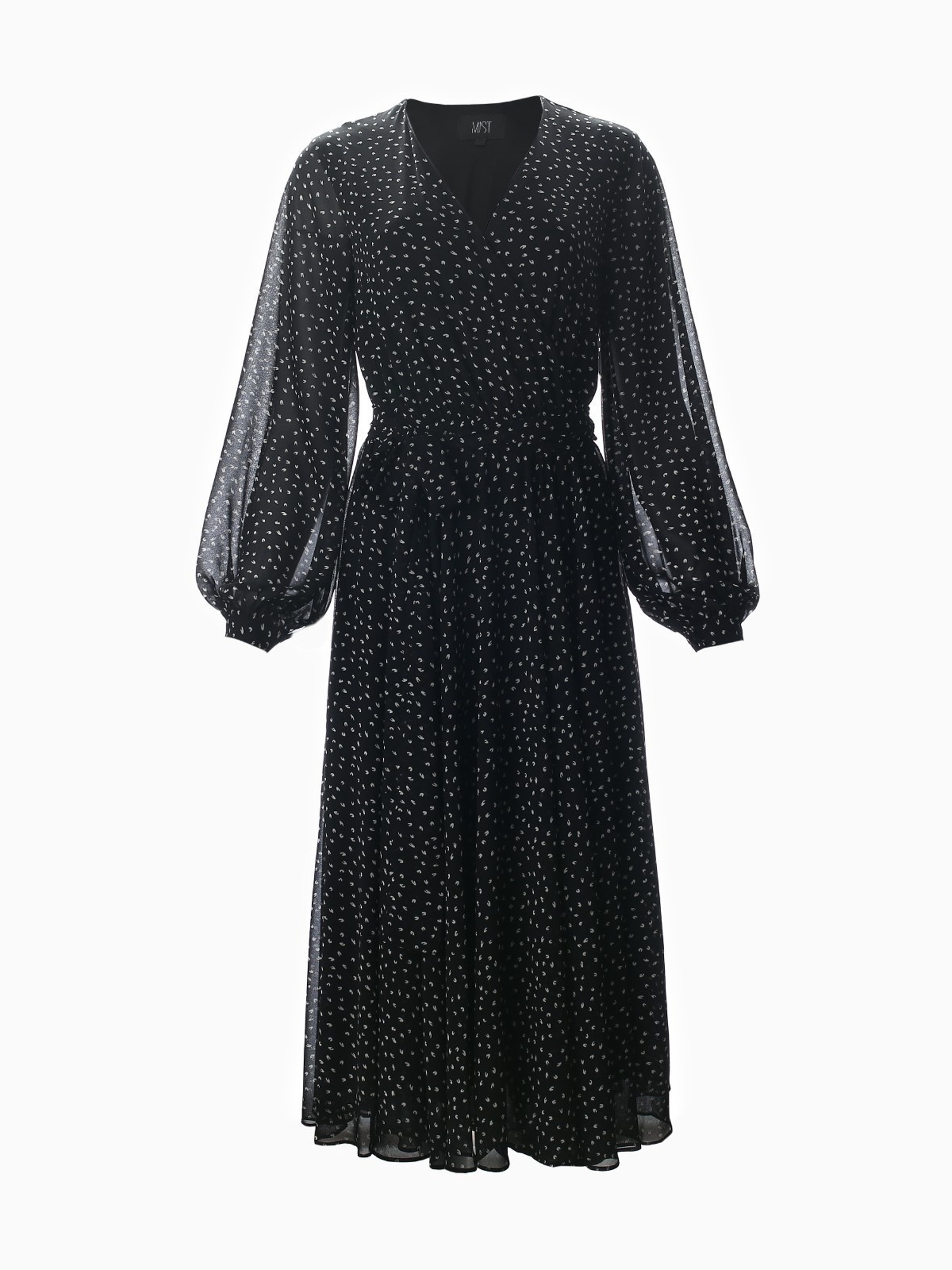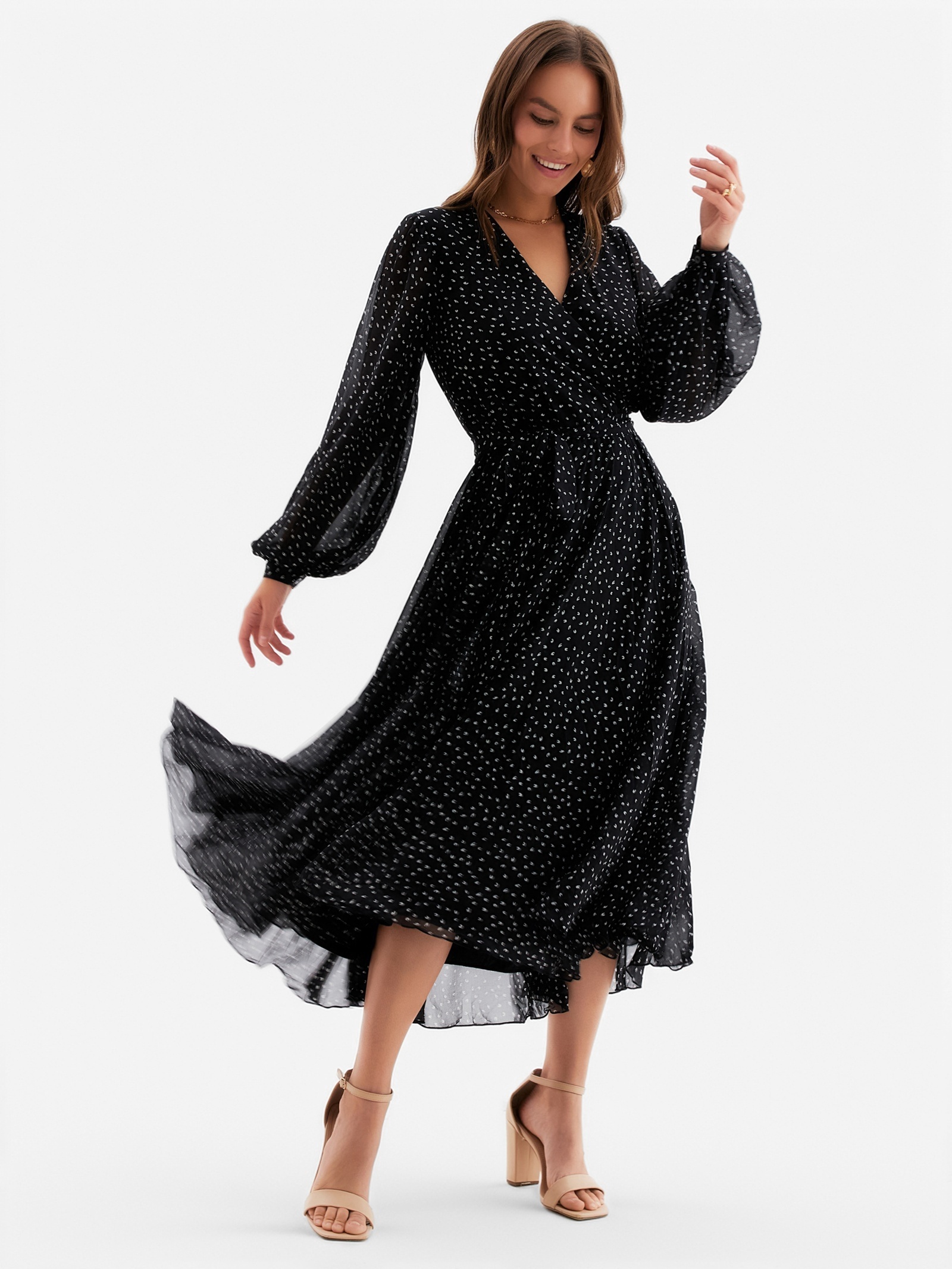 Платье с поясом миди женское mist, размер 46, чёрное. Цвет:Чёрный|Для кого:Для женщины|Назначение:Повседневная|Ткань:Шифон|Размер:46|Рост, см:165 - 175|Длина рукава, см:64|Рост модели на фото, см:167|Сезон:Лето|Сезон:Демисезон|Вид застёжки:Пояс|Тематика:Горошек (кружочки)|Длина рукава:Длинный|Тематика праздника:8 Марта|Тематика праздника:Новый год|Вырез горловины:V-образный|Декоративные элементы:Пояс|Покрой:Полуприлегающий|Тип карманов:Без карманов|Рекомендации по уходу:Деликатная стирка при 30 °С|Рекомендации по уходу:Барабанная сушка запрещена|Рекомендации по уходу:Не отбеливать|Рекомендации по уходу:Глажка при 100 °С|Состав ткани:Полиэстер|Длина юбки:Миди|Обхват талии, см:76|Вид юбки:Полусолнце|Длина изделия по спинке, см:126|Обхват бёдер, см:104|Параметры модели на фото (ОГ-ОТ-ОБ):78-60-88|Размер одежды:42|Страна:Россия  развернуть описание ▼