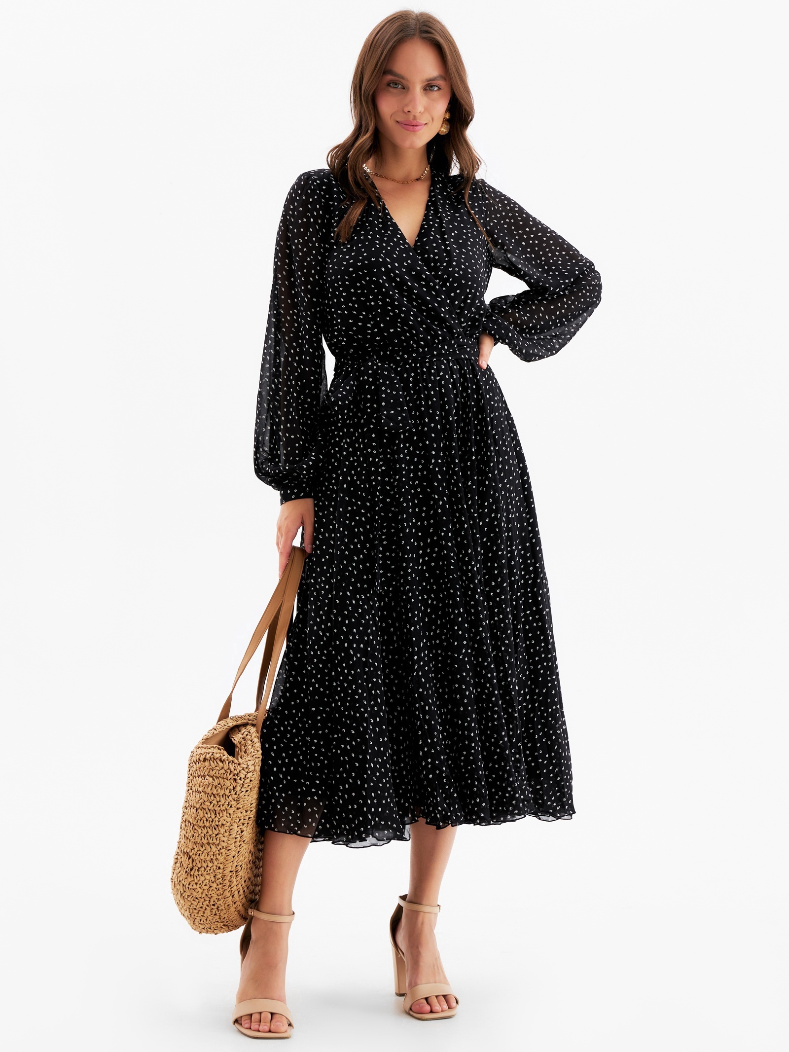 Платье с поясом миди женское mist, размер 50, чёрное. Цвет:Чёрный|Для кого:Для женщины|Назначение:Повседневная|Ткань:Шифон|Размер:50|Рост, см:165 - 175|Длина рукава, см:64|Рост модели на фото, см:167|Сезон:Демисезон|Сезон:Лето|Вид застёжки:Пояс|Тематика:Горошек (кружочки)|Длина рукава:Длинный|Тематика праздника:Новый год|Тематика праздника:8 Марта|Вырез горловины:V-образный|Декоративные элементы:Пояс|Покрой:Полуприлегающий|Тип карманов:Без карманов|Рекомендации по уходу:Барабанная сушка запрещена|Рекомендации по уходу:Деликатная стирка при 30 °С|Рекомендации по уходу:Не отбеливать|Рекомендации по уходу:Глажка при 100 °С|Состав ткани:Полиэстер|Длина юбки:Миди|Обхват талии, см:84|Вид юбки:Полусолнце|Длина изделия по спинке, см:127|Обхват бёдер, см:112|Параметры модели на фото (ОГ-ОТ-ОБ):78-60-88|Размер одежды:42|Страна:Россия  развернуть описание ▼