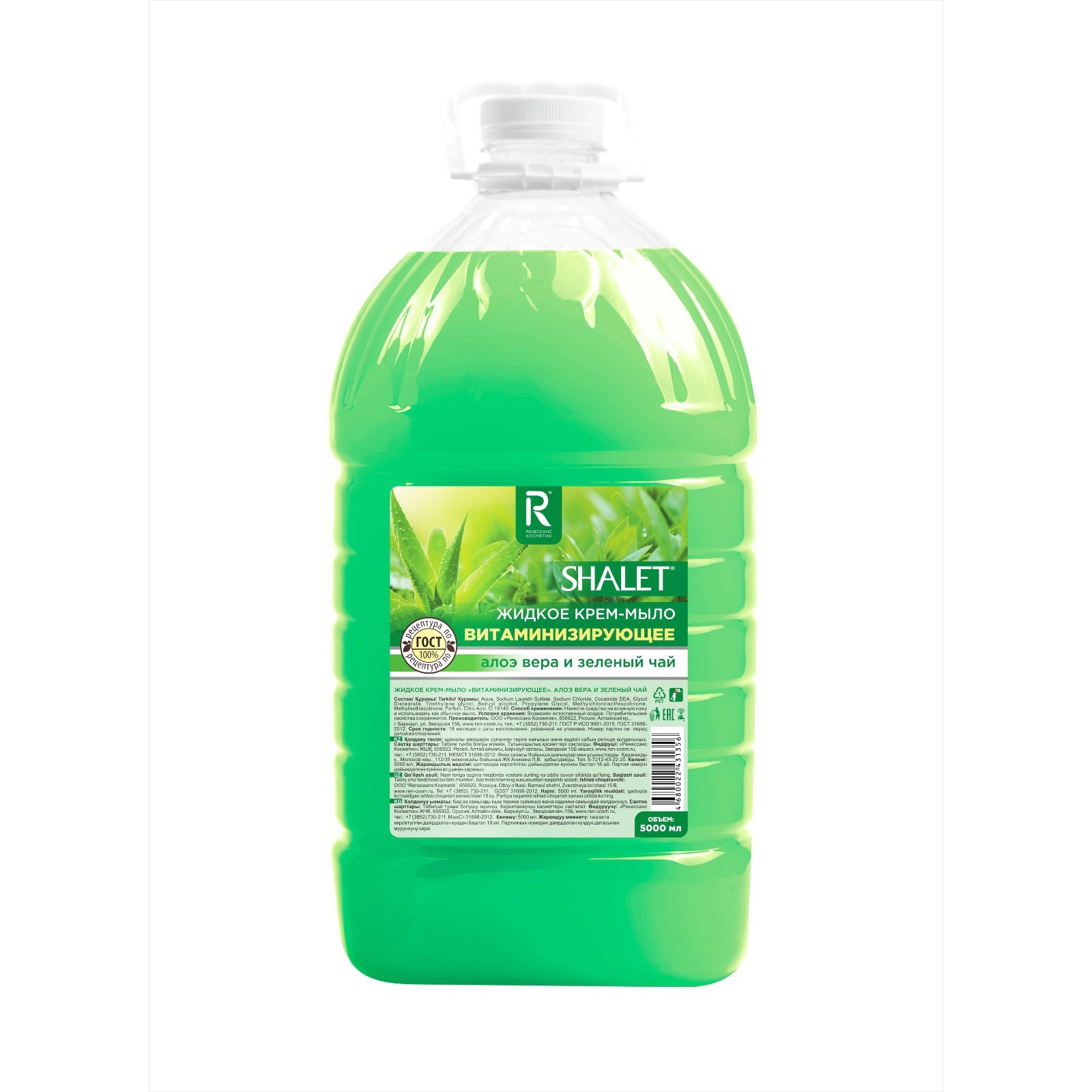 Крем-мыло shalet зеленый чай и алоэ вера, витаминизирующее, 5 л. Жидкое крем-мыло, для мытья рук, мытья столовых приборов, кухонных поверхностей. Способ применения: нанести средство на руки, намылить и ополоснуть под струей воды. Мытье вертикальных поверхностей: растворите 70 мл средства в 5 л воды, полученным раствором протрите очищаемую поверхность. Для удаления сильных загрязнений используйте средство в неразбавленном виде. Смойте средство с поверхности водой и протрите сухой салфеткой. Мойка и замачивания приборов: предварительно удалить с посуды крупные остатки пищи, замочить посуду на необходимое время 20-40 минут при температуре 40 °C до 60 °C. Концентрация раствора для замачивания: 6-8 мл средства на 1 л воды. Меры предосторожности: хранить в недоступном для детей месте. При попадании в глаза промыть большим количеством воды. При необходимости обратиться к врачу. Не допускать попадания прямых солнечных лучей. Не замораживать. Цвет: Зелёный Вес, г/Объём, мл: 5000 Аромат: Зелёный чай Тип: Жидкое Вид мыла: Крем-мыло : 0 Температурное ограничение: Нет Товар 18+: Нет  развернуть описание ▼