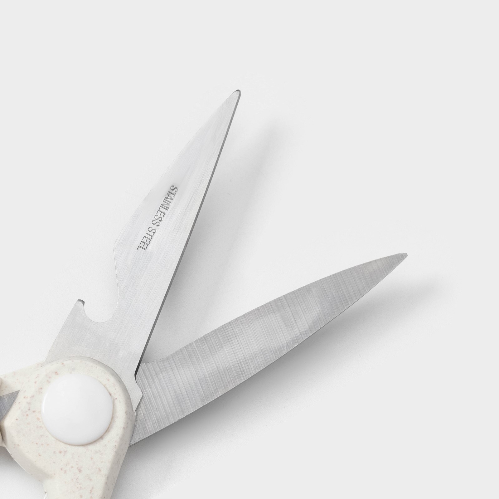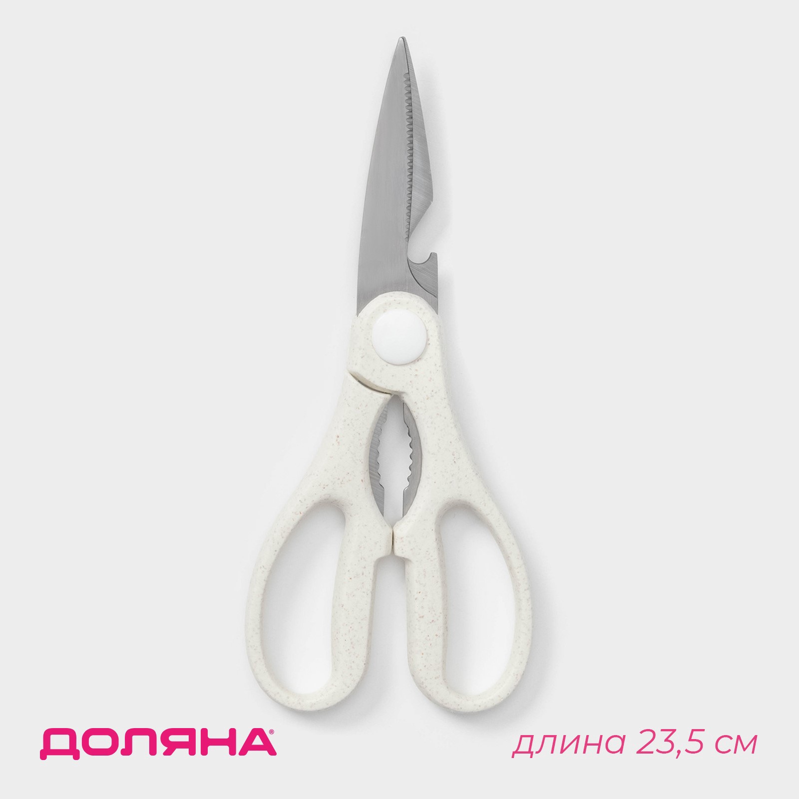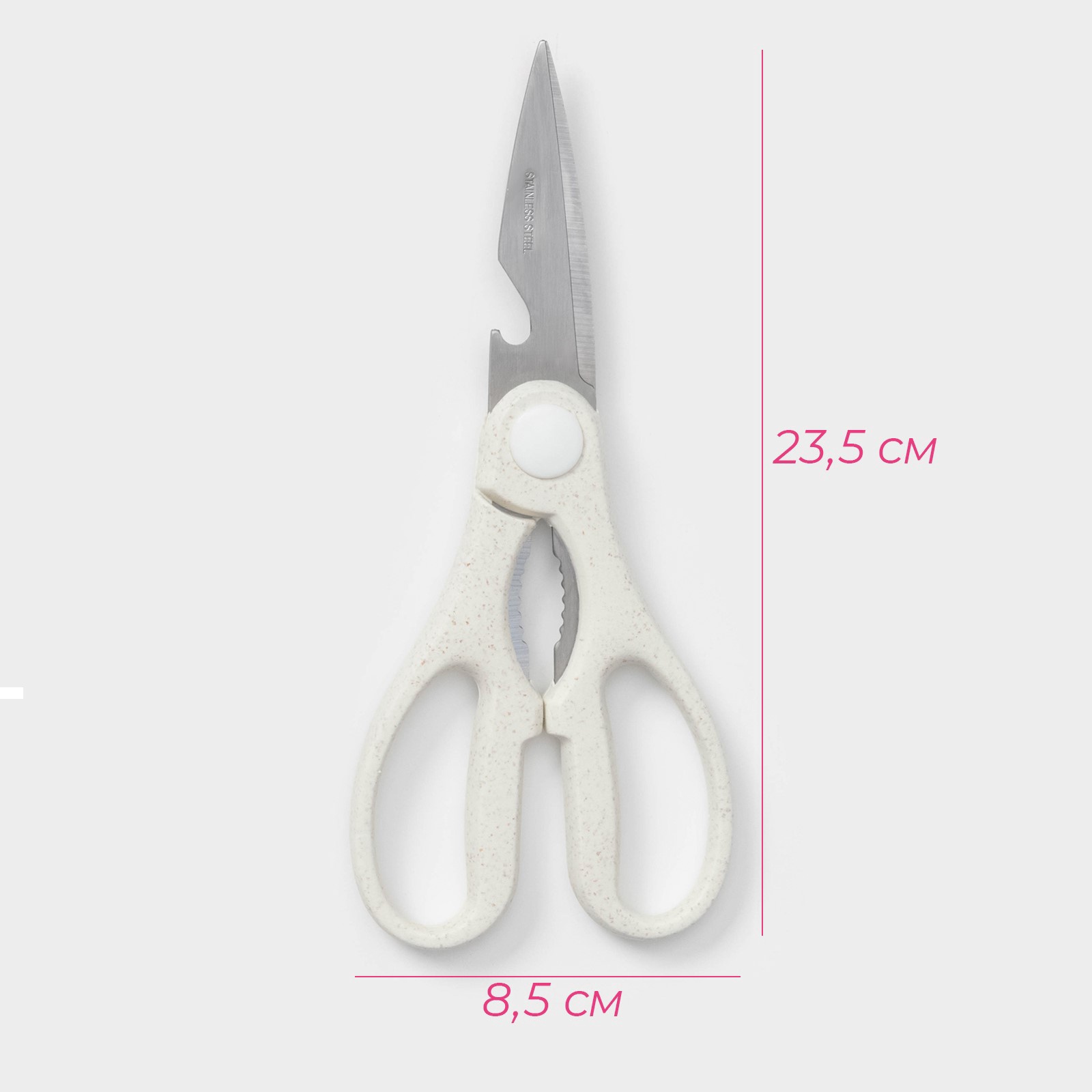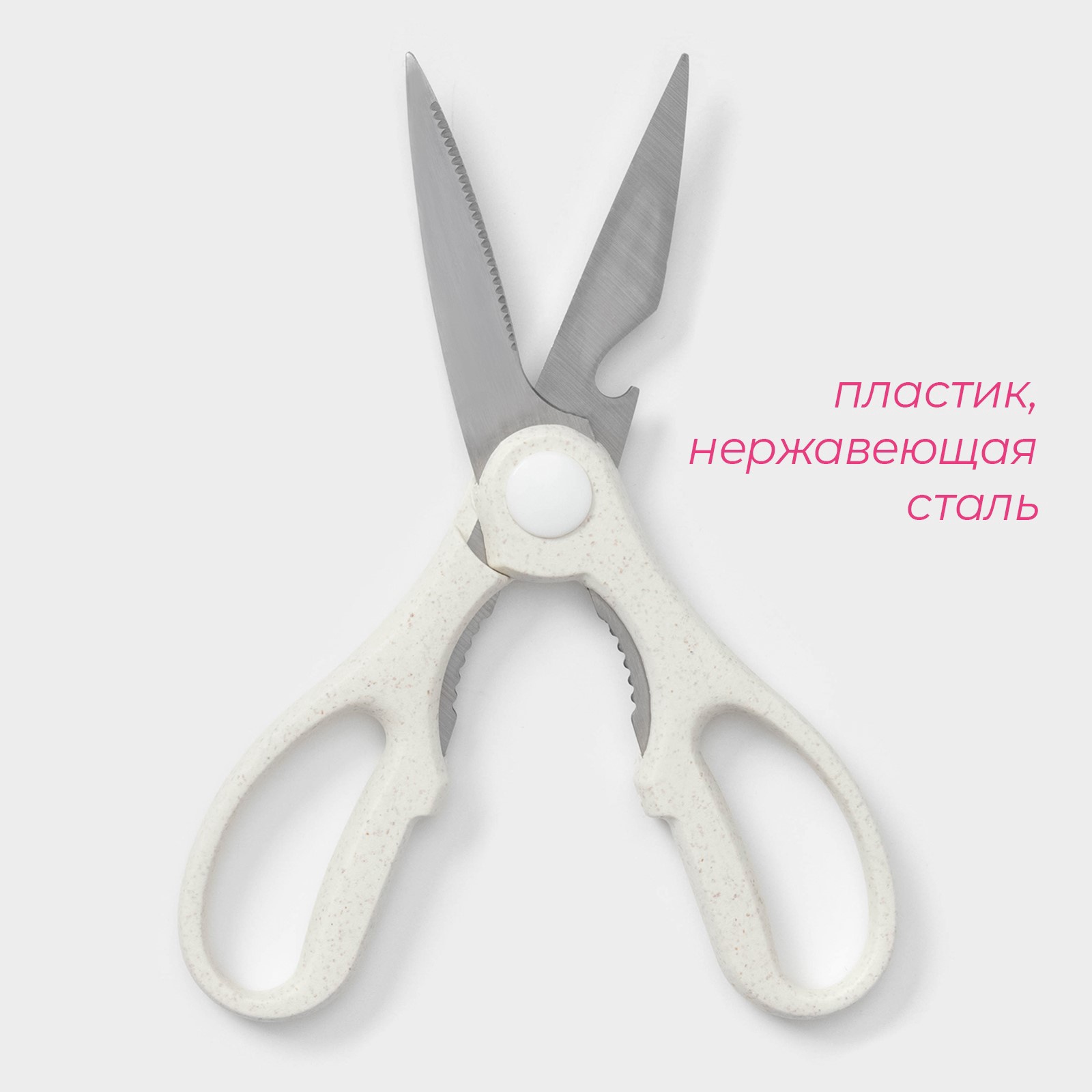 Ножницы кухонные доляна «ринго», цвет белый. Кухонные ножницы «Ринго» - незаменимый помощник на любой кухне. Изготовлены из высококачественной нержавеющей стали, они обеспечивают долговечность и надежность в использовании. Преимущества: Ножницы имеют эргономичные ручки, обеспечивающие удобный и надежный захват при работе. Благодаря острым лезвиям, они легко справляются с нарезкой различных продуктов, от зелени до мяса. Ножницы легко отмываются вручную. После чистки необходимо насухо вытирать лезвия изделия. Эти кухонные ножницы станут отличным подарком для любого любителя готовить, благодаря своему стильному дизайну и высокому качеству исполнения. Они помогут ускорить и упростить процесс приготовления блюд, делая вашу кухню еще более комфортной и функциональной. Цвет: Белый Материал ручки: Пластик Материал: Нержавеющая сталь Тип покрытия: Без покрытия Можно мыть в посудомоечной машине: Нет Назначение: Универсальные  развернуть описание ▼