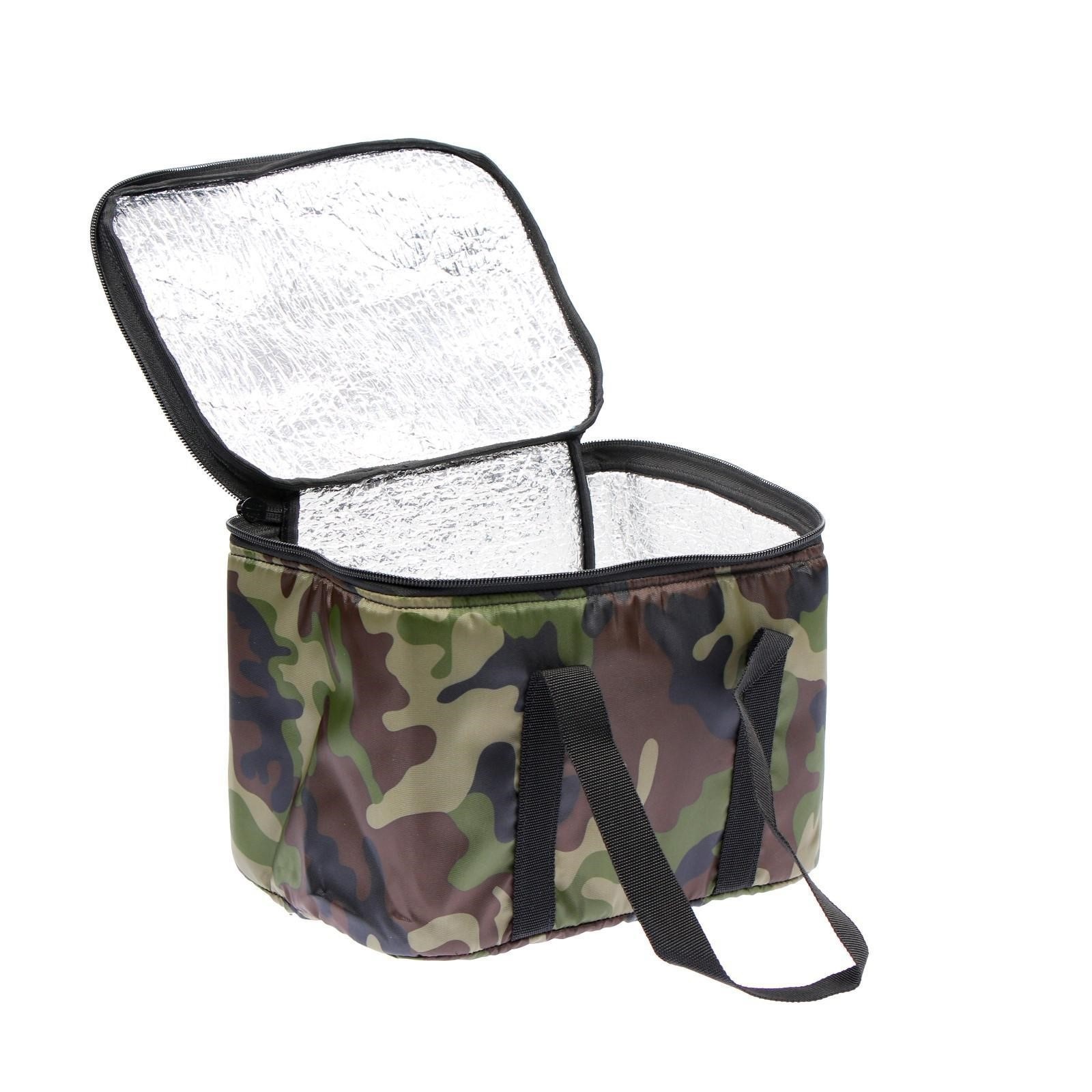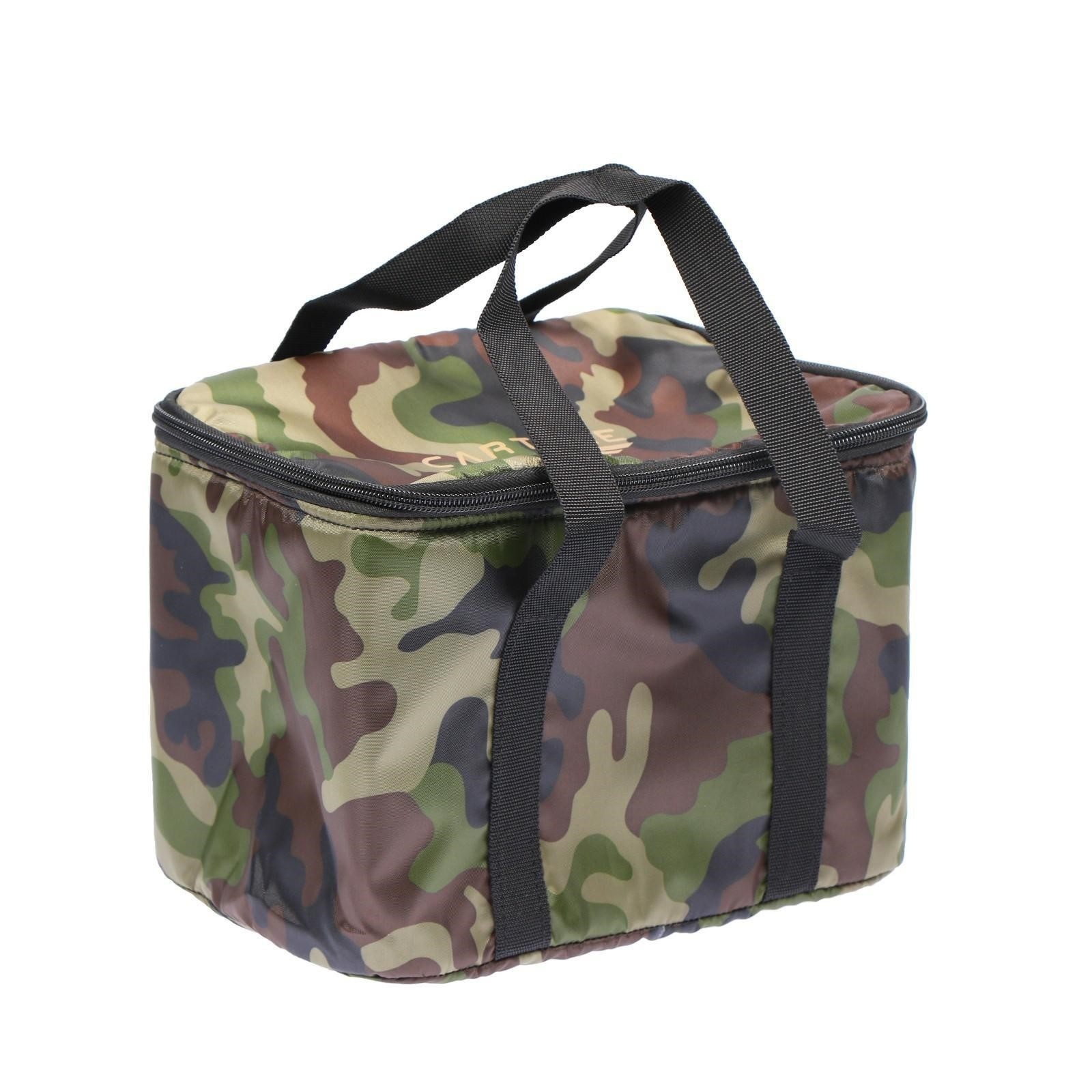 Термосумка cartage т-13, зеленый камуфляж, 10 л, 26х19х19 см. Сохранить продукты свежими, охлажденными или даже замороженными вне дома и без стационарного холодильника можно легко и просто при помощи термосумки Cartage! Термосумка Cartage Т-13 устроена по принципу термоса, причем, такой аксессуар может не только поддерживать низкие температуры, но и сохранить продукты горячими. То есть, вы всегда сможете полакомиться мороженным на пляже, угостить друзей теплой пиццей на пикнике за городом, и пообедать горячим супом на работе. Термосумка устроена очень просто – она имеет внутри изоляционный антибактериальный фольгированный слой, в случае если в сумке разлился напиток, или вытекло варенье, достаточно просто протереть сумку влажной тканью, или антибактериальной салфеткой. Такой сумкой очень удобно пользоваться, если вы ведете активный образ жизни и много времени проводите в дороге и на ногах. Для более долгого сохранения низких температур, советуем использовать аккумуляторы холода. Объём, л: 10 Вид: Термосумка Температурное ограничение: Нет  развернуть описание ▼