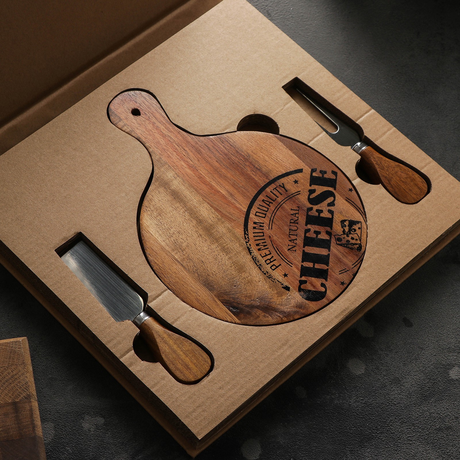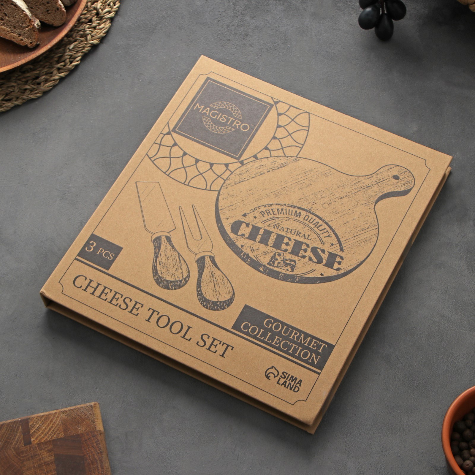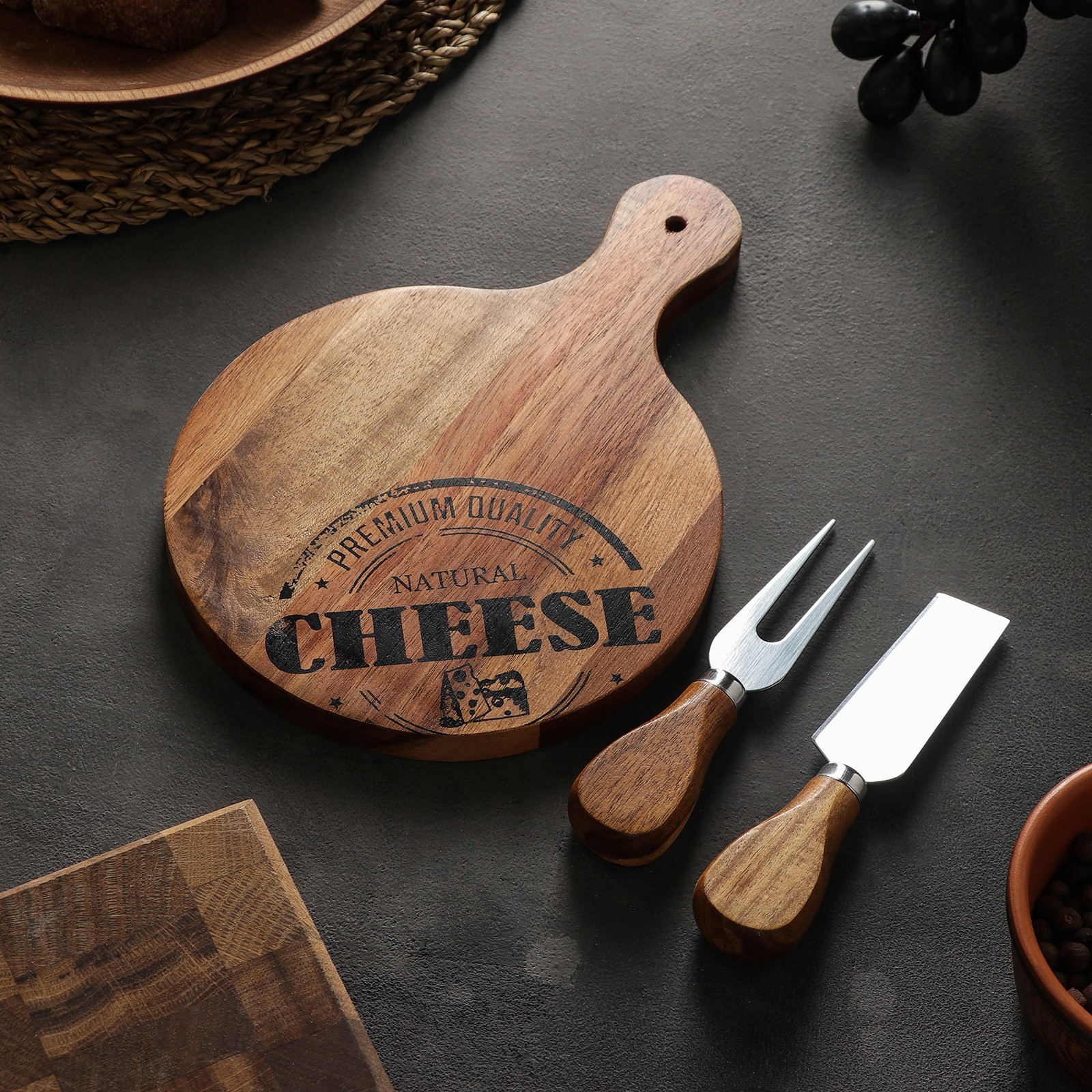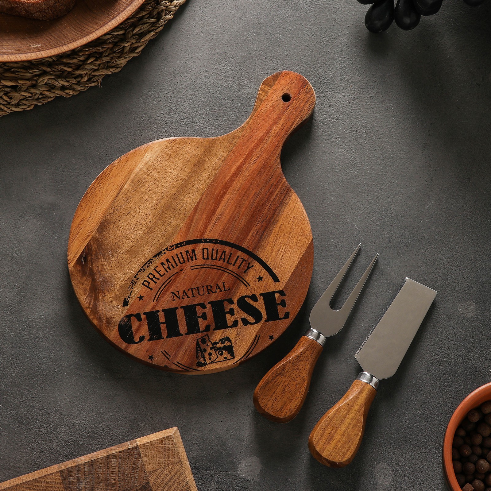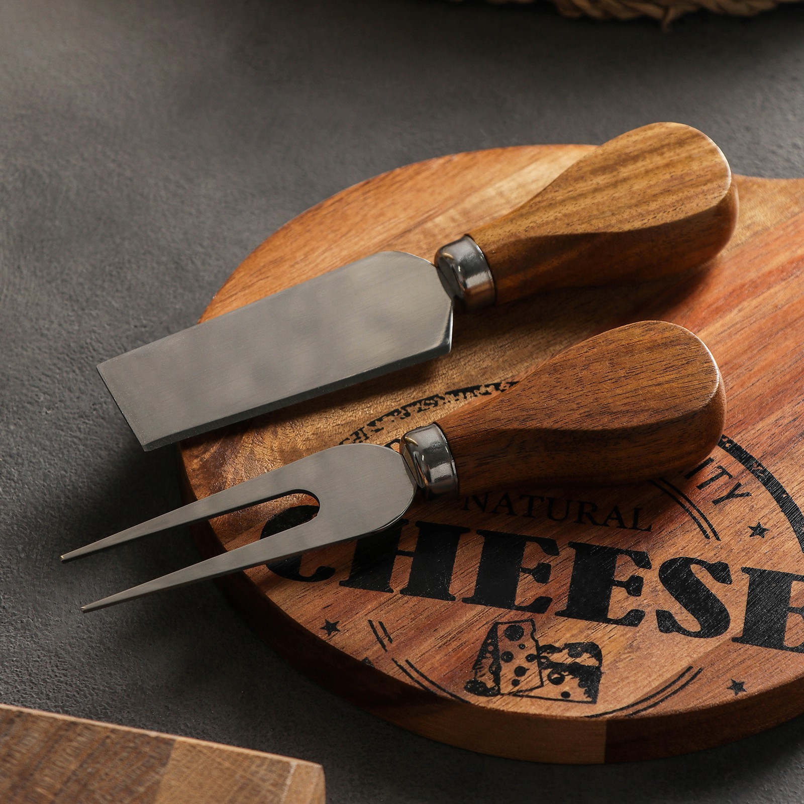 Набор для подачи сыра magistro shape, 2 ножа, доска, акация. Сырное ассорти будет отличным способом порадовать себя и своих близких новыми или уже полюбившимися деликатесами! Правильно и комфортно провести дегустацию сыров, красиво оформить праздничный стол поможет набор ножей для подачи сыра на подставке. Преимущества: Ножи сконструированы с учетом особенностей того или иного сорта: от твёрдого пармезана до мягких сливочных видов. Изделия выполнены из экологичных материалов, они полностью безопасны, не вступают в реакцию с продуктами и не окисляются. Цвет: Бежевый Форма: Круглая Длина, см: 24 Ширина, см: 27 Материал: Нержавеющая сталь Материал: Дерево Можно мыть в посудомоечной машине: Нет  развернуть описание ▼