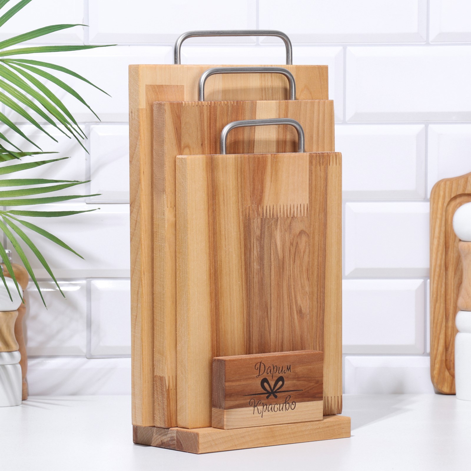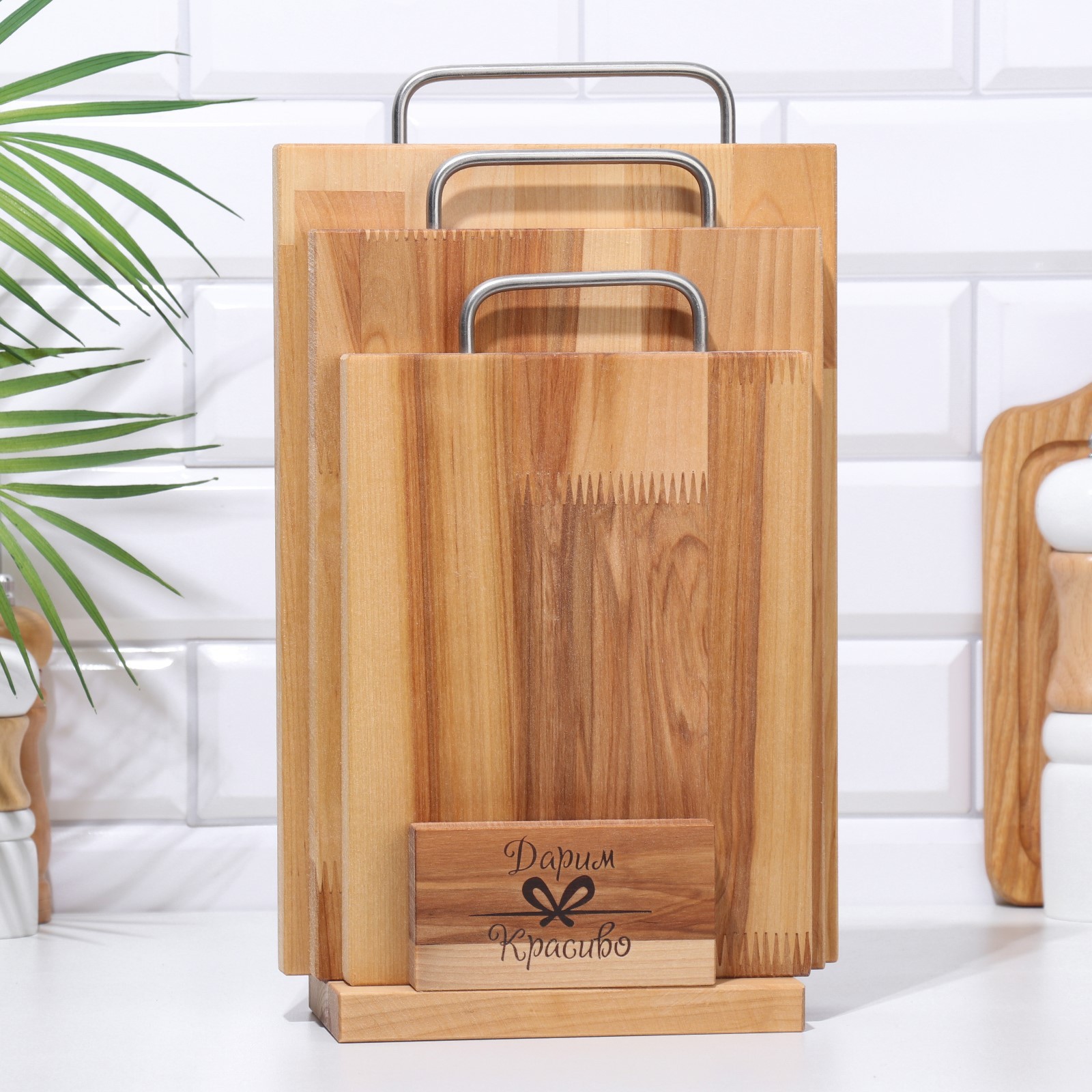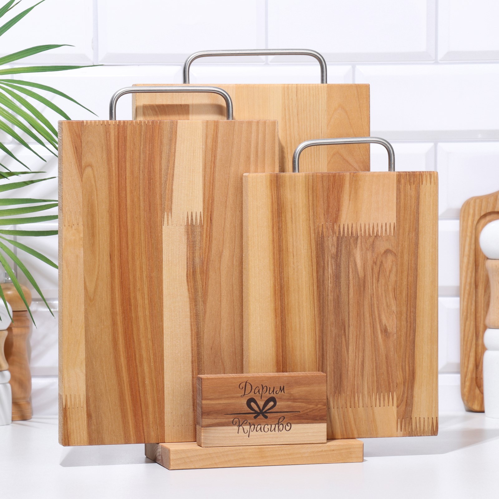 Набор досок разделочных "прямоугольник" 3 шт. метал.ручка 34х22х1,8;31х20х1,8;26х18х1,8 см. Деревянная разделочная доска — это классика, актуальная во все времена. Она не боится воды и имеет длительный срок службы. Подходит для мяса и овощей: продукты на ней не скользят, что значительно облегчает нарезку и обеспечивает безопасность повару. Также изделие почти не тупит ножи. Особенности: легко моется и быстро сушится;удобно хранить, можно подвесить на крючок;безопасный природный материал;невысокая цена. Уход за деревянной посудой: 1. Перед первым использованием ополосните деревянное изделие в тёплой воде без добавления моющих средств. Протрите предмет впитывающей тканью. Оставьте его на 1–2 часа, чтобы испарилась вся влага. 2. Не оставляйте изделие надолго в воде, так как дерево впитывает влагу и по мере высыхания может растрескаться. 3. Храните посуду в месте, куда не попадают солнечные лучи и влага. 4. Мойте посуду только вручную, мягкой губкой с добавлением небольшого количества моющего средства. 5. Не оставляете деревянную посуду грязной или мокрой надолго. 6. После мытья тщательно протрите изделие и высушите в вертикальном положении. Цвет: Бежевый Форма: Прямоугольная Длина, см: 26 Длина, см: 31 Длина, см: 34 Ширина, см: 18 Ширина, см: 20 Ширина, см: 22 В наборе, шт.: 4 Вид дерева: Берёза Материал: Дерево Тип доски: Стандартная Температурное ограничение: Нет Можно мыть в посудомоечной машине: Нет Особенности: На подставке Форма: Прямоугольник  развернуть описание ▼