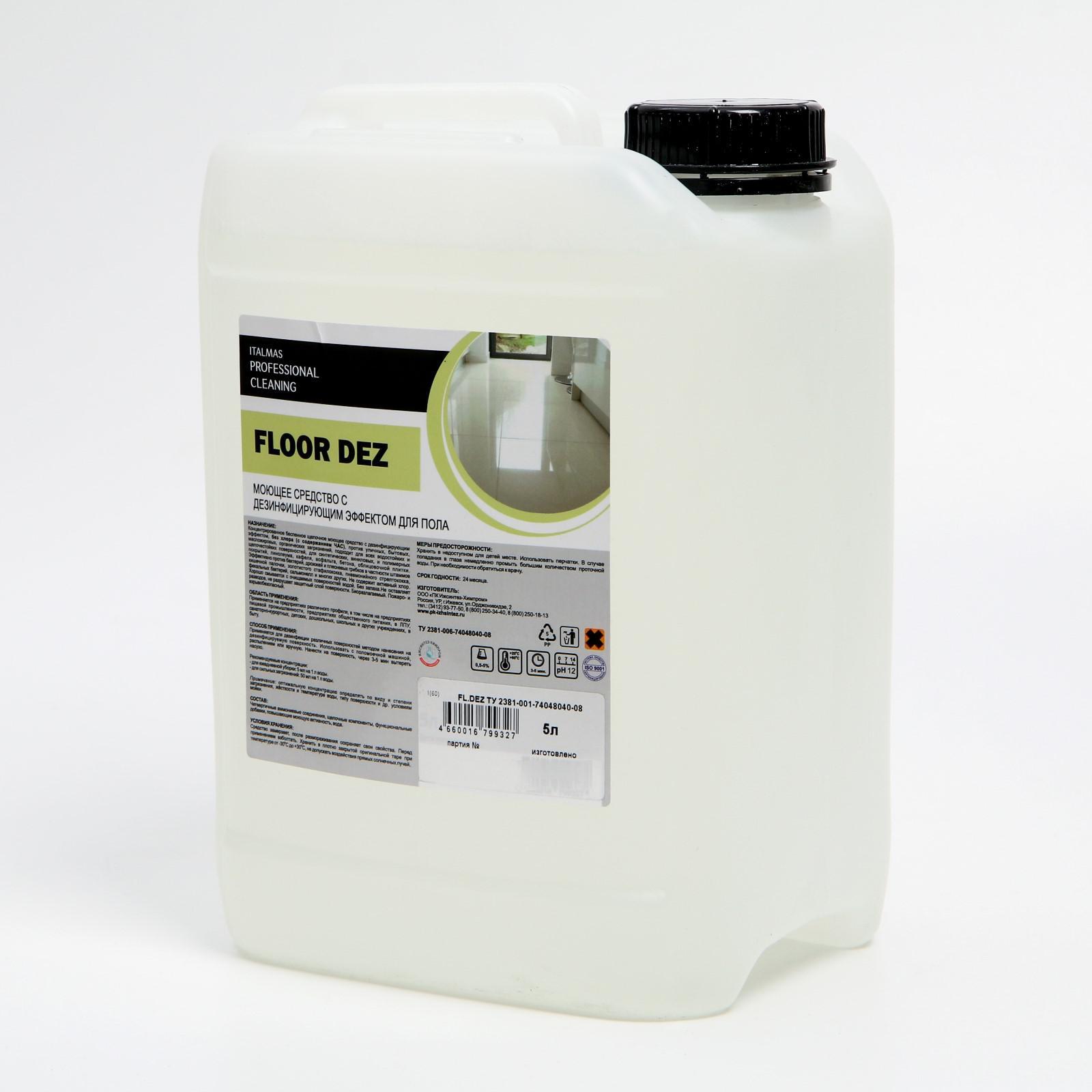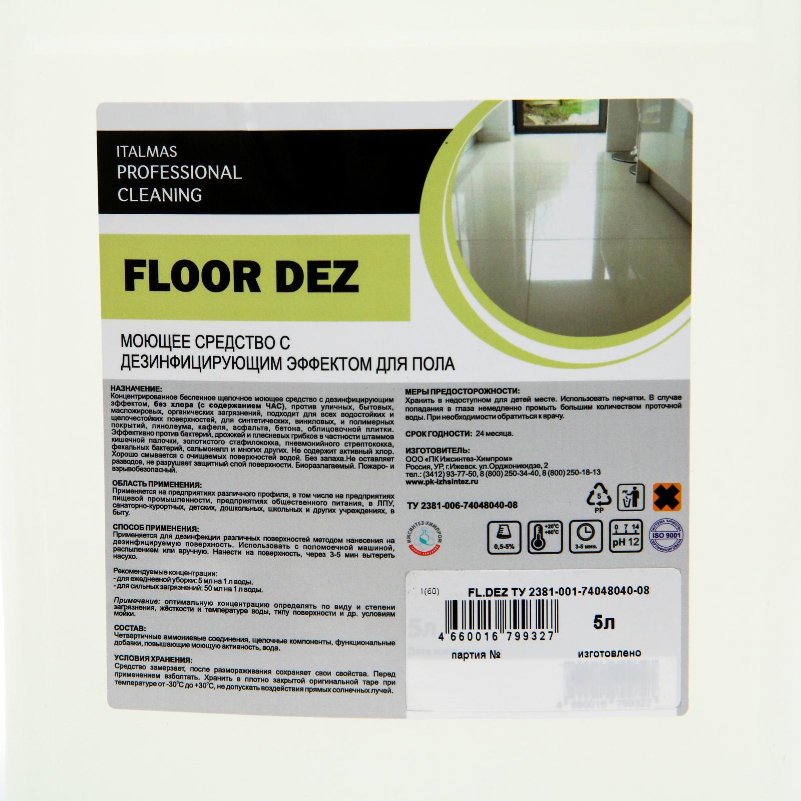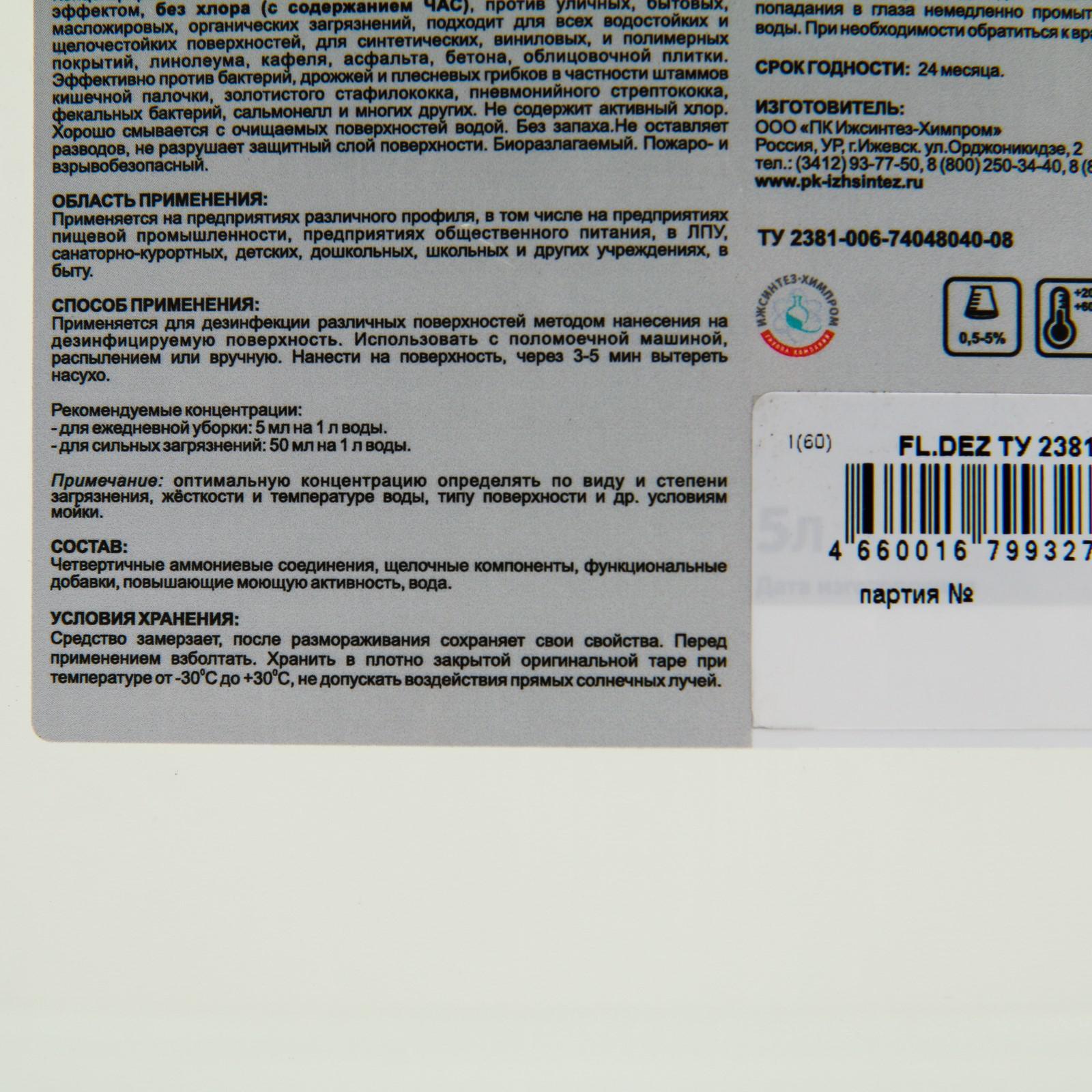 Средство моющее щелочное с дезинфицирующим эффектом для пола ipc floor dez 5 л. Профессиональное моющее средство с дезинфицирующим эффектом для пола. Средство не содержит хлор, в качестве дезинфектанта выступают ЧАС (четвертично-аммониевые соединения). Моющее средство для пола против уличных, бытовых, масложировых, органических загрязнений, подходит для всех водостойких и щелочестойких поверхностей, для синтетических, виниловых, и полимерных покрытий, линолеума, кафеля, асфальта, бетона, облицовочной плитки. Эффективно против бактерий, дрожжей и плесневых грибков в частности штаммов кишечной палочки, золотистого стафилококка, пневмонийного стрептококка, фекальных бактерий, сальмонелл и многих других. Без запаха. Не оставляет разводов, не разрушает защитный слой поверхности. Не образует пену. Средство придает поверхности антистатические свойстваПрименение Нанести на поверхность, через 3-5 мин вытереть насухо. Рекомендуемые концентрации: для ежедневной уборки: 5 мл на 1 л воды. для сильных загрязнений: 50 мл на 1 л воды. Примечание: оптимальную концентрацию определять по виду и степени загрязнения, жёсткости и температуре воды, типу поверхности и др. условиям мойки. Состав: Четвертичные аммониевые соединения, щелочные компоненты, функциональные добавки, повышающие моющую активность, вода. Объём, л: 5 Вес, г/Объём, мл: 5000 Ароматизированные: Нет Температурное ограничение: Нет Вид: Щелочное Особенности: Универсальное Содержание хлора: Нет  развернуть описание ▼