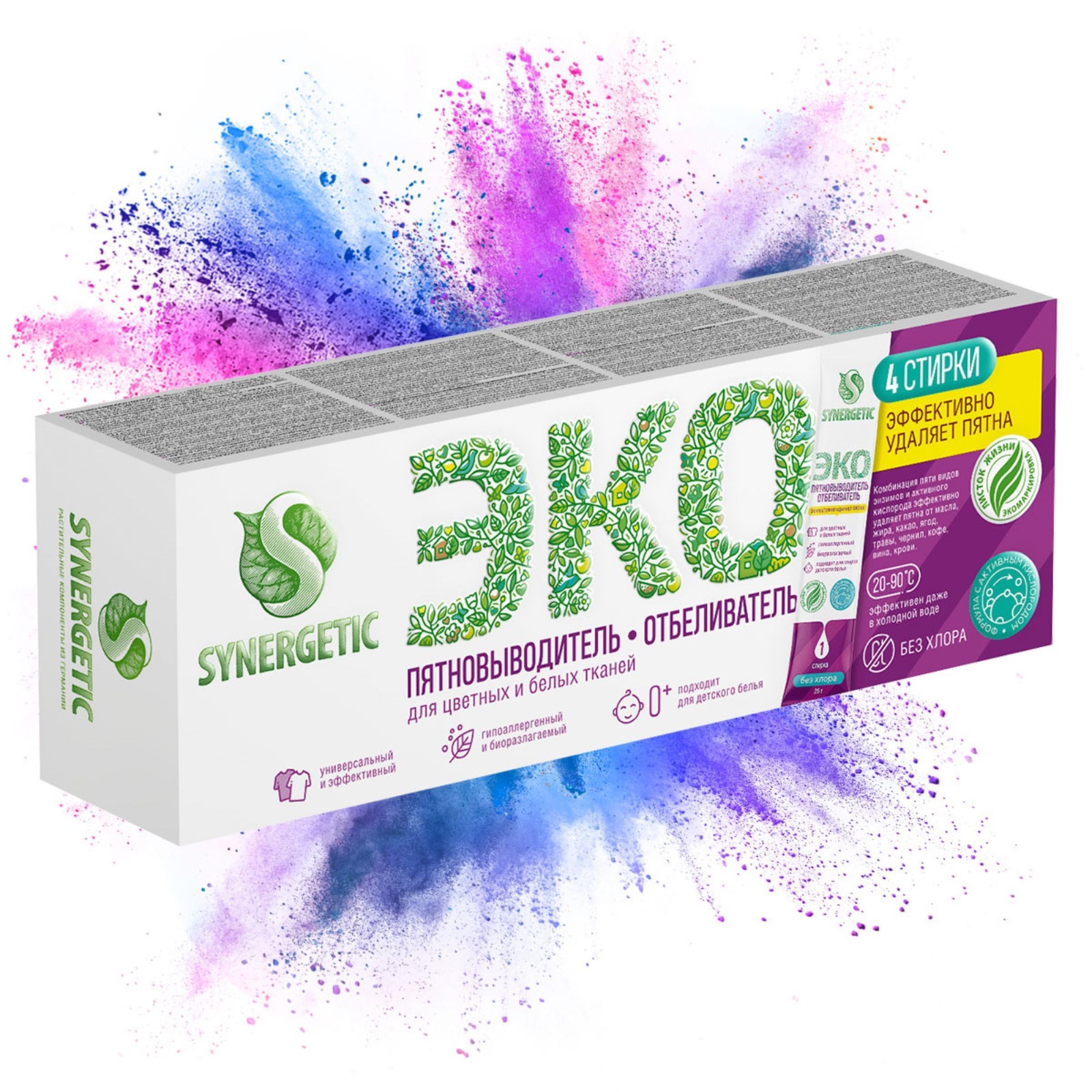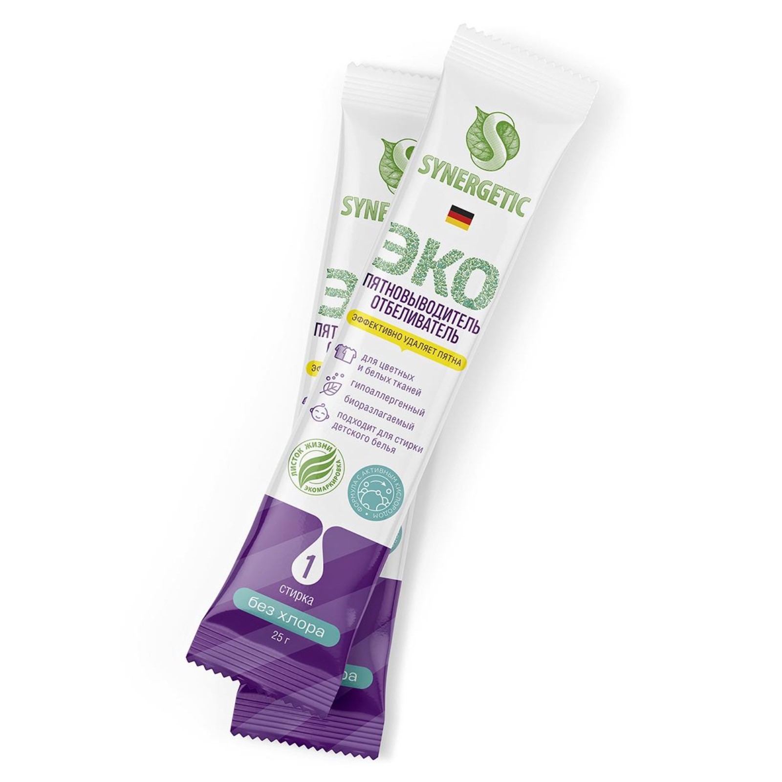 Пятновыводитель-отбеливатель synergetic, порошок,гипоаллергенный, биоразлагаемый 4 стика. Биоразлагаемый гипоаллергенный пятновыводитель-отбеливатель с активным кислородом SYNERGETIC в стиках - универсальное средство для эффективного удаления загрязнений и трудновыводимых пятен с тканей даже в холодной воде. Комбинация энзимов, растительных ПАВ и активного кислорода эффективно удаляет въевшиеся и застарелые пятна от масла, жира, какао, ягод, травы, чернил, кофе, вина, крови на цветном и белом белье из натуральных и синтетических тканей. Гипоаллергенный пятновыводитель подходит для детского белья 0+ и одежды людей с чувствительной кожей. Средство полностью выполаскивается из волокон и не остается на одежде. Подходит для предварительной обработки пятен, замачивания белья, ручной и машинной стирки. Может использоваться как усилитель моющих средств и отбеливатель в автоматических стиральных машинах всех типов. Экономичный и практичный формат стика удобен не только при использовании дома, но и для путешествий любым видом транспорта. Соблюдайте рекомендации, указанные на ярлыке изделия. Аккуратно оторвите край стика и используйте пятновыводитель по назначению. Стирка в стиральной машине: для увеличения эффективности моющего средства, отбеливания или выведения пятен без предварительной обработки добавьте 1 стик пятновыводителя на 5 кг белья/10 л воды в отсек стиральной машины, предназначенный для моющего средства (если иное не прописано в инструкции для стиральной машины), для стирки сильно загрязнённого белья используйте 2 стика пятновыводителя. Замачивание: для удаления трудновыводимых пятен полностью растворите пятновыводитель из 1 стика в одном литре воды температурой 40 °C (для сильно загрязнённого белья используйте 2 стика), затем положите бельё на 30 - 60 минут и постирайте. Максимальное время замачивания цветного белья составляет 1 час, белого белья - 5 часов. Предварительная обработка пятен: разбавьте средство водой (1 часть средства на 3 части воды температурой не более 40 °C), вотрите раствор в пятно и оставьте на 10 минут, затем постирайте. Соблюдайте режим стирки, указанный на ярлыке изделия. Перед применением проверьте устойчивость окраски ткани, используя средство на незаметном участке, прополощите и дайте высохнуть. Новые, а также белые и цветные вещи стирайте отдельно, если степень устойчивости окраски ткани не известна. Не используйте для изделий из шерсти, шелка и кожи, деликатных и мембранных тканей. Избегайте слишком долгого замачивания во избежание изменения цвета окрашенных тканей и попадания пятновыводителя на металлические детали одежды. Не рекомендуется оставлять предварительно обработанное белье под прямыми солнечными лучами и у источников тепла. Стирайте цветные вещи при температуре не выше 40 °C. Хранить отдельно от пищевых продуктов, в местах, недоступных для детей и животных. Избегать попадания в глаза, рот и на повреждённые участки кожи. В случае попадания обильно промыть водой и обратиться за медицинской помощью. Использовать строго по назначению. Состав: Подготовленная вода > 30%; комплекс А-тензидов (анионные ПАВ из растительного масла) 5-15%; Амф-тензид (амфотерный ПАВ из растительного масла) 5-15%; комплекс Н-тензидов (неионогенные ПАВ из растительного масла) < 5%; растительный полимер < 5%; растительные эн
