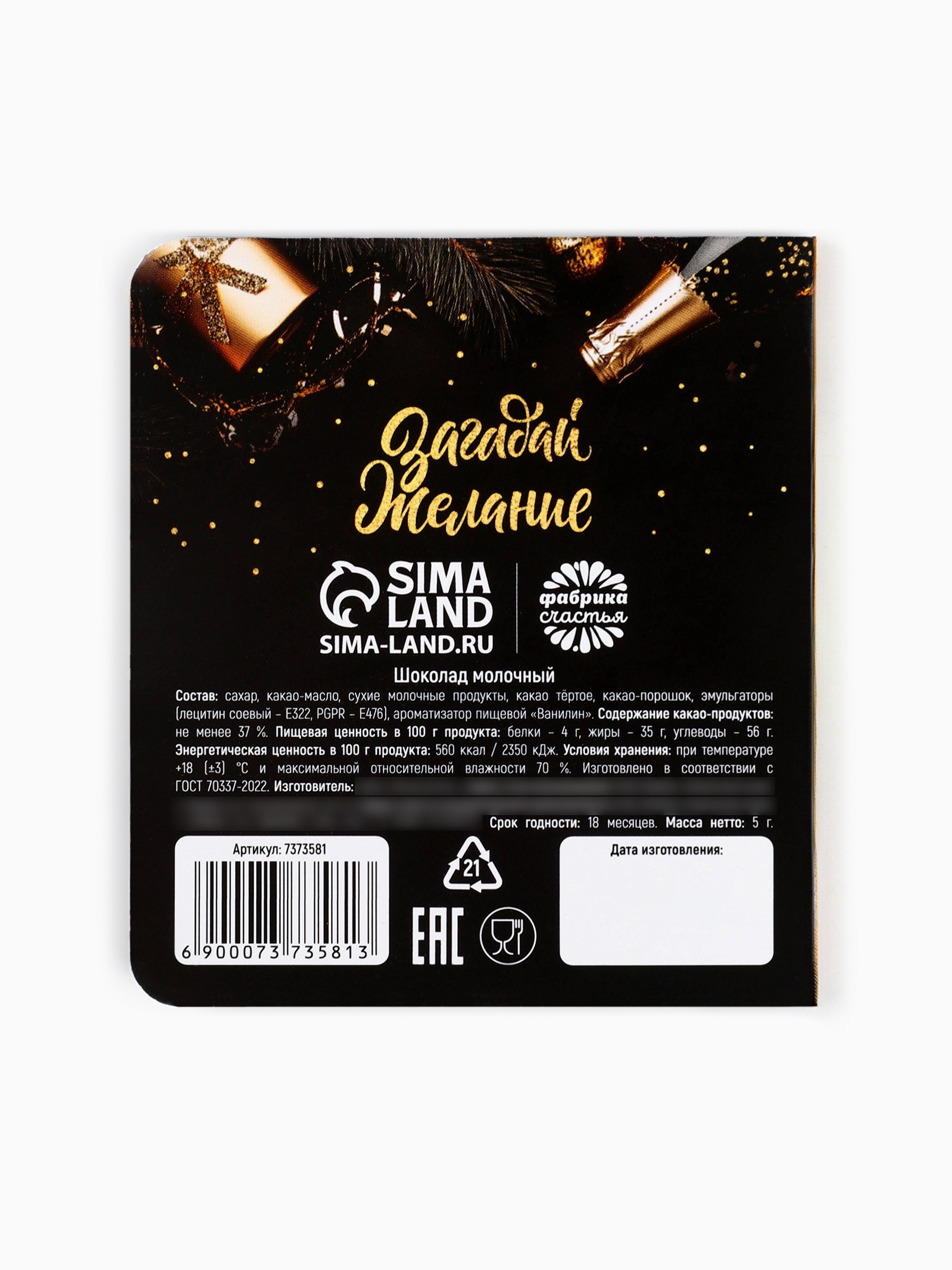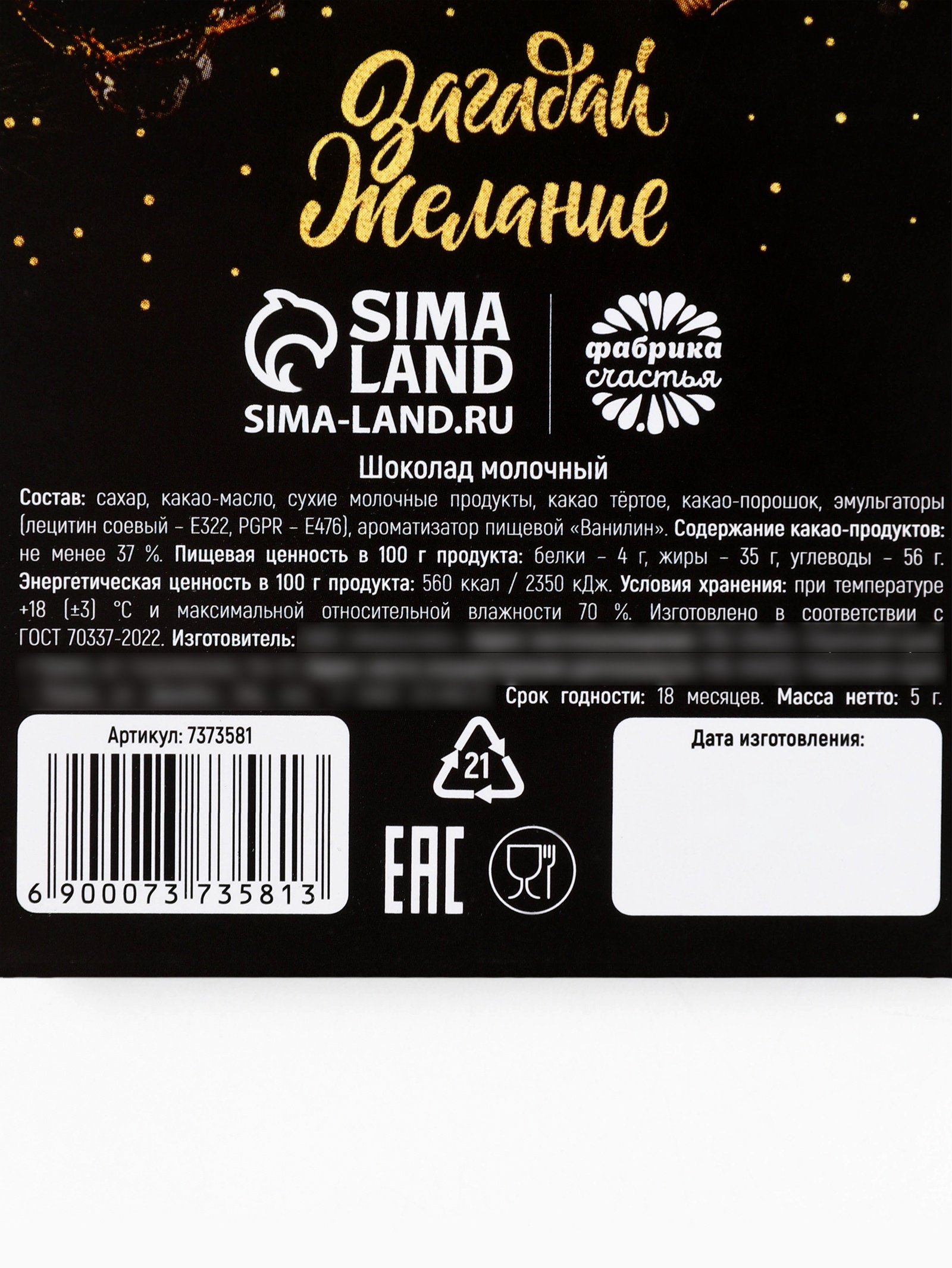 Шоколад молочный в открытке «счастливого нового года», 5 г. Шоколадная открытка – необычный и оригинальный способ поздравить с Новым годом! В ассортименте представлены интересные, забавные пожелания на любой вкус. Внутри каждой открытки вы найдёте маленькую шоколадку из настоящего шоколада высокого качества от российских и бельгийских производителей. Благодаря качественному составу, ваш сюрприз будет не только красивым, но и действительно вкусным! Состав: какао тёртое, какао-масло, сахар, молоко сухое цельное, эмульгатор соевый лецитин, ароматизатор «Ванилин». Вес нетто, г:5|Белки, г:5.5|Жиры, г:35|Углеводы, г:53|Энергетическая ценность, ккал:560|Тематика:Новогодняя|Символ года:Нет|Тематика праздника:Новый год|Форма:Мини-плитка|Темпер. ограничение НЕ НИЖЕ :-3|Темпер. ограничение НЕ ВЫШЕ :+18|Вид шоколада:Молочный|Добавки:Без добавок|Страна:Россия  развернуть описание ▼
