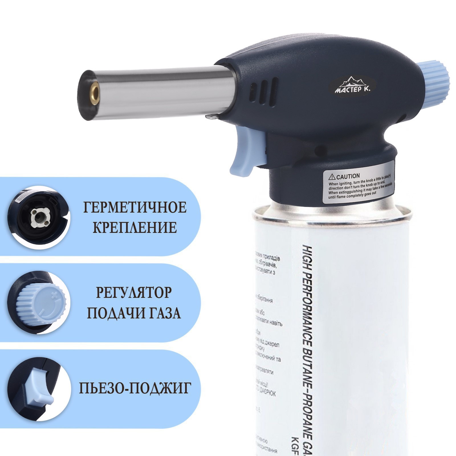 Горелка газовая на баллон «мастер к» 915, с пьезоподжигом, 17.5 6.5 см. Газовая горелка — насадка с пьезоподжигом — незаменимое приспособление в быту, для дома и дачи. Благодаря наличию пьезоподжига, горелка быстро зажигается в любых условиях и при любой погоде, имеет керамическое сопло, которое увеличивает срок службы туристической газовой горелки. Рекомендуется использовать для розжига дров и углей в мангалах, грилях, каминах и печах, пайки различных изделий, для работы с термоусаживаемыми трубками, муфтами; для плавления и сварки различных изделий из металла и пластика; удаления краски; обработки поверхностей на производстве и в лабораторных условиях; для разморозки замков, водопроводных труб, для придания поверхностям деревянных изделий декоративного вида. Диаметр сопла 2 см Тип захвата:Цанговый|Пьезоподжиг:Да|Тип:Горелка|Страна:Китай  развернуть описание ▼