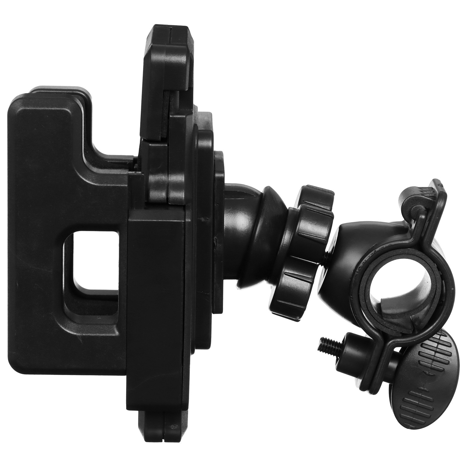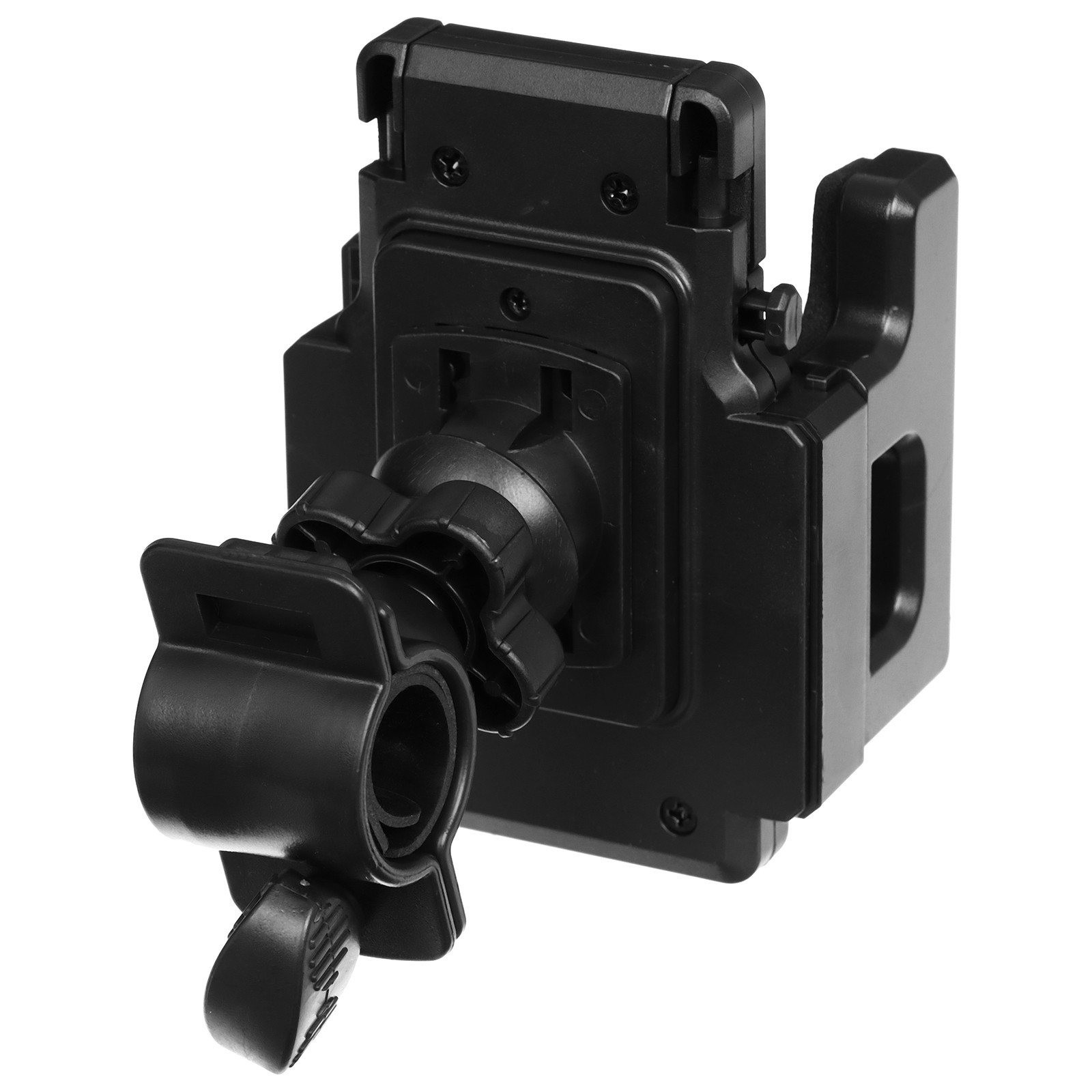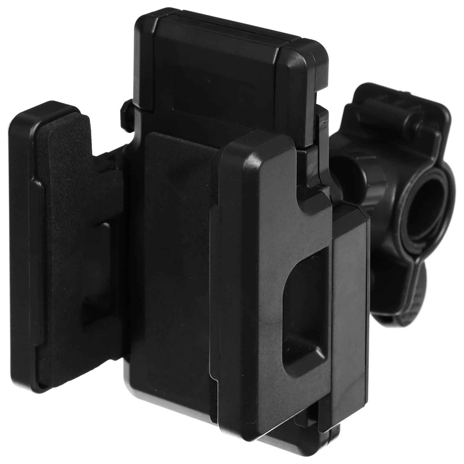 Держатель для телефона. Держатель подходит для установки на руль велосипеда, самоката, детской коляски. Кронштейн крепления на самом руле регулируется от 13 до 30 мм. Содержит уплотнительные резиновые прокладки для разных диаметров рулевой трубы. Для крепления смартфона держатель имеет на задней части две гайки: верхняя — для фиксации нижней гайки, нижняя двигает лапки держателя. Цвет: Чёрный Материал: Пластик  развернуть описание ▼