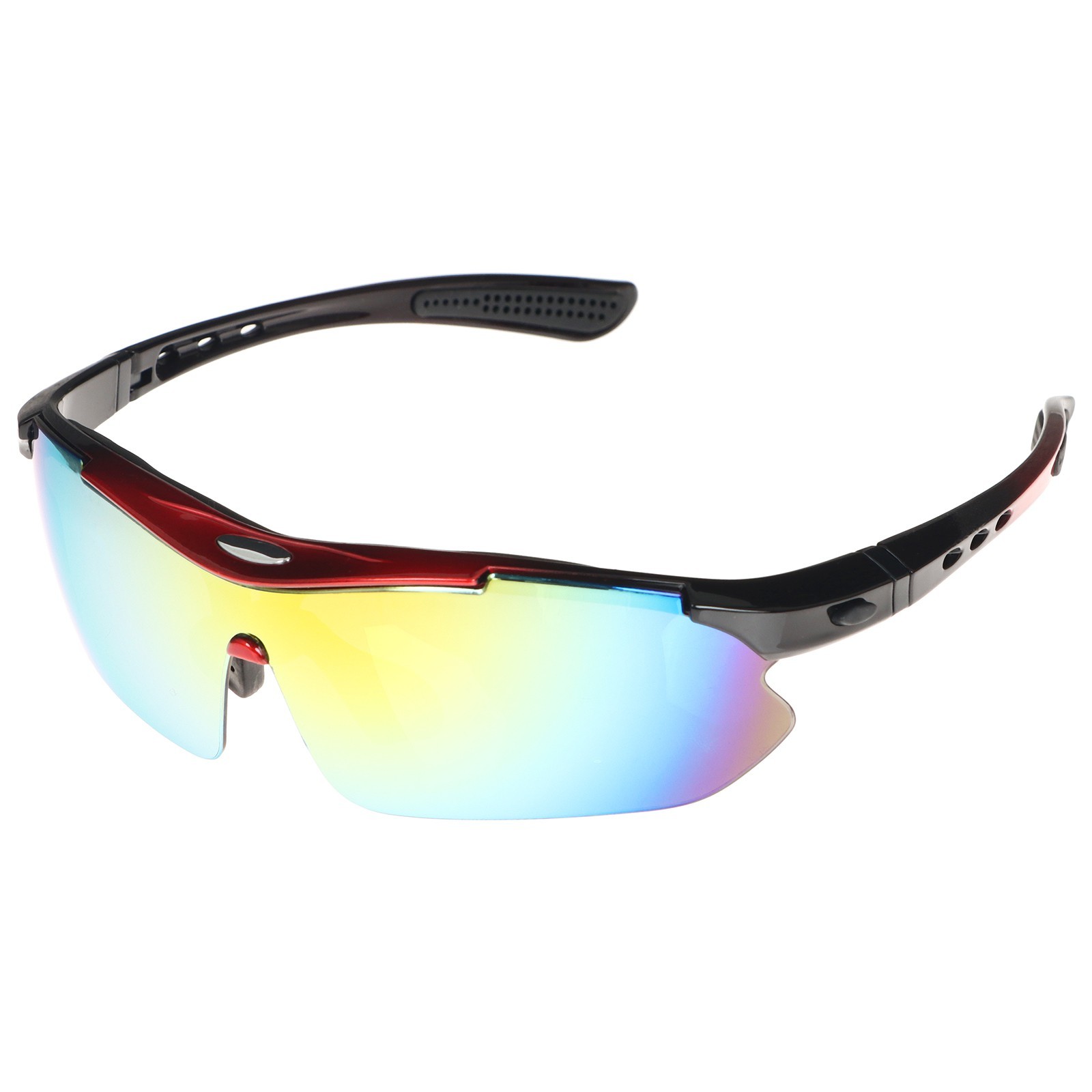 Очки велосипедные со сменными линзами в кейсе, цвет красный. Велосипедные солнцезащитные очки оснащены пятью сменными небьющимися линзами для обеспечения оптической чёткости днём или ночью. В комплект входит чехол из микроволокна и футляр на молнии с внешними отделениями для хранения сменных линз. Для кого: Унисекс Материал: Стекло Материал: Пластик Цвет линз: Хамелеон Градиент: Да Поляризация очков: Да  развернуть описание ▼
