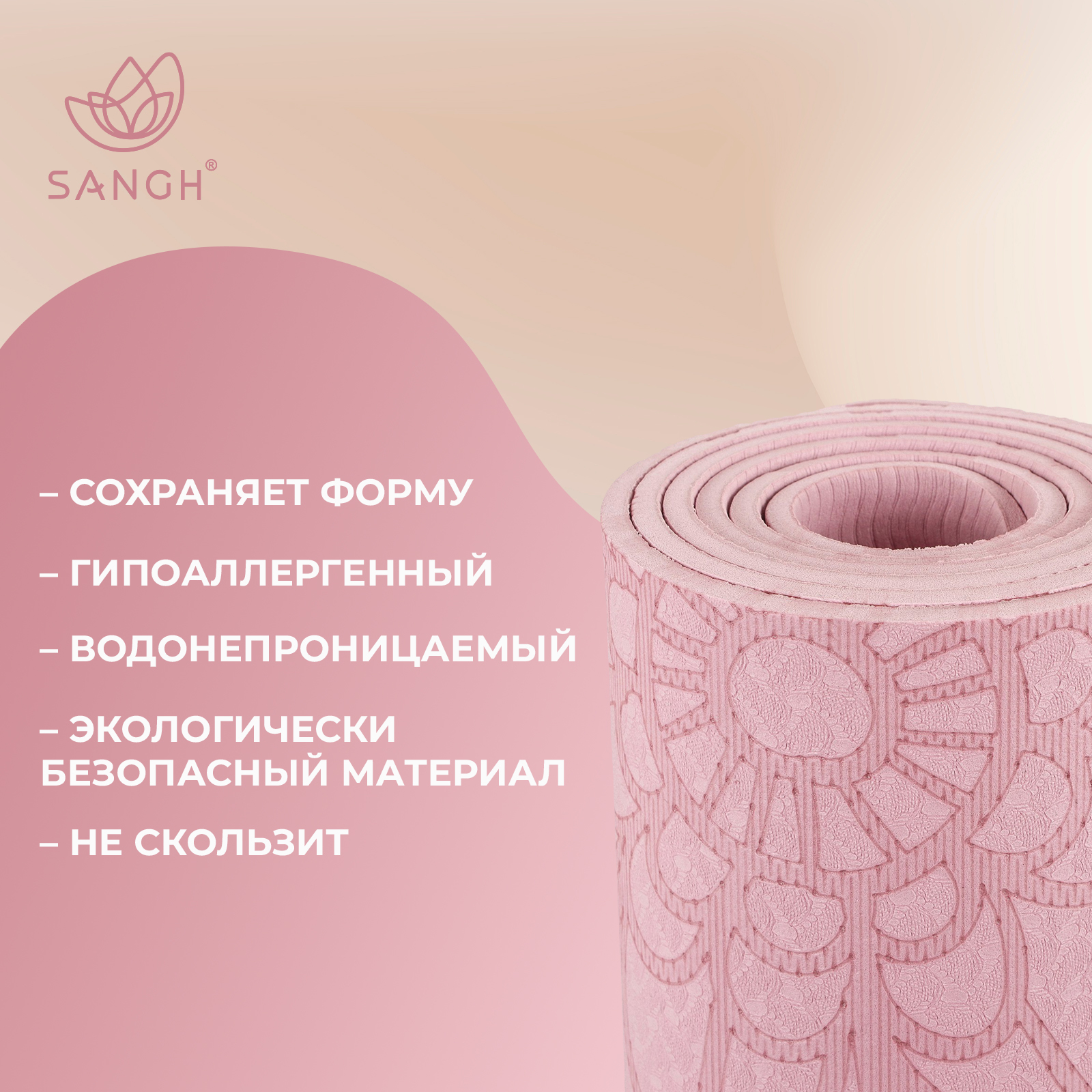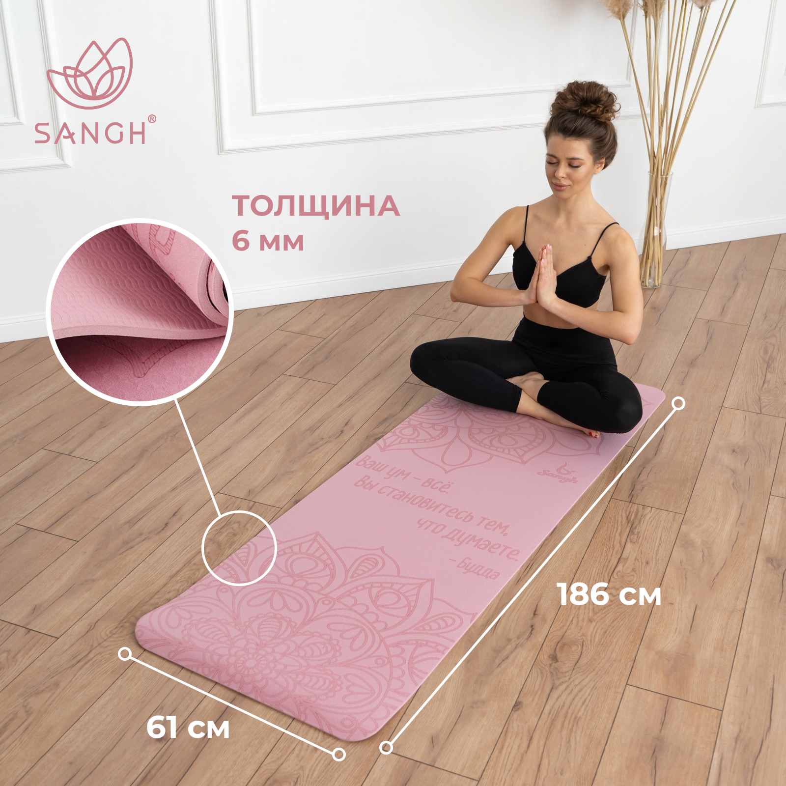 Коврик для йоги sangh «будда», 183х61х0,6 см, цвет пастельный розовый. Коврик подходит для занятий йогой и фитнесом дома и в спортивных залах. Помогает в выполнении асан или других упражнений. Смягчает упор тела на твёрдую поверхность. Сохраняет форму после выполнения упражнений. Цвет: Розовый Длина, см: 183 Ширина, см: 61 Толщина, мм: 6 Возраст: Взрослый Материал: Термопластичный эластомер Особенности: Водоотталкивающий Особенности: Нескользящий Особенности: Эластичный Вид: Классический  развернуть описание ▼