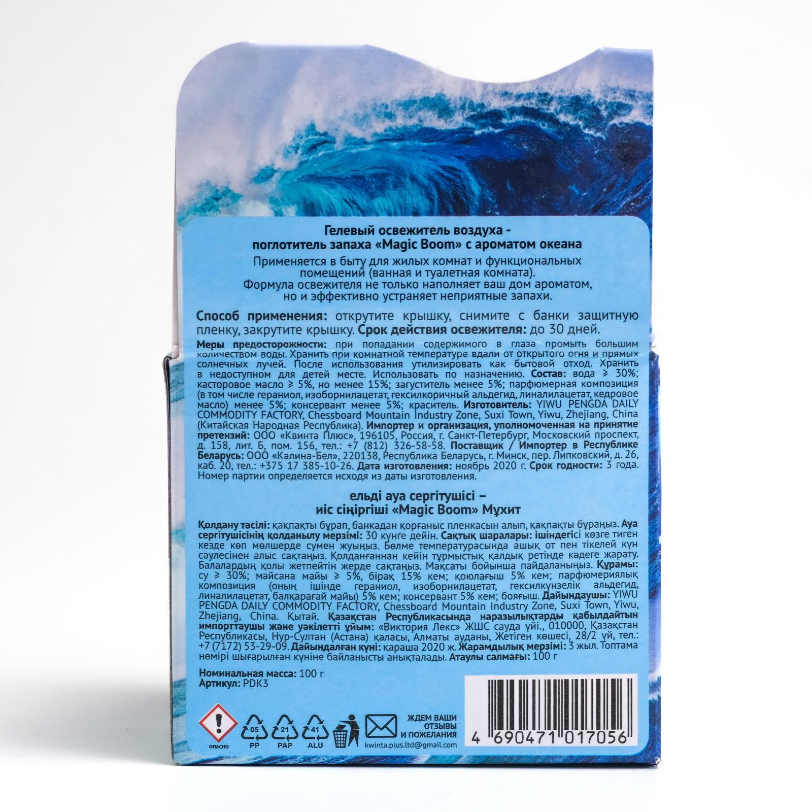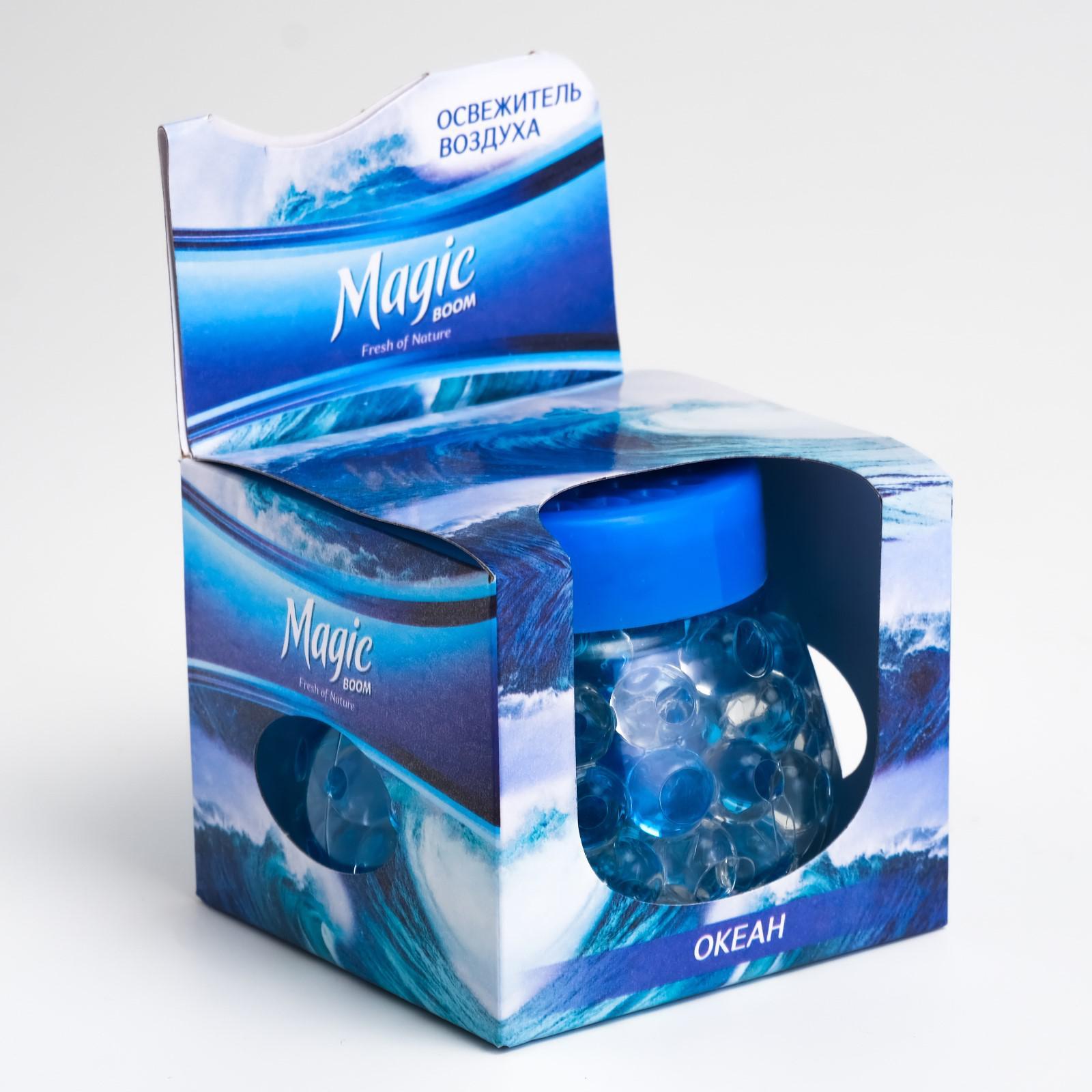 Освежитель воздуха magic boom, гелевый "океан" 100 г. Гелевый освежитель воздуха - поглотитель запаха «Мадс Воот» с ароматом океан. Применяется в быту для жилых комнат и функциональных помещений (ванная и туалетная комната). Формула освежителя не только наполняет ваш дом ароматом, но и эффективно устраняет неприятные запахи. Способ применения: открутите крышку, снимите с банки защитную пленку, закрутите крышку. Срок действия освежителя: до 30 дней. Меры предосторожности: при попадании содержимого в глаза промыть большим количеством воды. Хранить при комнатной температуре вдали от открытого огня и прямыхсолнечных лучей. После использования утилизировать как бытовой отход. Хранить в недоступном для детей месте. Использовать по назначению. Состав: вода > 30%; касторовое масло > 5%, но менее 15%; загуститель менее 5%; парфюмерная композиция (в том числе гераниол, изоборнилацетат, гексилкоричный альдегид, линалилацетат, кедровое 5%; консервант менее 5%; краситель. Объём, мл: 100 Аромат: Океанская свежесть Форма выпуска: Капсулы Принцип работы: Автоматический Температурное ограничение: Нет Тип: Освежитель воздуха  развернуть описание ▼