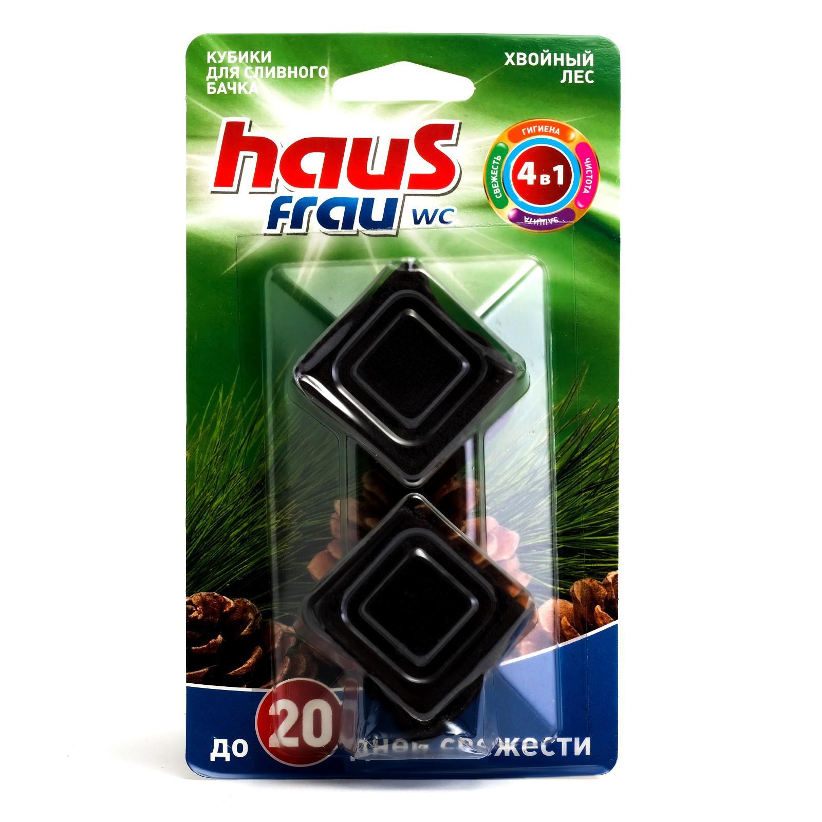 Чистящий кубик для унитазов haus frau, "хвойный лес" 40 г, 2 шт.. Део-блок для унитаза обеспечивает гигиеническую чистоту и свежесть в Вашем туалете. Подкрашивает воду и создает пену. Предотвращает образование отложений и ржавчины, обеззараживает и очищает труднодоступные места. Даже слабое окрашивание сливной воды свидетельствует об эффективной работе кубика. Способ применения: извлеките кубик из упаковки, выдавив его через надрез на картоне. Опустите кубик в бачок с водой так, чтобы он находился на противоположной стороне от отверстия для подачи воды. Через несколько минут вода окрасится, что свидетельствует о начале работы кубика. Меры предосторожности: беречь от детей! Храните средство в местах, недоступных для детей и домашних животных. Использовать перчатки. Внимание! При попадании средства в глаза тщательно промойте большим количеством воды. При случайном попадании в организм немедленно обратитесь к врачу, показав данную этикетку. Хранить в сухом месте вдали от источников открытого огня, в закрытом виде, беречь от влаги и от попадания прямых солнечных лучей, хранить при температуре от -35°С до +35°С. Состав: 15% или более, но менее 30% анионных ПАВ; менее 5% неионогенных ПАВ; менее 5% ароматизирующих добавок; соли органических и неорганических кислот, краситель. Аромат: Хвойный лес Температурное ограничение: Нет Вид средства: Таблетка  развернуть описание ▼