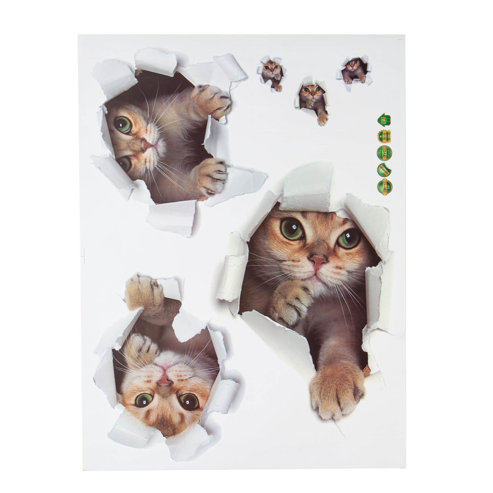 Наклейка 3д интерьерная кошки 60*45см.   Самоклеющиеся 3D панели станут отличным вариантом в оформлении интерьера дома, делая его веселее. Панели просты в использовании: достаточно просто удалить защитный слой на обратной стороне и ровно прижать её к поверхности. Главное в этом процессе не допустить образования воздушных пузырей. Для этого нужно будет прикатать поверхность пластиковым шпателем, выдавливая воздух изнутри.  Правила поклейки: Основание должно быть чистым, ровным и гладким. Перед работой нужно вымыть и обезжирить предполагаемое место нанесения. Нельзя производить поклейку на стыках плитки, и других неровностях. В этих местах панели быстро придут в негодность. Оптимальным основанием для поклейки являются лакированные и глянцевые поверхности, ламинат, крупная плитка или керамогранит. Линолеум лучше не использовать в качестве основания, так как он имеет мягкую поверхность из-за подложки и будет прогибаться при нагрузке.  Размер, м: 0.6 х 0.45 Цвет: Разноцветный parts count: 0 Тематика: Животный мир Тематика: 3D-эффект Материал: Пластик Вид наклейки: Для ванной Вид наклейки: Интерьерная  развернуть описание ▼