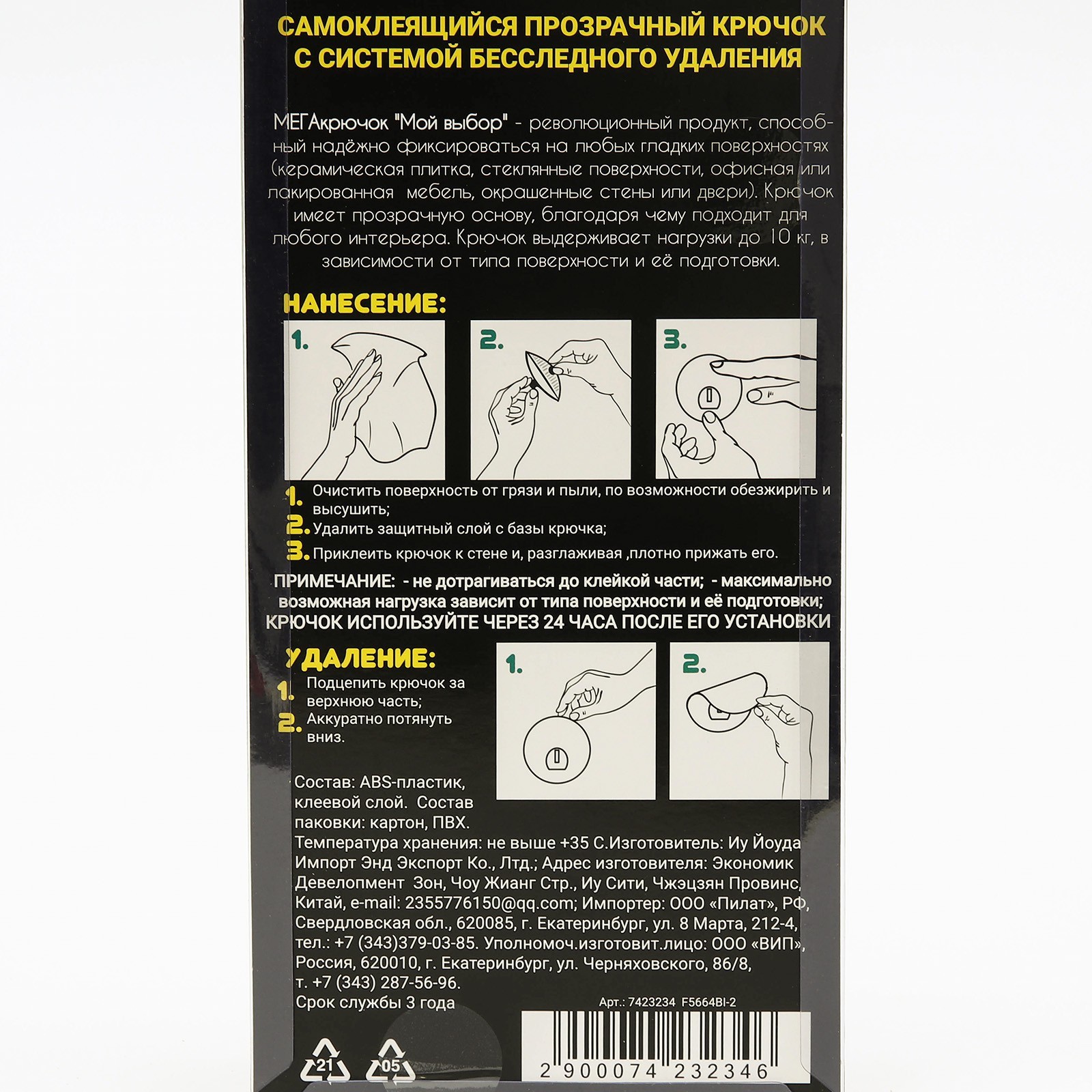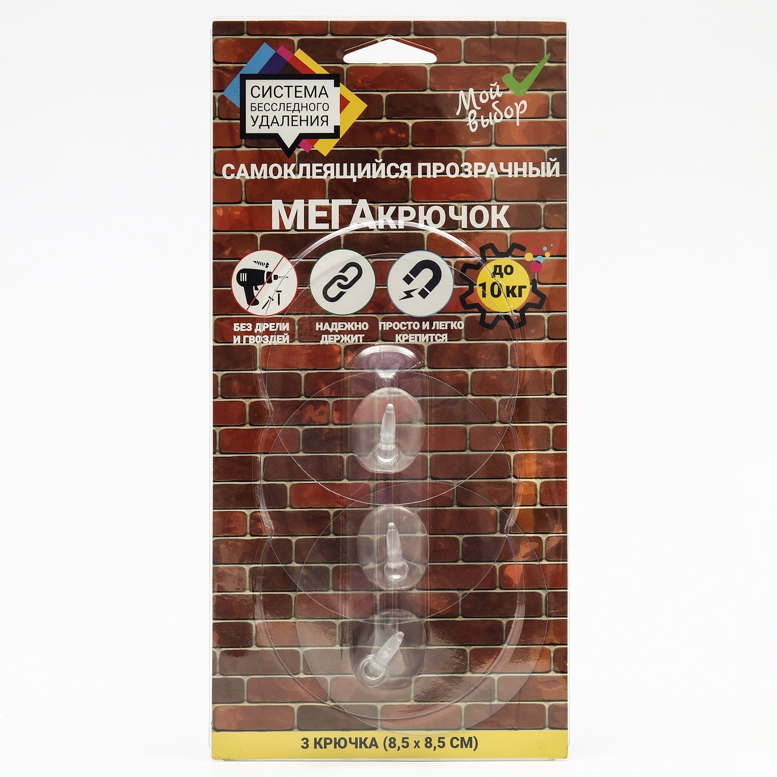 Самоклеящийся прозрачный крючок с системой бесследного удаления 8,5*8,5 см, до 10 кг, 3 шт