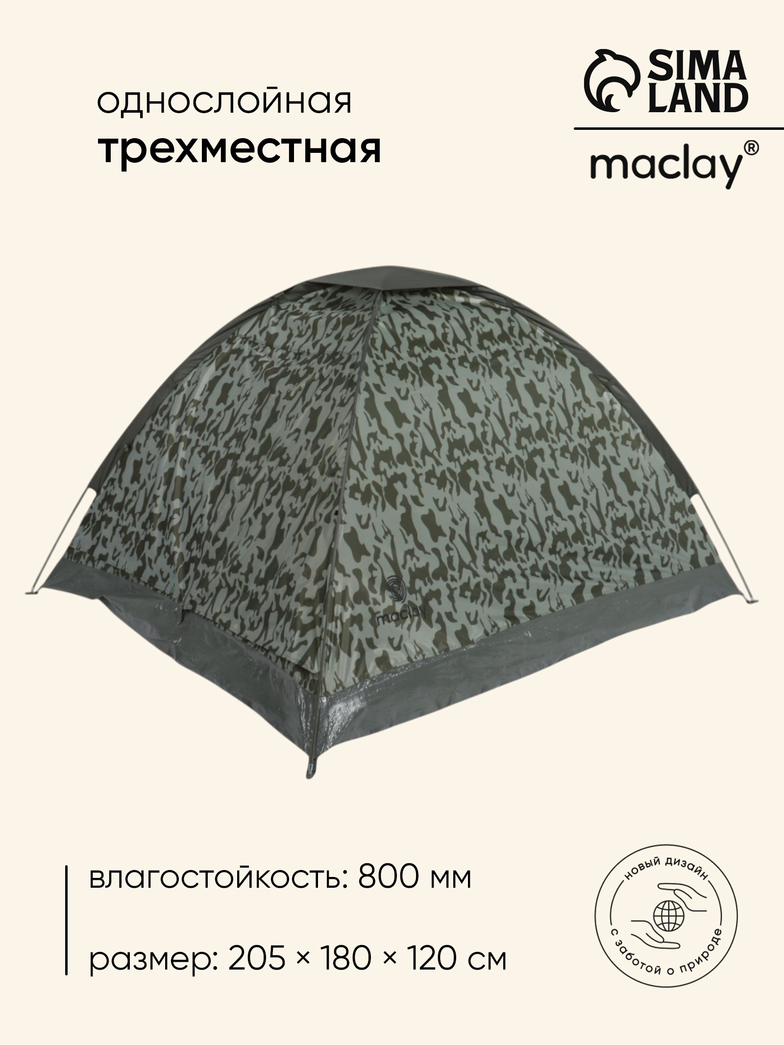 Палатка туристическая 3-местная Maclay Fisht Sme 3, 205 180 120 см, трекинговая, однослойная, цвет камуфляж
