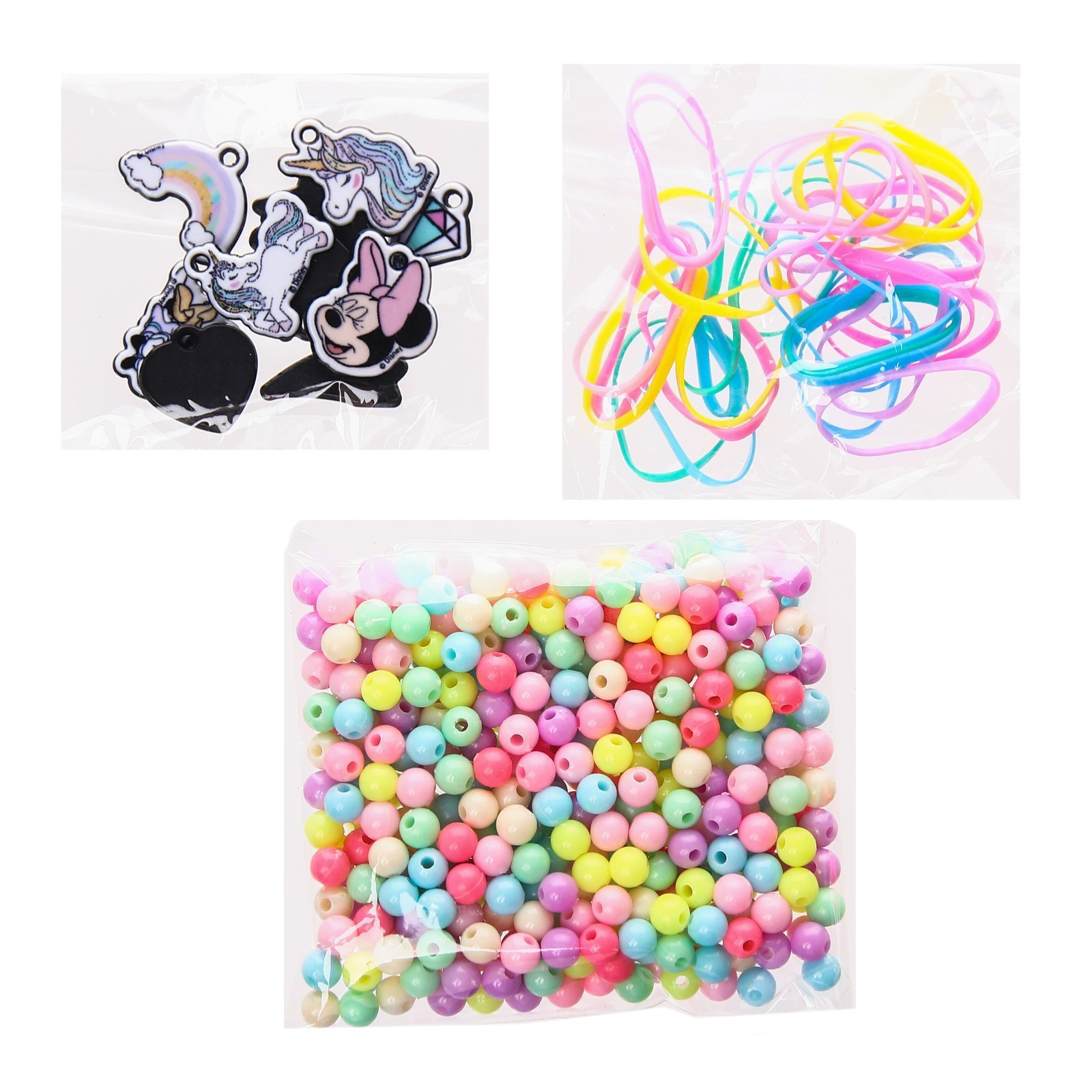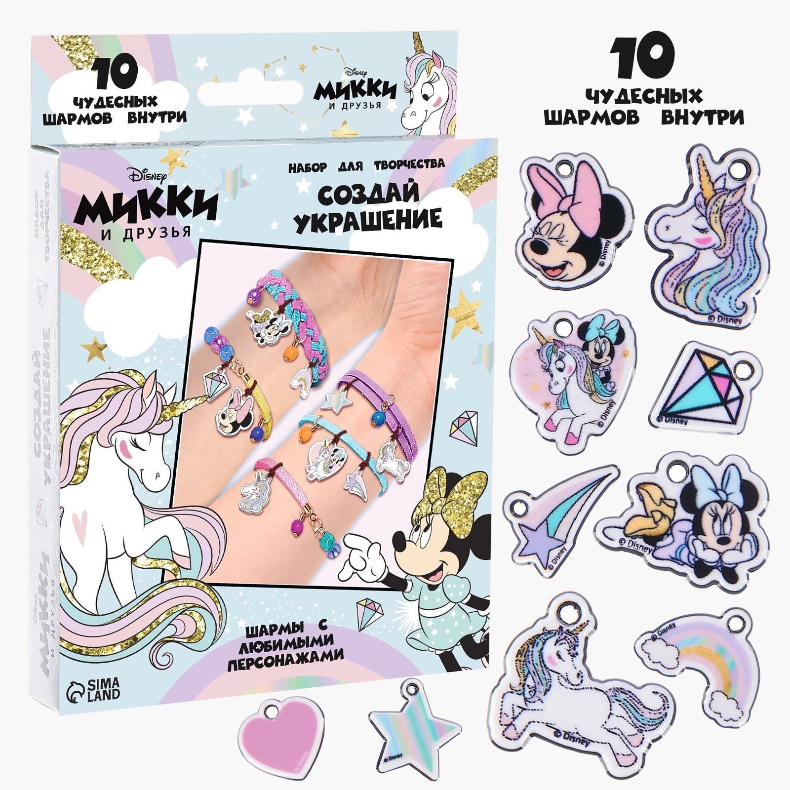 Набор для творчества «создай своё украшение», браслеты своими руками, минни и единорог, disney. Создавать украшения своими руками стало ещё интереснее. Ведь помимо бусинок можно добавить красивые шармы, сделанные своими руками.Инструкция Сделай свое украшение: возьми длинный жгутик из набора или короткие жгутики с застежками, закрепи на них шармики. Вдень резиночку в отверстие шармика, продень конец резиночки в петлю и затяни в узел, сделай такие подвесы для всех шармиков. Как плести браслетик: 1. Свяжи вместе три веревочки из набора. Для этого сначала сложи одну веревочку в два раза и натяни, закрепив кончики на булавки или скотч. 2. Сделай 2 петельки из веревочек других цветов и продень одну в другую, расположи так, как показано на рисунке. 3. Продень нижние веревочки в петельку снизу-вверх. Оберни длинный жгутик два раза вокруг руки и застегни, на другую руку можешь надеть браслетики покороче. Состав набора: 3 пакета бусин; резиночки; шармики; браслеты с застежками; цветные нитки Цвет:Голубой|Для кого:Для девочки|Возраст:От 5 лет|Тематика:Мультфильмы|Тематика праздника:8 Марта|Для создания:Браслеты|Страна:Китай  развернуть описание ▼