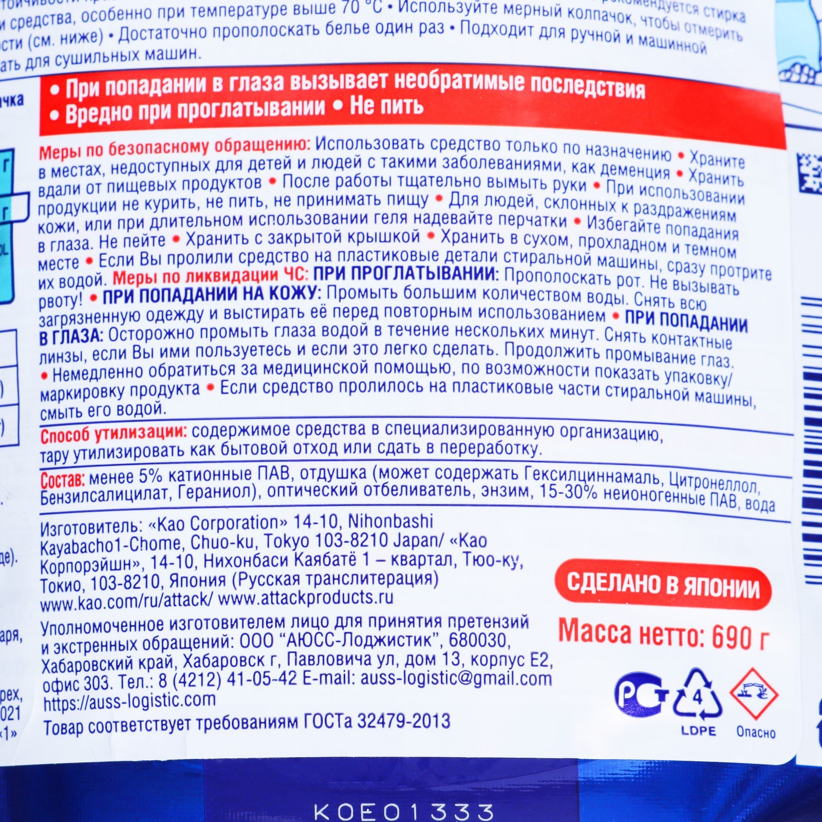 Концентрированный гель для стирки attack multi-action 0,69 кг. Назначение: Для белых тканей Назначение: Для цветных тканей Назначение: Для стирки в холодной воде Назначение: Для чёрных тканей Вид стирки: Для всех видов стирки : 0 Температурное ограничение: Нет Особенности средства: Концентрат  развернуть описание ▼