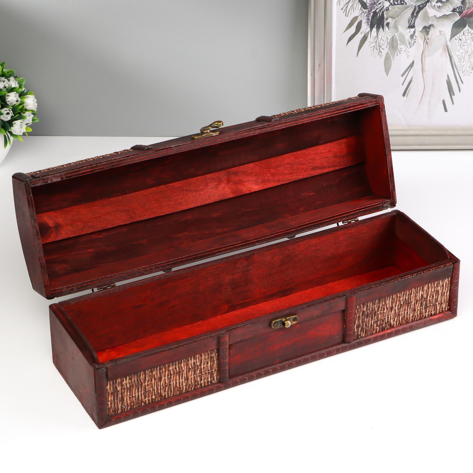 Шкатулка подарочная под бутылку «сундучок», дерево, 36 11 11 см. Приобрели элитный горячительный напиток кому-то в подарок, но не знаете, какую упаковку выбратьx Деревянная шкатулка под бутылку будет как раз кстати. В ней можно переносить и хранить содержимое, не переживая за его безопасность. В интерьере такой аксессуар смотрится эффектно, элегантно и статусно. Набор:Нет|Цвет:Коричневый|Форма:Прямоугольная|Длина, см:36|Ширина, см:11|Высота, см:11|Тематика:Ретро|Тематика праздника:Универсальная тематика|Вид дерева:Фанера|Материал:Дерево|Покрытие:Искусственная кожа|Вид ручки:Металлическая|Особенности шкатулки:Под бутылку|Страна:Китай  развернуть описание ▼