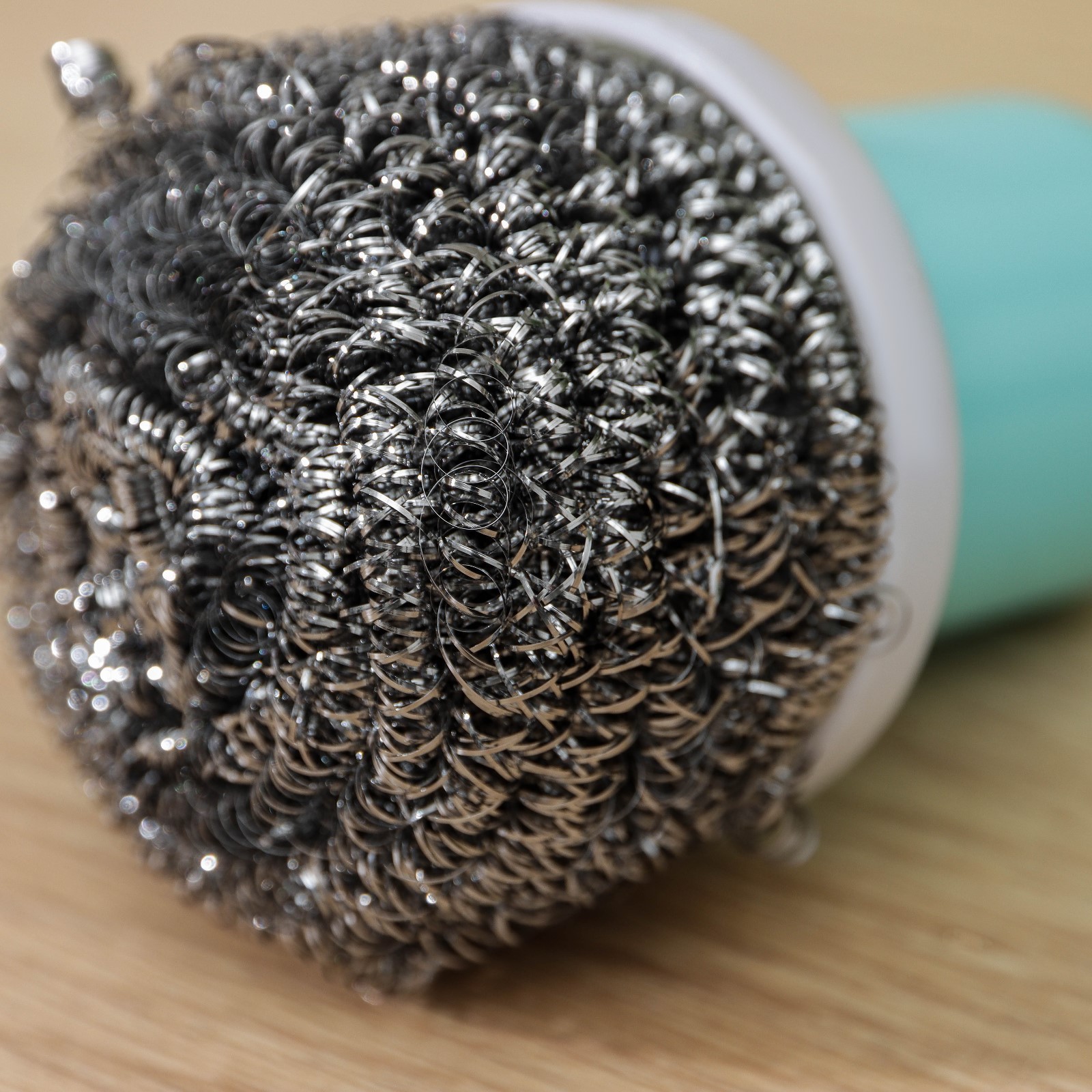 Отличается высокой эффективностью, износоустойчивостью и долговечностью. Моющая часть не деформируется даже при длительной эксплуатации. Металлическая губка требует меньше усилий при работе с сильнозагрязнённых поверхностей и позволяет легко удалить подгоревшие продукты и жир. Счищает стойкий жир и налёт. Подходит для большинства видов посуды.
