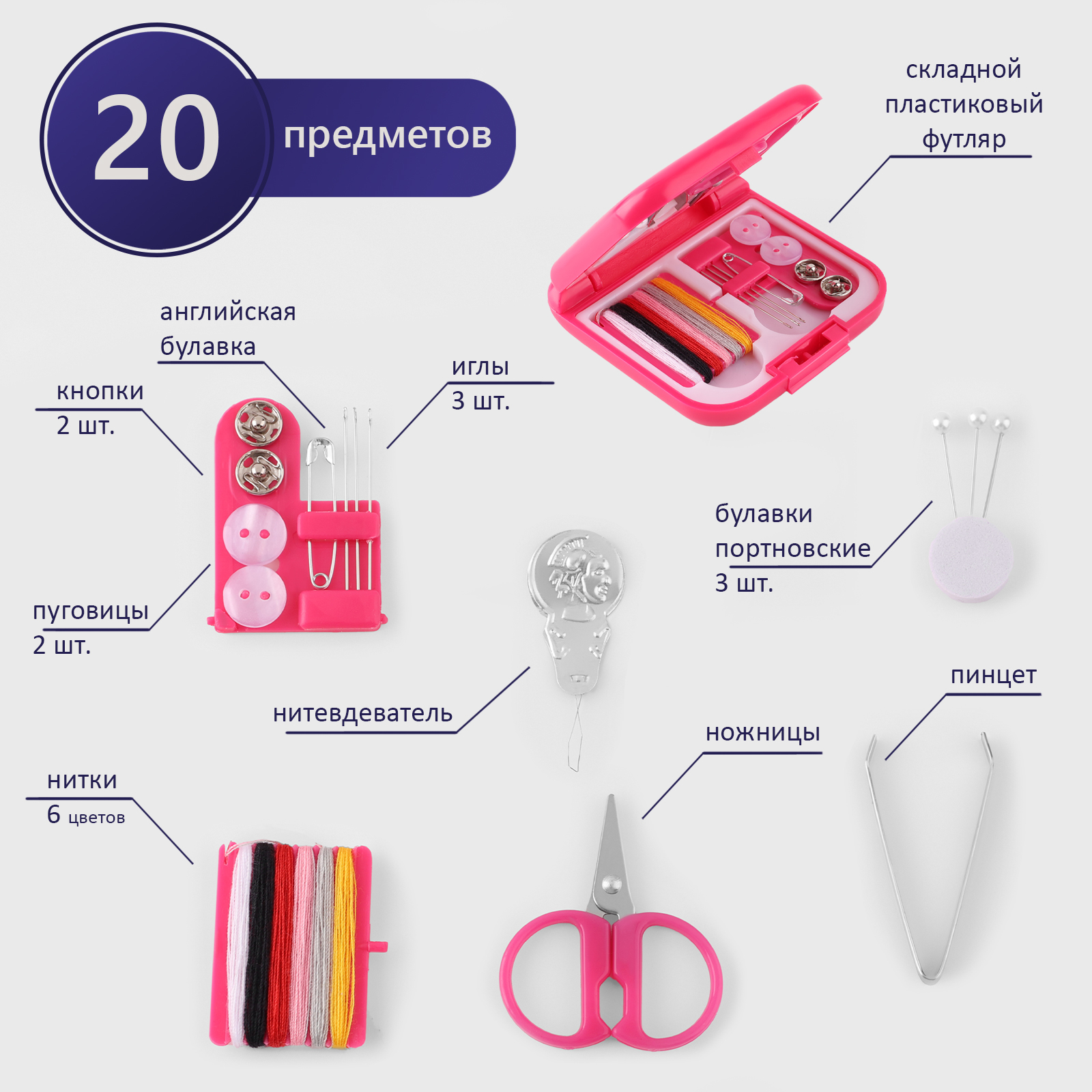 Швейный набор дорожный, 20 предметов, в складной пластиковой коробке, 7 X 6,5 X 2 см, цвет микс