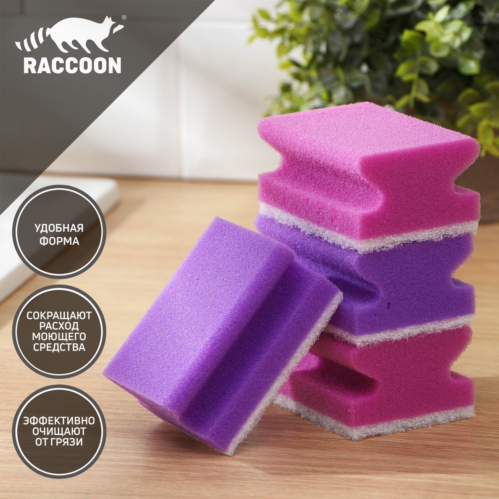 Набор губок для мытья посуды Raccoon «фьюжн», 4 шт, 9,5x7x4,4 см, цвет фиолетовый