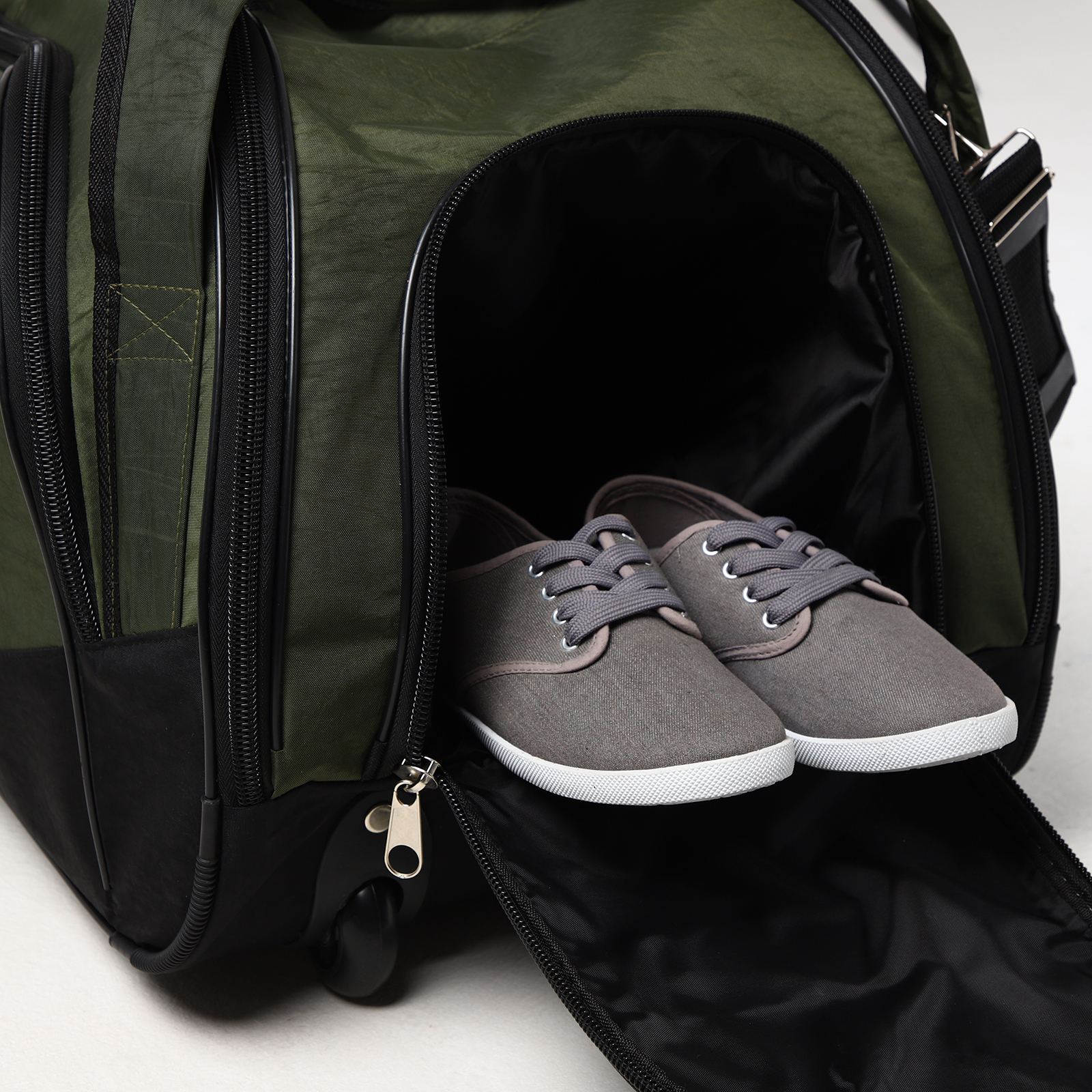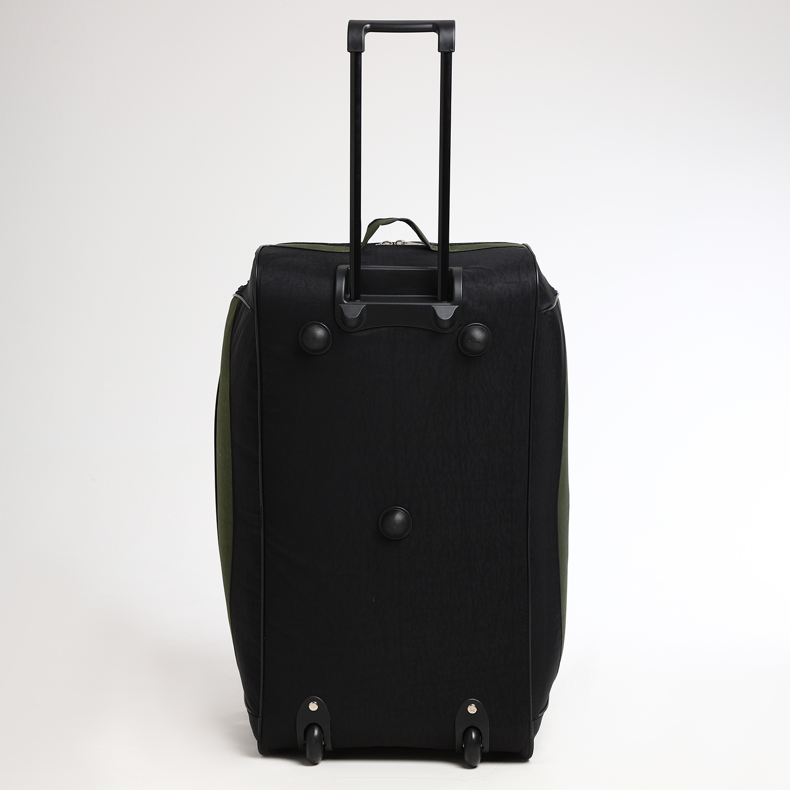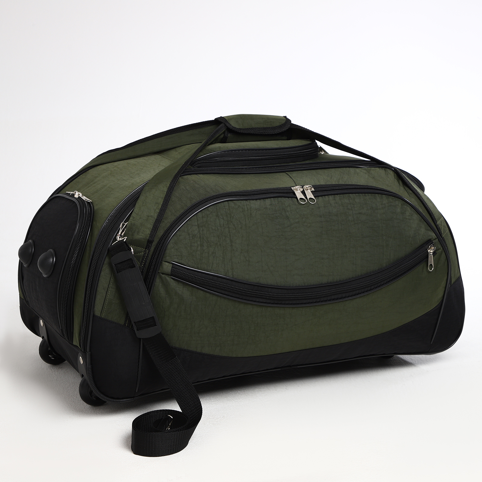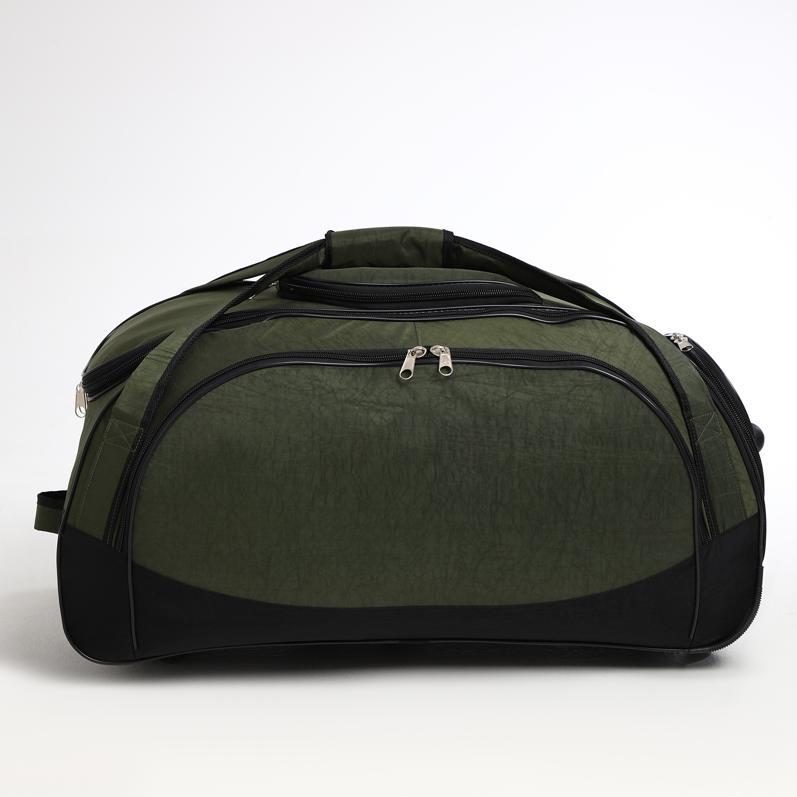 Сумка дорожная на колёсах, отдел на молнии, отдел для обуви, 3 наружных кармана, длинный ремень, цвет чёрный/хаки. Цвет: Зелёный Длина, см: 80 Ширина, см: 38 Высота, см: 80 Количество колёс: 2 На колёсиках: Да Материал: Текстиль Дополнительный объём: Без увеличения Материал колёс: Пластик Особенности: Колёса Особенности: Выдвижная ручка  развернуть описание ▼