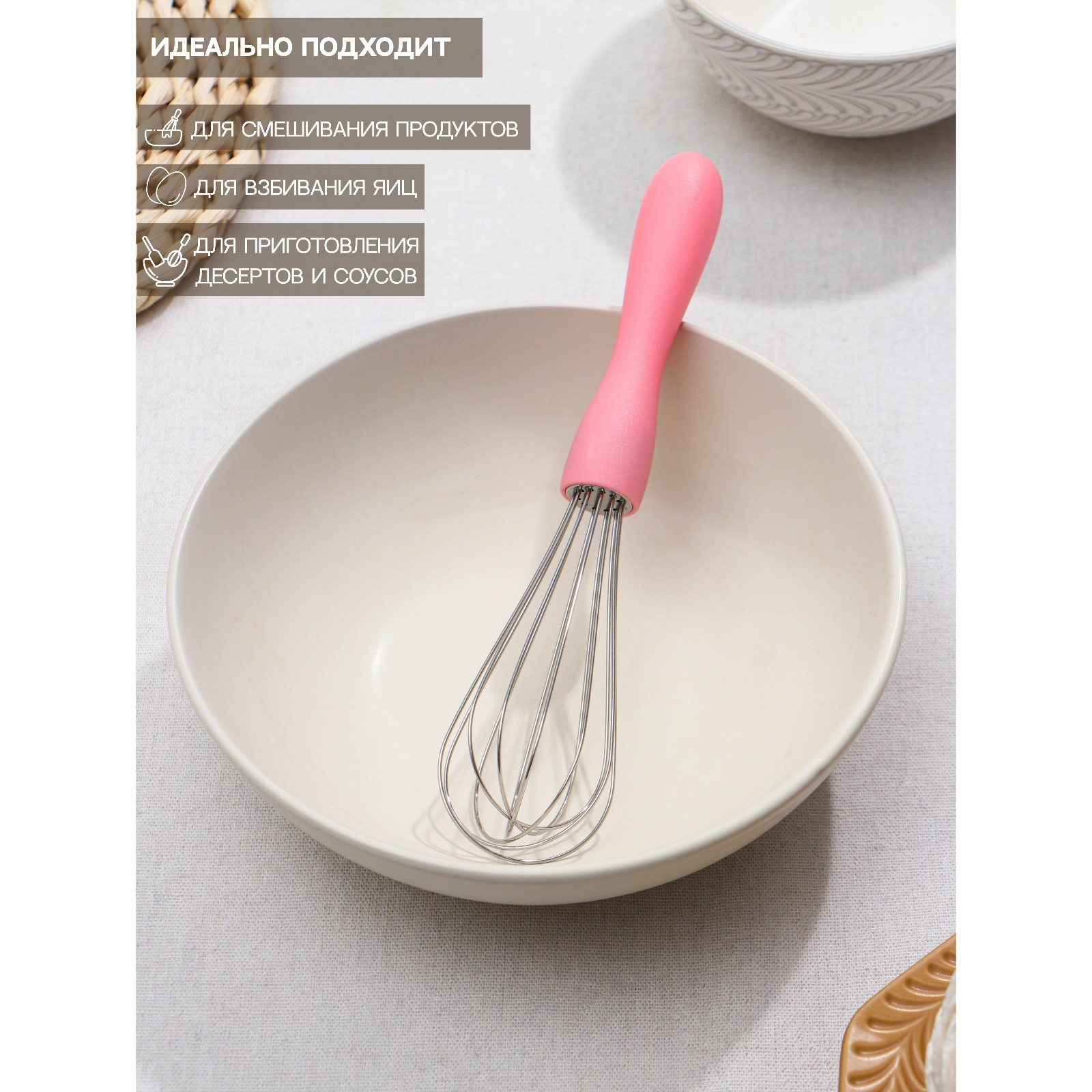 Венчик для взбивания доляна «небесное суфле», 20 см, цвет микс. Быстро взбить яйца для завтрака, перемешать ингредиенты для соуса, сделать тесто для блинов или приготовить вкуснейший кляр без комочков — с этими задачами справится незаменимый кухонный венчик «Небесное суфле». Преимущества: Это отличная альтернатива увесистому миксеру: не требует много времени и места на установку, работает без электричества. Венчик поможет быстро взбить крем из белков и жирных сливок для украшения кондитерских изделий, а также перемешать ингредиенты для приготовления пышных оладий. Дизайн венчика отлично украсит вашу кухню. Цвет: МИКС Материал ручки: Пластик Материал: Нержавеющая сталь Тип покрытия: Без покрытия Для детей до 3 лет: Нет Материал рабочей части: Металл Можно мыть в посудомоечной машине: Нет  развернуть описание ▼