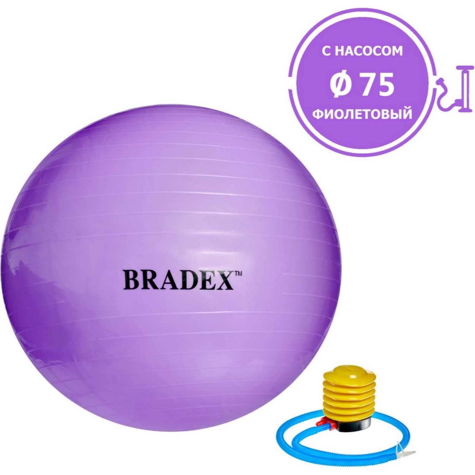 Фитбол bradex «фитбол-75» d=75 см, с насосом, фиолетовый. Цвет: Фиолетовый Форма: Шар Диаметр, см: 75 Наличие насоса: Да Maксимальная нагрузка, кг: 120 Вес, г: 800 Возраст: Взрослый Материал: ПВХ Материал: Пластик Массажный: Нет Вид: Мяч  развернуть описание ▼