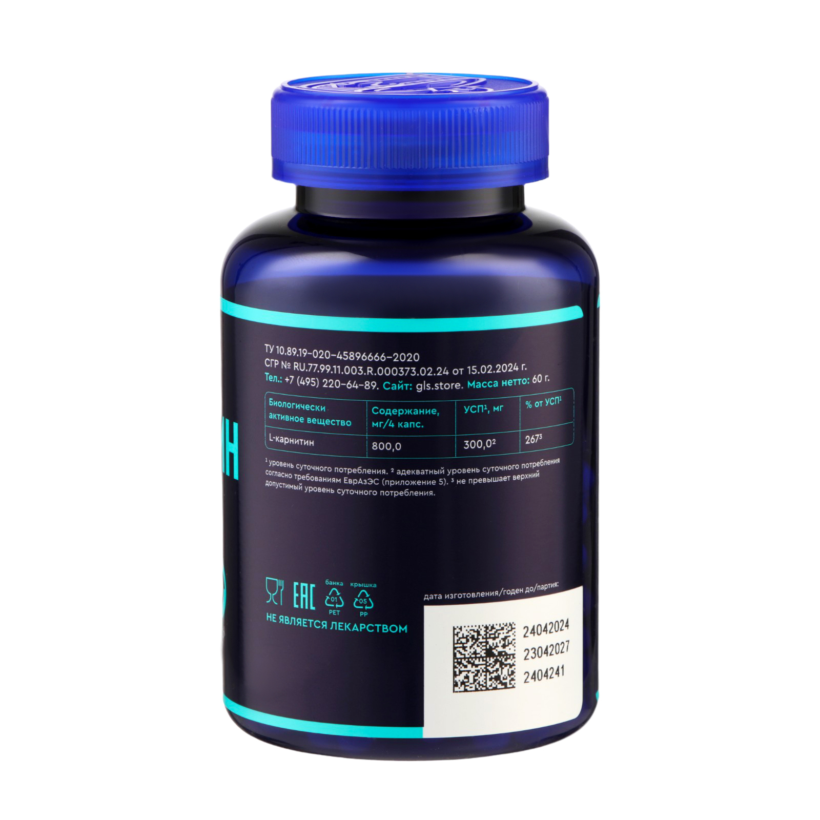 L-карнитин 800 gls pharmaceuticals, сжигание жира и физическая выносливость, 120 капсул по 400 мг. L-карнитин выполняет важную роль в обеспечении организма энергией. Способствует снижению веса за счет сжигания жиров, повышает физическую выносливость и сокращает период восстановления у спортсменов, улучшает насыщение клеток кислородом, оказывает положительное влияние на иммунитет, усиливая защитные силы организма. Участвует в преобразовании жира в энергию, улучшая обмен веществ и нормализуя деятельность сердечно-сосудистой системы. Суточная доза карнитина — 800 мг. Способствует снижению веса за счет сжигания жиров. Повышает физическую выносливость и сокращает период восстановления у спортсменов. Улучшает насыщение клеток кислородом. Оказывает положительное влияние на иммунитет, усиливая защитные силы организма. Состав: L-карнитин тартрат, антислеживающие агенты кальциевая соль стеариновой кислоты и кремния диоксид, капсула (гидроксипропилметилцеллюлоза). Состав 4 капсулы (суточная доза) содержат: L-карнитин — 800 мг Вспомогательные вещества: Гидроксипропилметилцеллюлоза Кальциевая соль стеариновой кислоты Кремния диоксид Рекомендации по применению: Взрослым по 2 капсулы 2 раза в день во время еды. Продолжительность приема - 1 месяц. При необходимости прием можно повторить. Возрастные ограничения: 18+. Вес, г/Объём, мл: 48 Количество капсул/таблеток в упаковке: 120 Форма выпуска: Капсулы/таблетки Вид: Отдельные аминокислоты Температурное ограничение: Нет Назначение: Для похудения Форма выпуска: Капсулы Честный знак: Да Показания: Интенсивные физические нагрузки Компоненты: L-карнитин Действие: Общеукрепляющее  развернуть описание ▼
