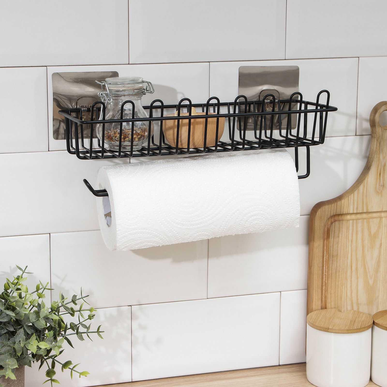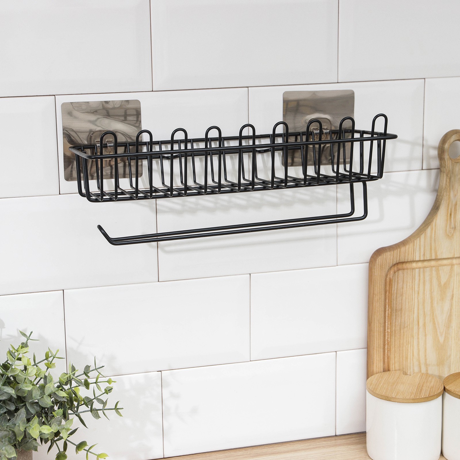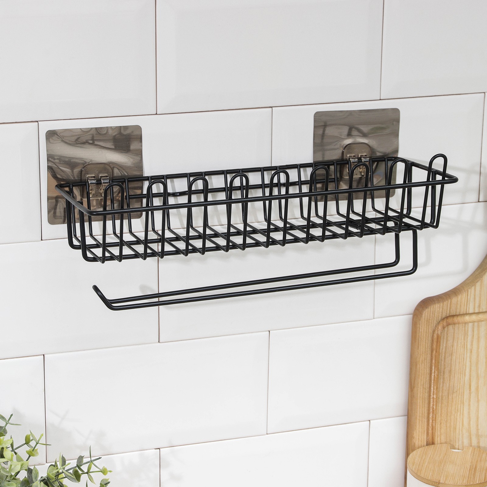 Полочка для губок и моющего средства, с держателем для полотенец, на липучке, цвет чёрный