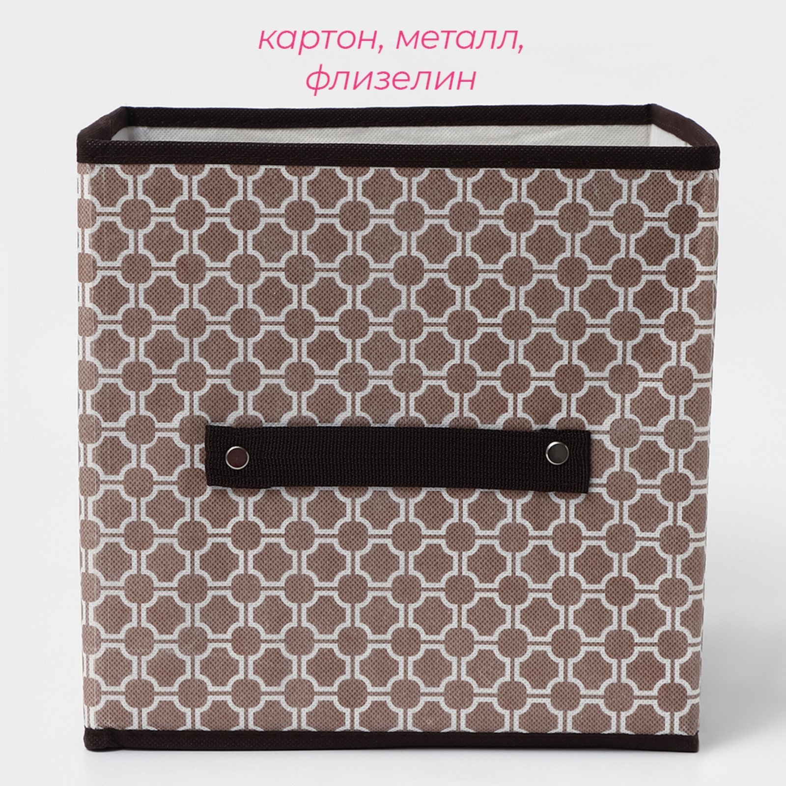 Короб стеллажный для хранения доляна «браун», 25x25x25 см, цвет коричневый. Многие сталкиваются с проблемой размещения небольших вещей. Занимать ими целую полку жалко, а хранить в других местах неэстетично. Решение есть! Кофр поможет разобраться с беспорядком. Поставьте его в гардероб или на пол, и вы всегда будете знать, где и что в нём находится. Благодаря лёгкости убрать изделие на возвышение смогут даже хрупкие девушки. Преимущества: Большой объем. Многофункциональность. Малый вес и отсутствие острых углов. Стильный дизайн. Вместе с этим простым предметом в доме поселятся порядок и уют. Оригинальное изделие дополнит ваш интерьер и станет украшением помещения. Цвет: Коричневый Форма: Квадратная Ширина, см: 25 Высота, см: 25 Глубина, см: 25 parts count: 0 Количество отделений: 1 tnved: 6307909800 Материал: Флизелин Материал: Клеёнка Форма: Квадрат, куб  развернуть описание ▼