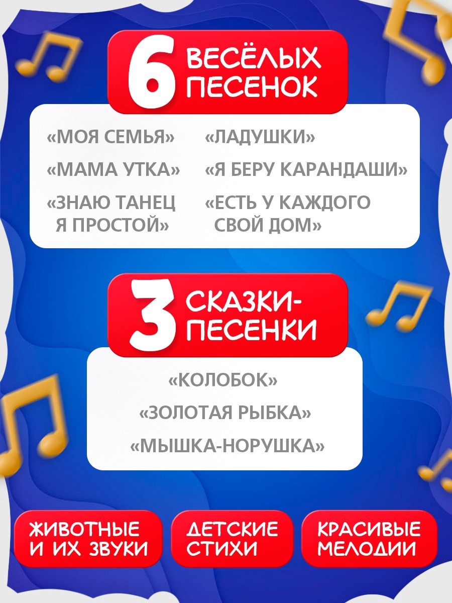 Проигрывает песенки, мелодии, стишки и весёлые фразы.Воспроизводит звуки животных и их названия.Светятся кнопочки на панели.Для работы необходимы 3 батарейки типоразмера AAA, входят в комплект.Какие песенки воспроизводит игрушка