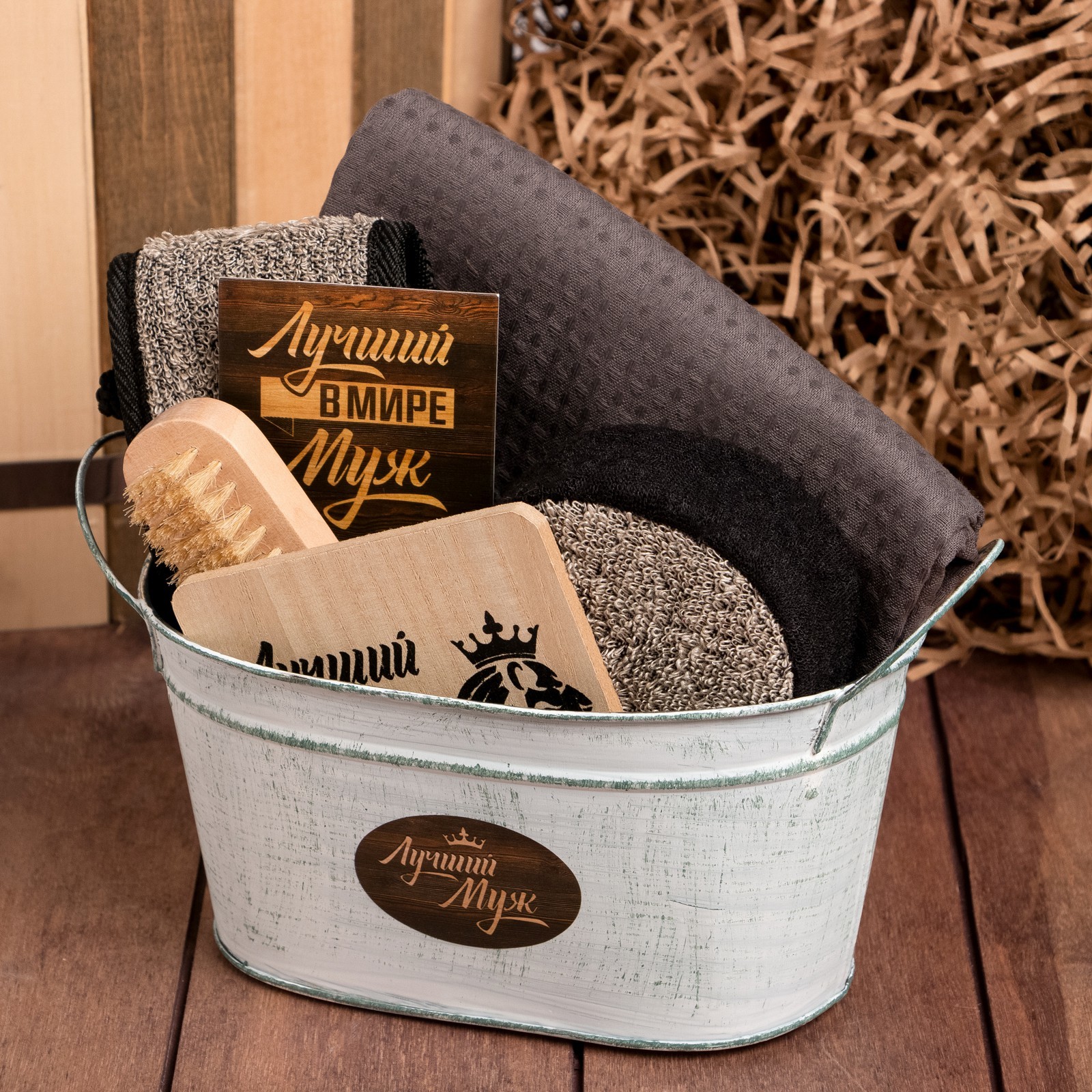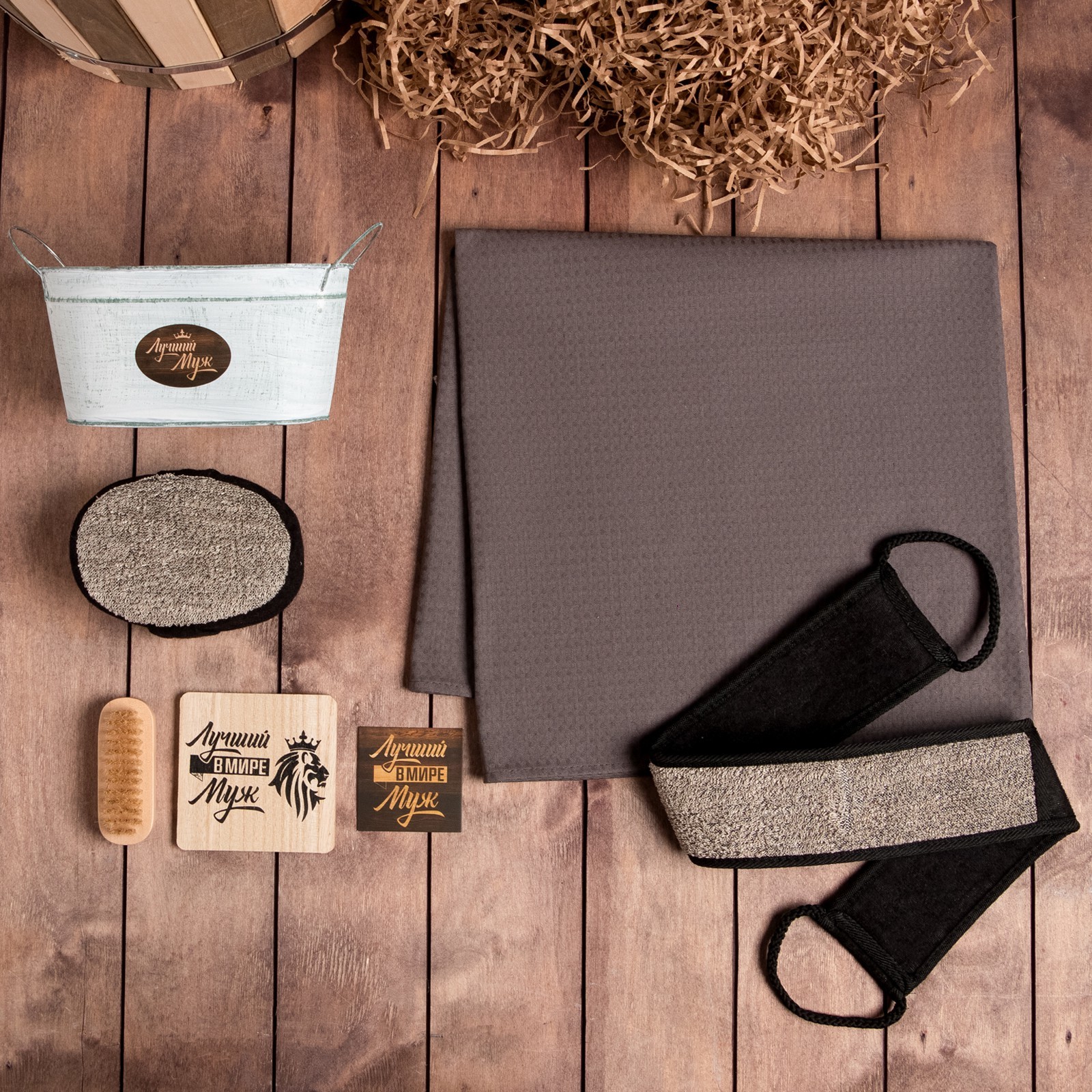 Набор подарочный «этель. лучший муж», полотенце, щётка, мочалка. Набор:Да|Цвет:Коричневый|Для кого:Для мужчины|Ткань:Вафельное полотно|Плотность, г/м :160|Размер, см:80 х 150|В наборе, шт.:6|Тематика:Мужская|Вид упаковки:Пакет|Вид упаковки:Ведерко|Тематика праздника:23 Февраля|Адресат:Мужчине|Декоративные элементы:Без элементов|Рекомендации по уходу:Химчистка запрещена|Рекомендации по уходу:Не отбеливать|Рекомендации по уходу:Стирка при 30 °С|Рекомендации по уходу:Глажка при 110 °С|Назначение полотенец:Для тела, банное|Состав ткани:Хлопок|Составляющие набора:Открытка|Составляющие набора:Полотенце|Составляющие набора:Щётка|Составляющие набора:Подставка под горячее|Составляющие набора:Мочалка|Возраст:Для взрослых|В подарочной упаковке:Да|Особенности:Без особенностей|Страна:Россия  развернуть описание ▼