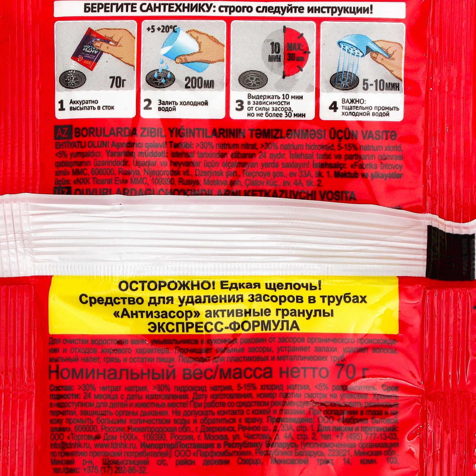 Средство для удаления засора в трубах антизасор экспресс-формула, гранулированное, 70 г. Пакетик для одного применения. Высокая эффективность. Удаляет засор за 10 минут. Безопасно для всех видов труб. Состав: >30% нитрат натрия, >30% гидроксид натрия, 5-15% хлорид натрия, <5% разрыхлитель. Вес, г/Объём, мл: 70 Температурное ограничение: Нет  развернуть описание ▼