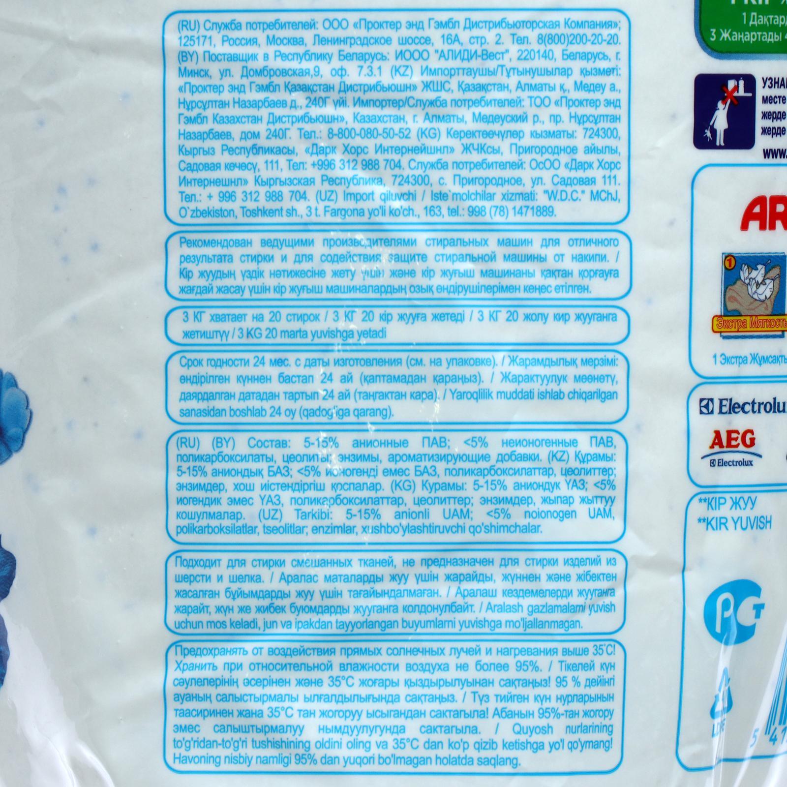 Стиральный порошок ariel color "воздушная свежесть", автомат, 3 кг. Порошок Ariel Автомат «Воздушная свежесть. Ленор» предназначен для стирки в стиральных машинах любого типа. Эффективно борется с жиром и другими сложными загрязнениями при любой температуре воды. Содержит компоненты, помогающие добиться белизны светлых вещей. Не предназначен для стирки изделий из шёлка и шерсти. Удаляет пятна и сильные загрязнения. Он подарит вашей одежде безупречную чистоту, свежесть и мягкость и убережёт стиральную машину от образования накипи. Защитит цвета одежды, поскольку содержит специальную формулу Multicolor, которая фиксирует краситель в волокнах на протяжении всей стирки, предотвращая выцветание и линьку. Состав: 5-15% фосфаты, <5% анионные ПАВ, неионогенные ПАВ, поликарбоксилаты, энзимы, отдушка. Страна-производитель: Россия. Срок годности: 2 года. Ваш безупречный внешний вид начинается с чистого воротничка! parts count: 0 Вес, кг: 3 Назначение: Для всех видов тканей Вид стирки: Автомат  развернуть описание ▼