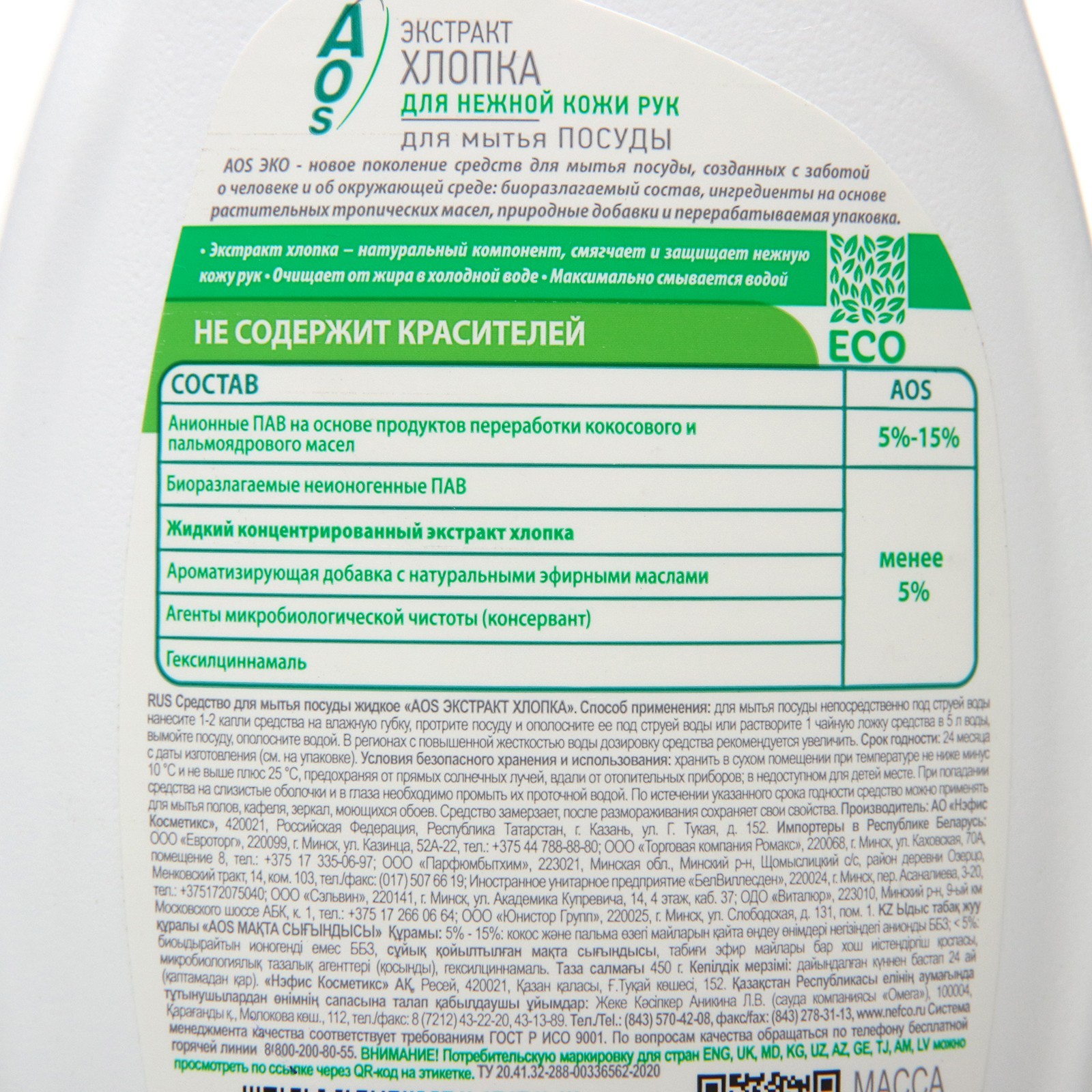 Средство для мытья посуды Aos экстракт хлопка эко, 450 гр