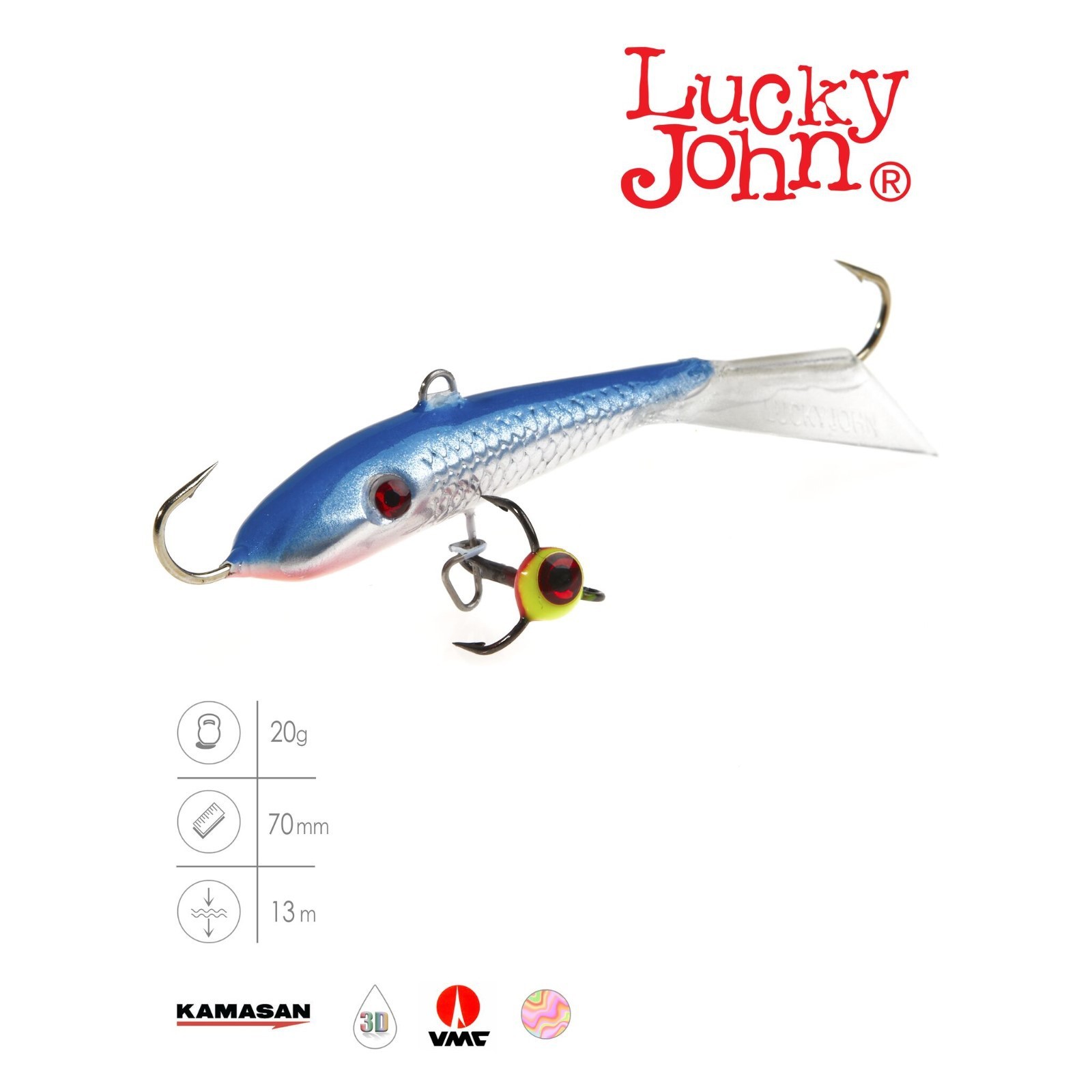 Балансир lucky john fin 5 + тройник, 7 см, цвет 15h блистер. Популярный у рыболовов балансир, для ловли крупного окуня, берша, судака и щуки длиной 70 мм. Для ловли судака его с успехом можноиспользоватьна глубинах до 13 м, если на водоеме нет течения. Для ловли крупного окуня рекомендуется использовать монофильную леску диаметром от 0, 18 до 0, 25 мм, (для ловли судака и щуки до 0, 30 мм) или плетеный шнур 0, 11–0, 15 мм. Цвет: Голубой Длина, мм: 70 Вес, г: 20  развернуть описание ▼