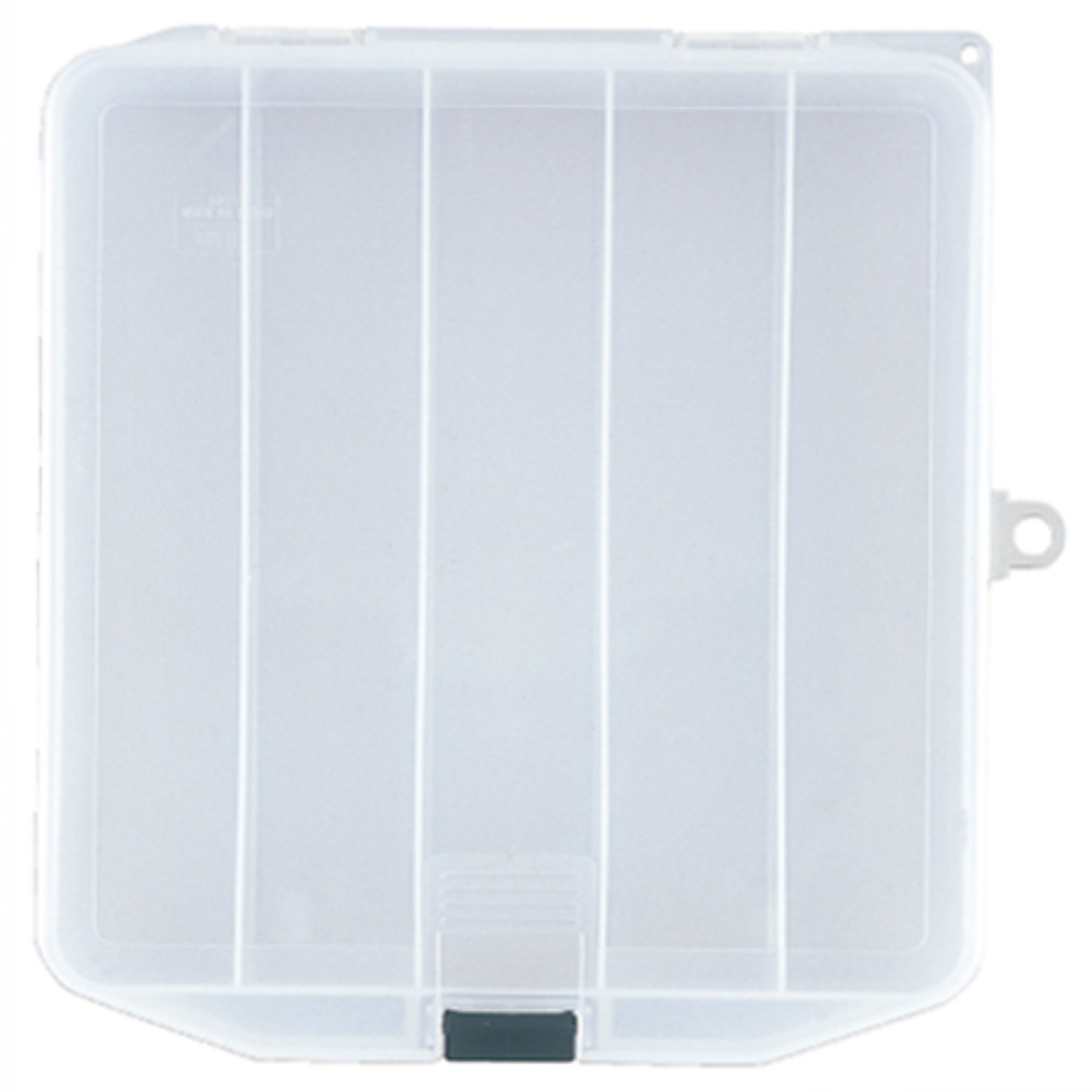 Коробка для хранения приманок, аксессуаров, оснасток. 4 фиксированных перегородки. Прочная и надёжная защёлка (утоплена в корпус). Специальная форма крышки для защиты от деформации. Защита петель от ударов с помощью специального "козырька".