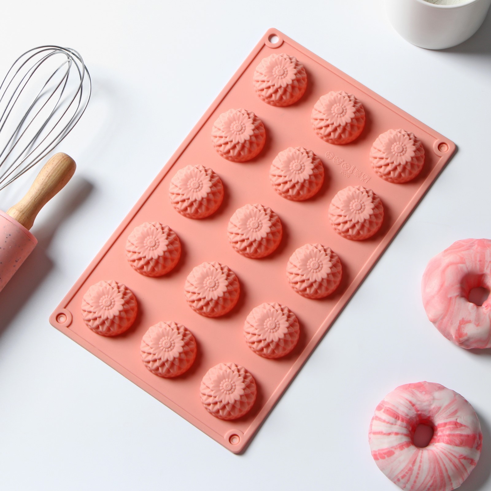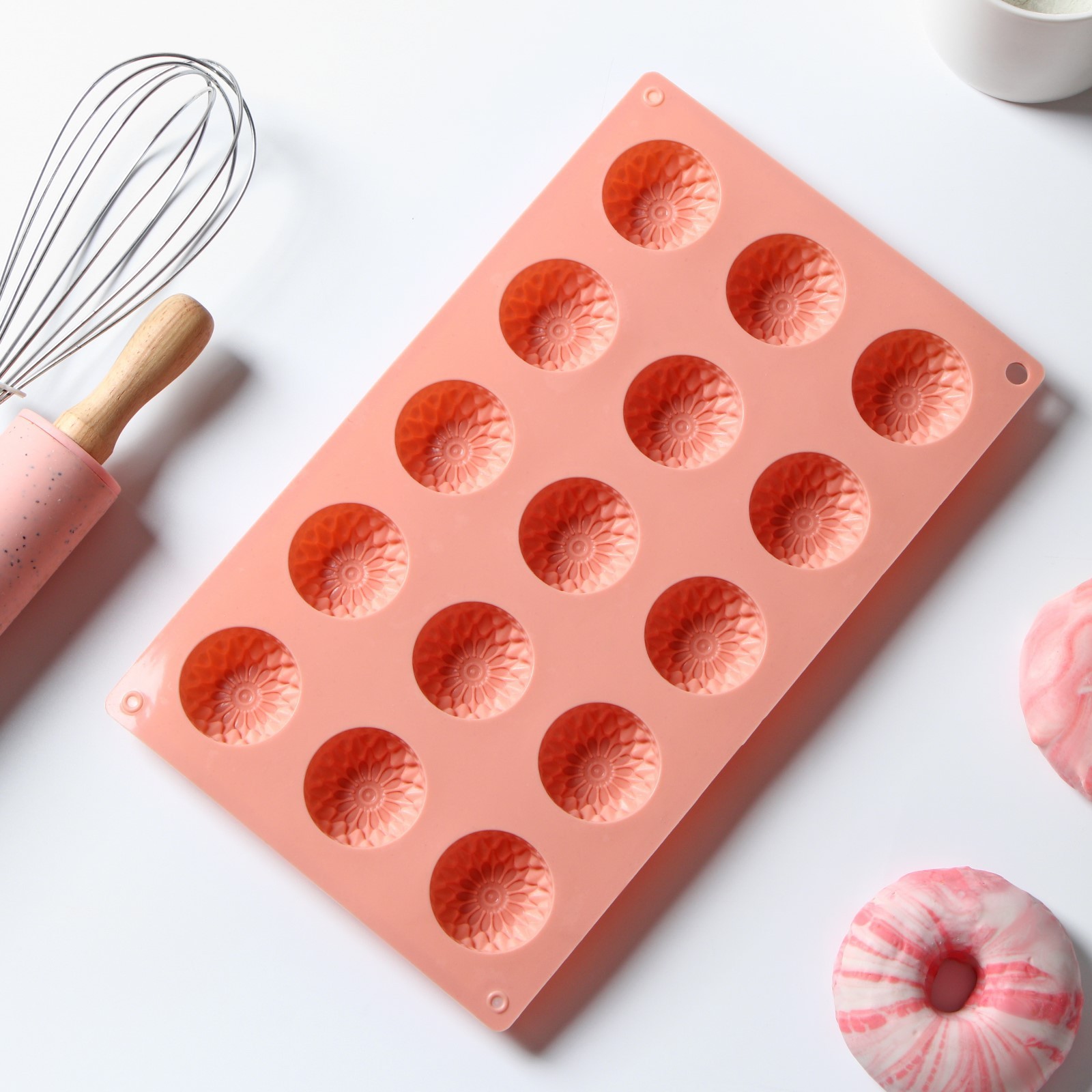 Форма силиконовая для выпечки доляна «хризантема», 30x18x2 см, 15 ячеек, цвет персиковый. Цвет: Оранжевый Форма: Полукруглая Форма: Фигурная Фасовка, шт.: 1 Количество ячеек: 15 Тематика: Однотонная Крышка: Нет Материал: Силикон Тип покрытия: Без покрытия Ячейки: Да Наличие палочек для форм: Нет Тип формы: Для печенья и пирожных Разъёмная форма: Нет Съёмное дно: Нет Размер ячейки, см: 4 х 4 х 1.5 Можно мыть в посудомоечной машине: Да  развернуть описание ▼