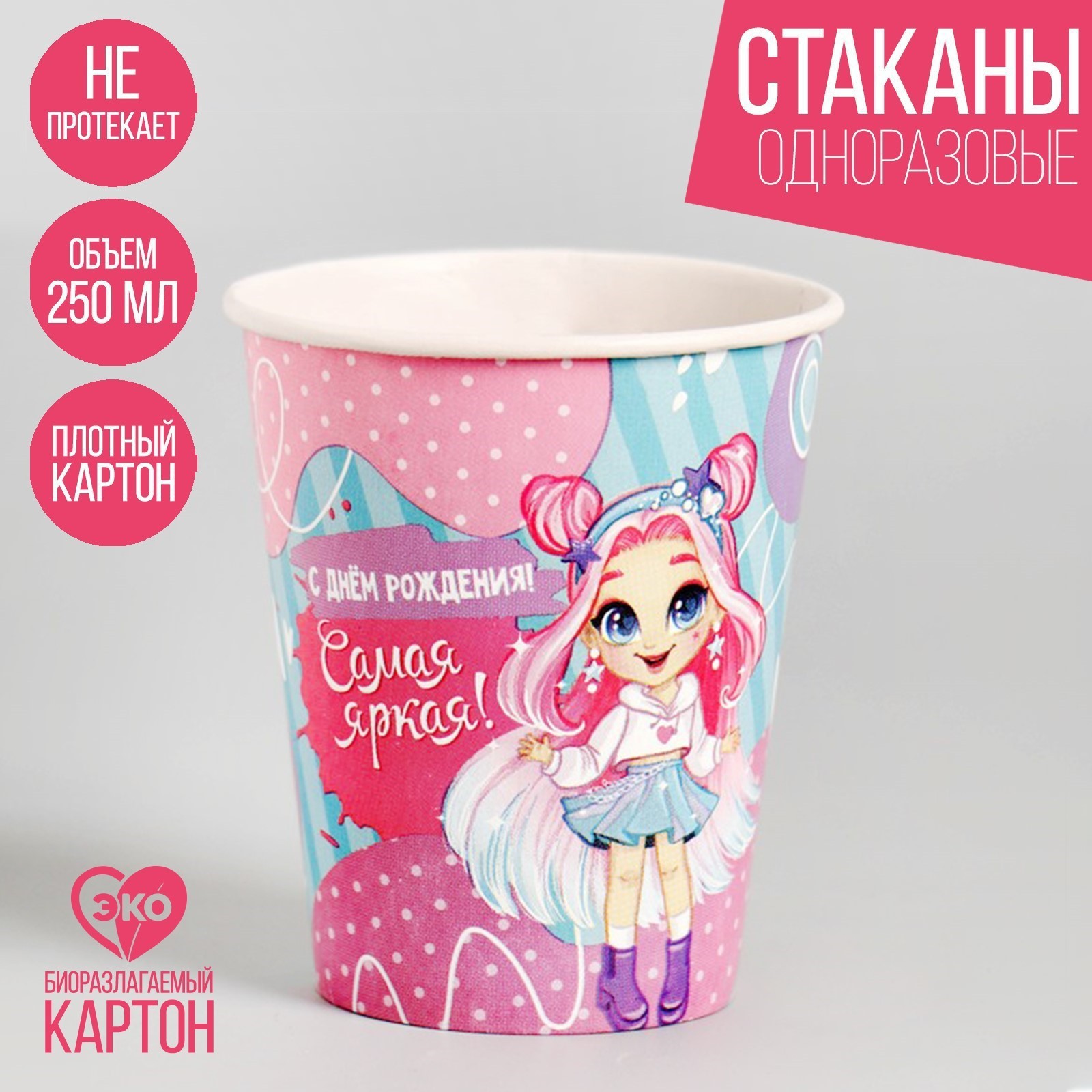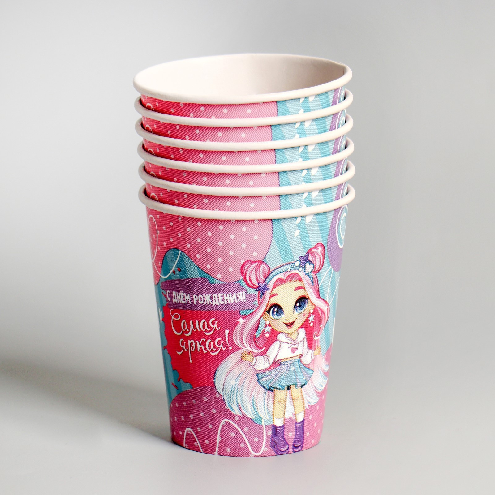 Стакан одноразовый бумажный "с днём рождения!" самая яркая, набор 6 шт, 250 мл