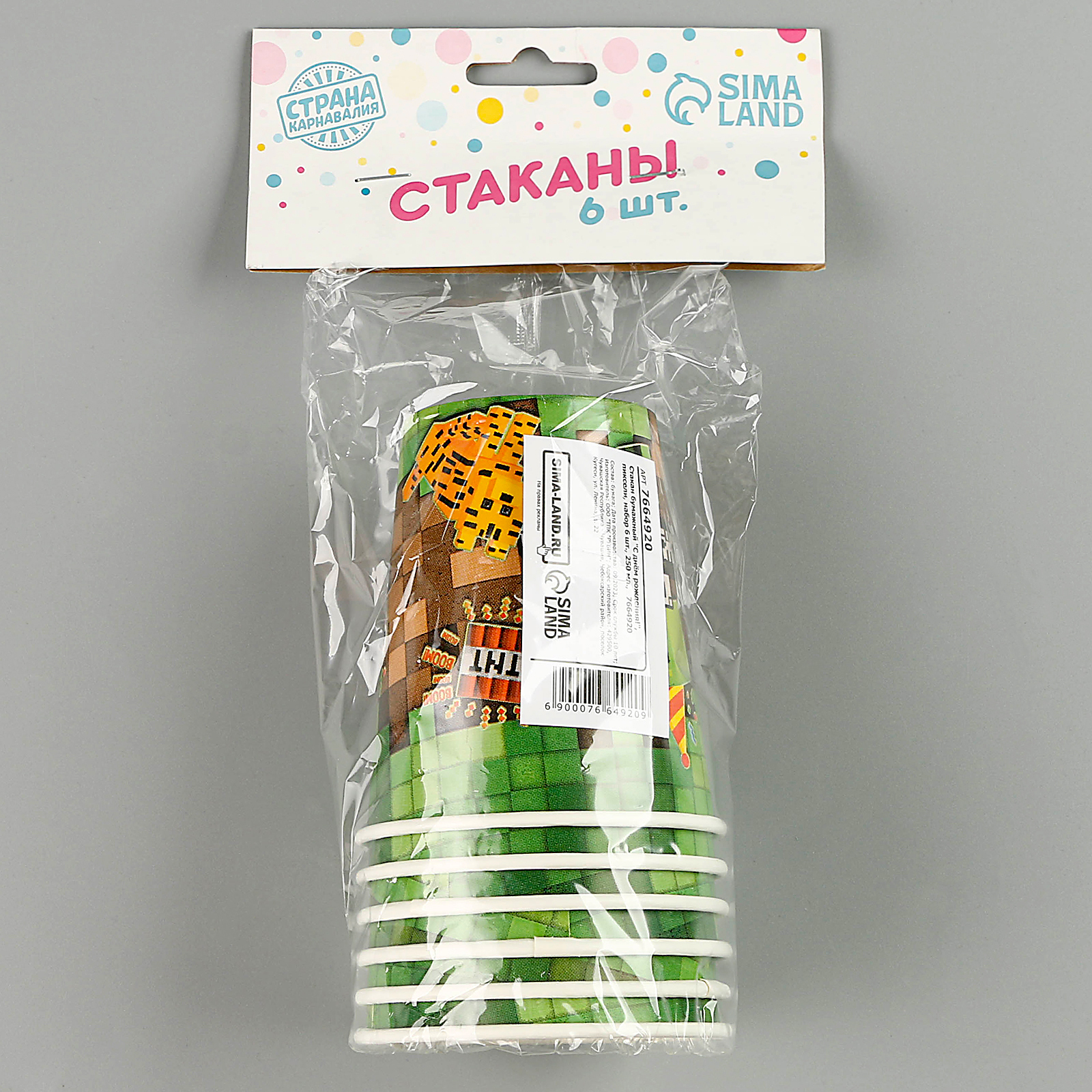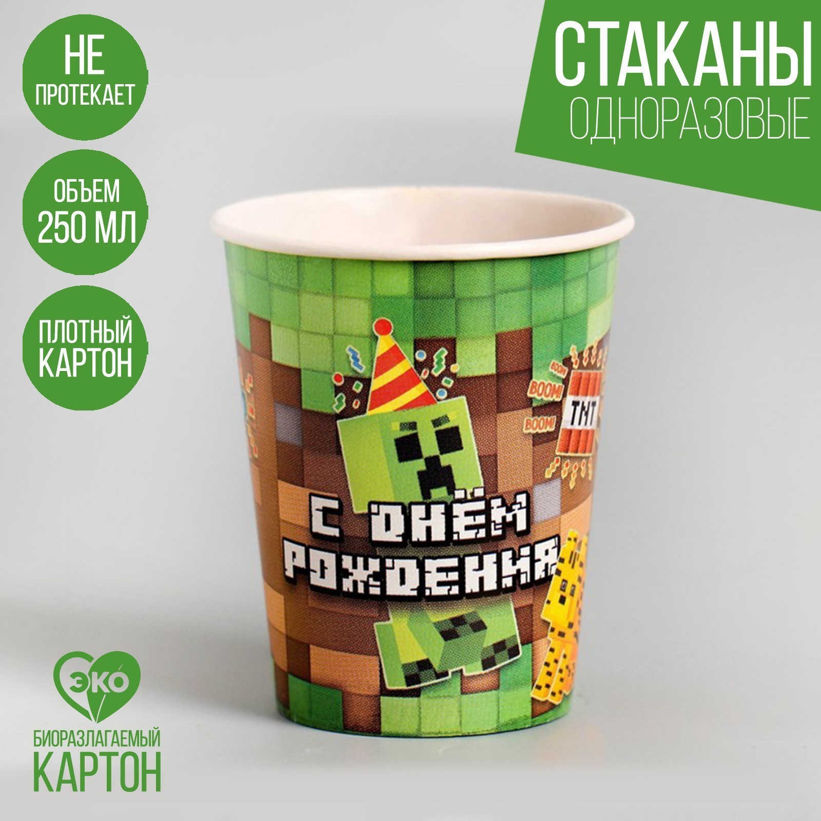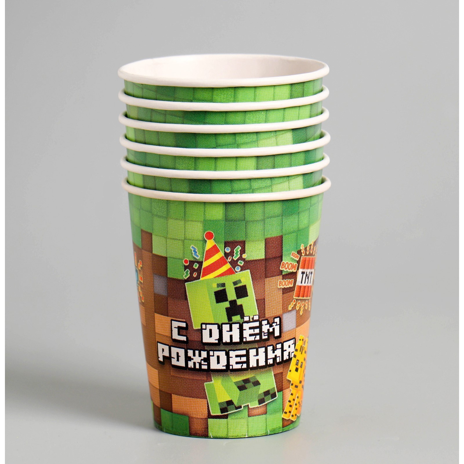 Стакан одноразовый бумажный "с днём рождения" пиксели, набор 6 шт, 250 мл