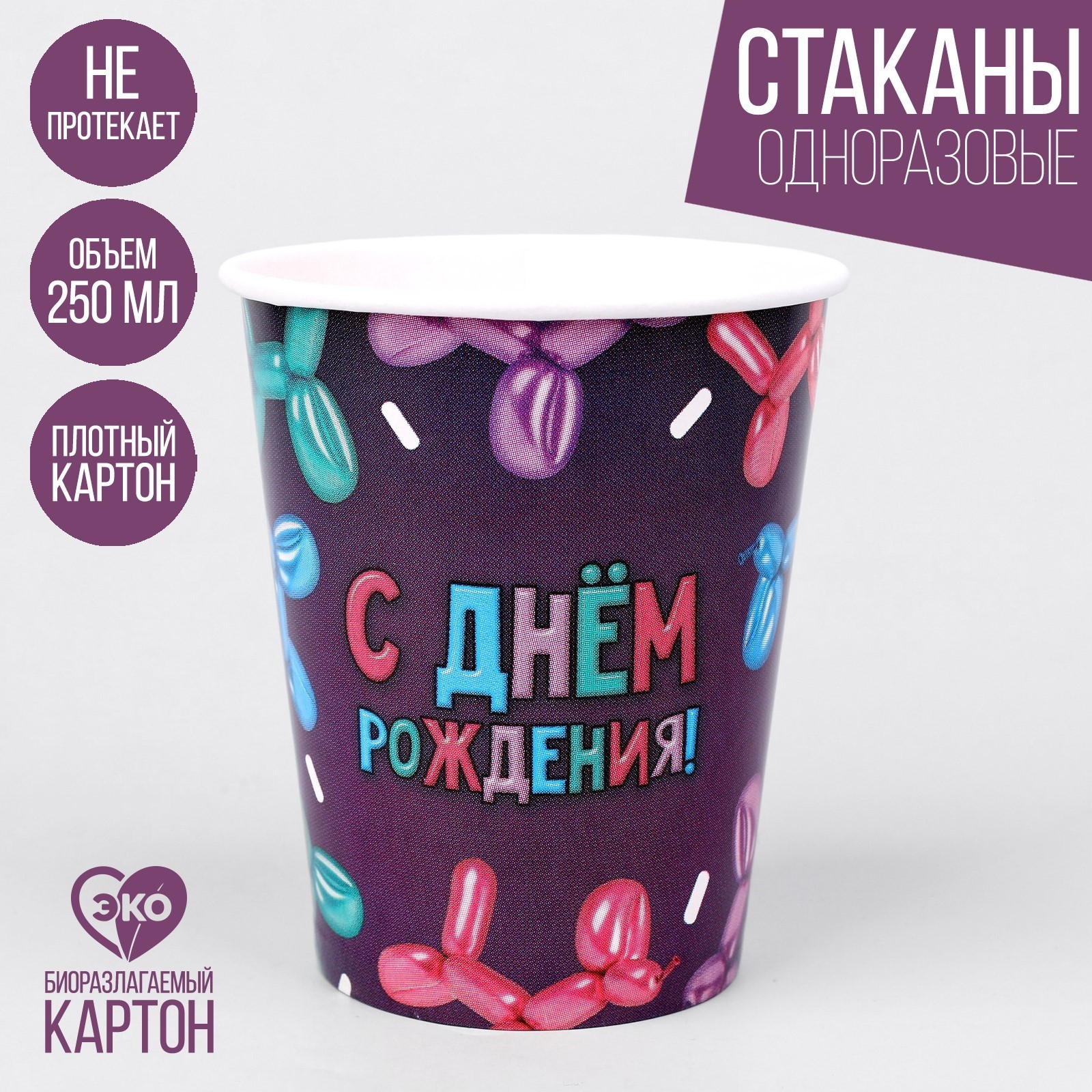 Стакан одноразовый бумажный "Happy Birthday" шары, набор 6 шт, 250 мл