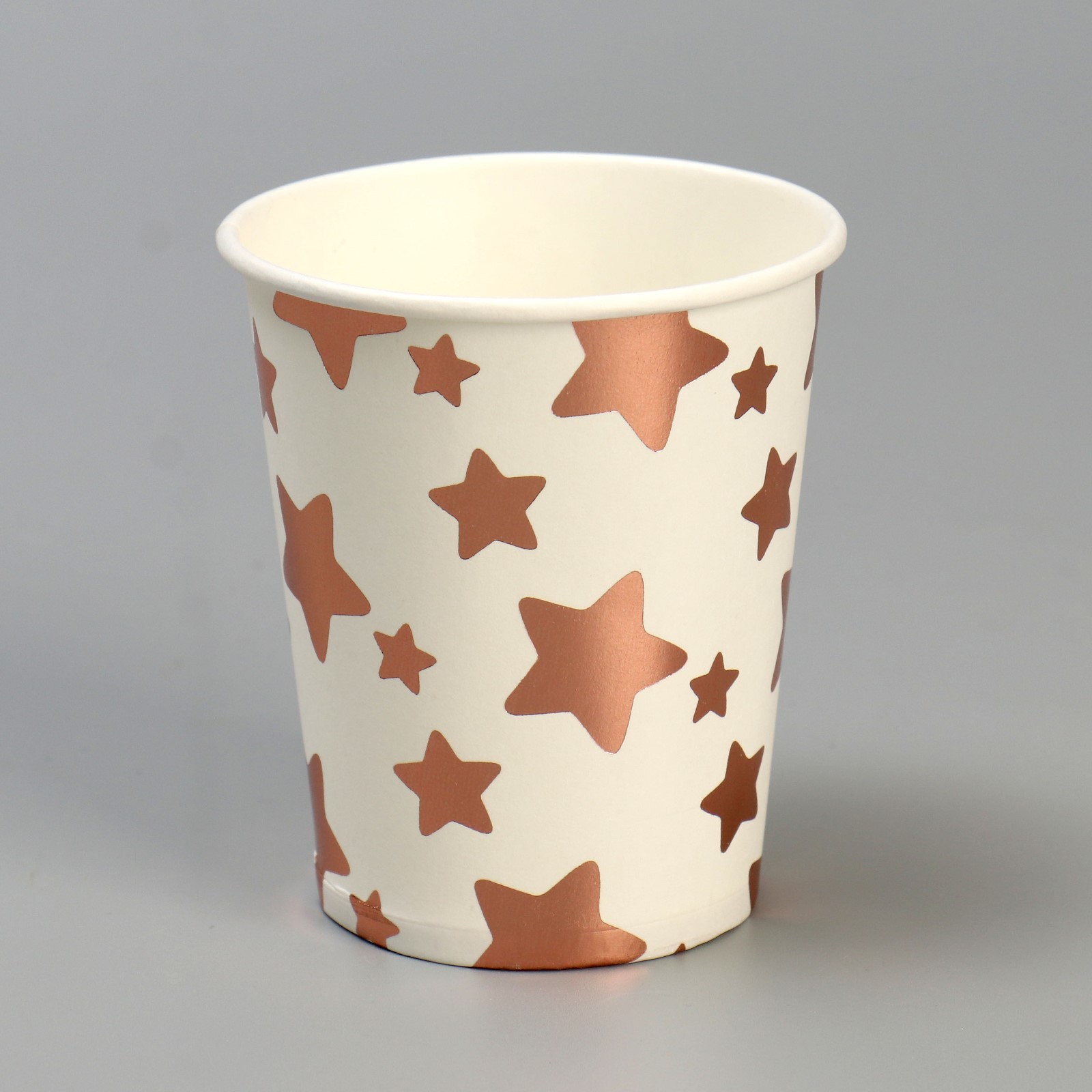 Стакан бумажный «звёзды», набор, 6 шт., цвет розовое золото. Посуда изготовлена из высококачественной бумаги без добавления поликарбоната, меламина и поливинилхлорида. Такие изделия безопасны, они не «раскисают» при взаимодействиями с продуктами питания. Преимущества бумажной посудыЭкологически безвредна: полностью разлагается в естественной среде. Гигиеничность и безопасность: при изготовлении используется первичный и вторичный картон с ламинацией, крафт-бумага и пищевые красители. Выдерживает высокую и низкую температуру. Сохраняет вкус еды и напитков, не выделяя вредных веществ, при нагреве. Тарелки и стаканы из бумаги приятнее на ощупь, чем аналогичная посуда из пластика. Такую посуду не надо мыть и невозможно разбить. Где применяется бумажная посуда:детские заведения и мероприятия, организация питание на свежем воздухе, точки продажи фастфуда, летние кафе и бистро, вендинг и офисы, доставка обедов. Цвет: Белый Цвет: Бронзовый Диаметр, см: 7.5 Количество слоёв: 1 В наборе, шт.: 6 Объём, мл: 250 Материал: Бумага Вид: Стакан  развернуть описание ▼