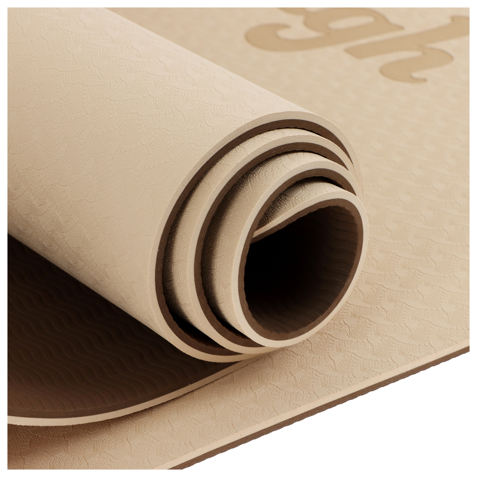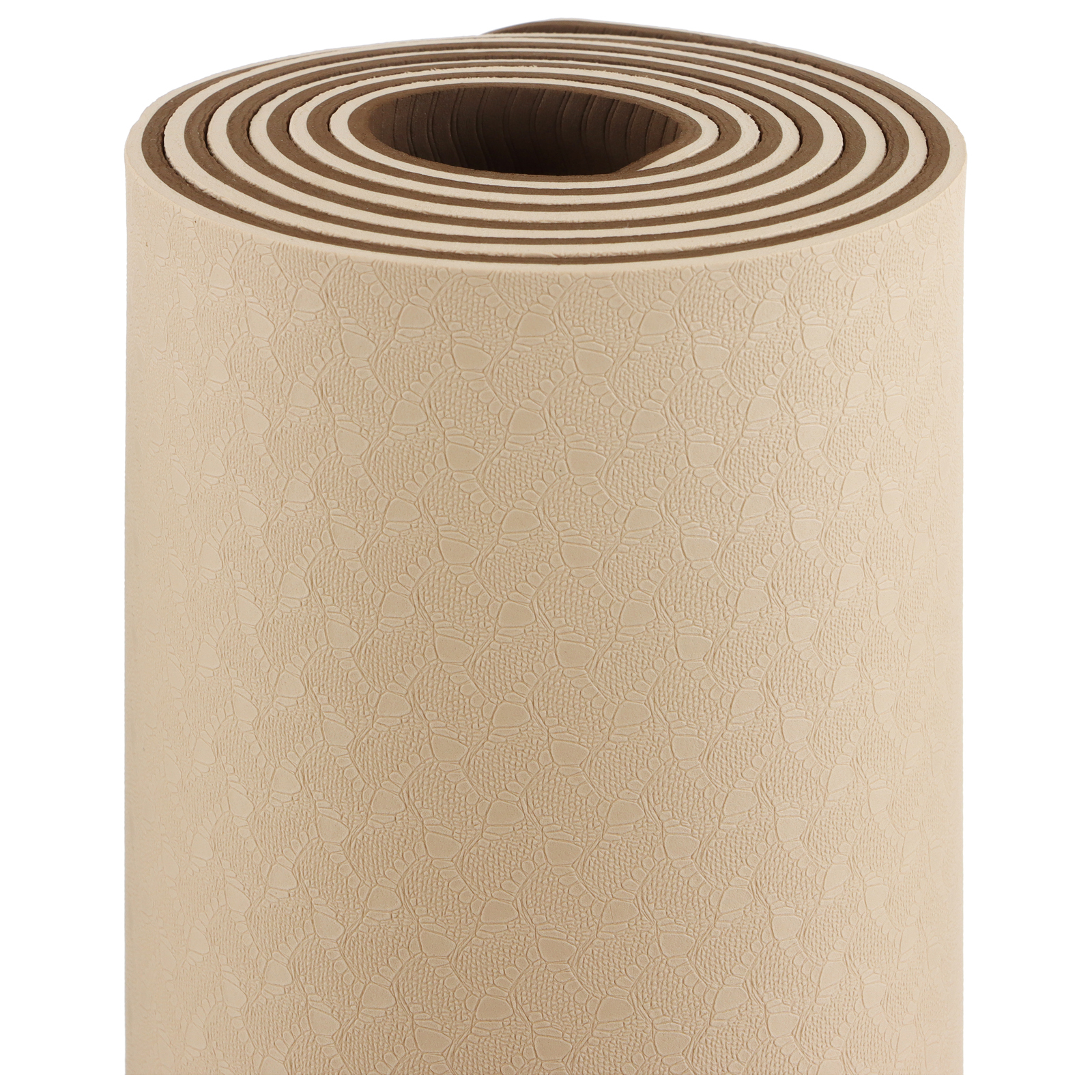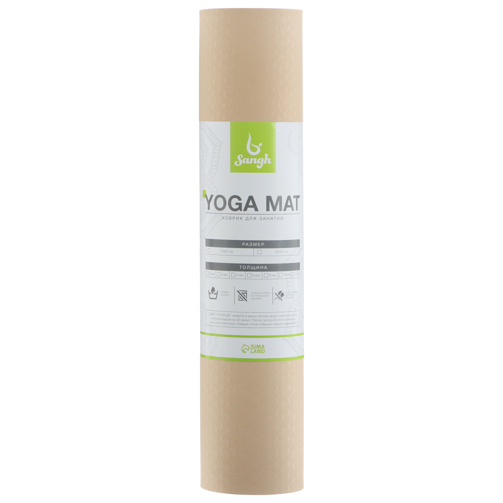 Коврик для йоги sangh, 183х61х0,6 см, цвет бежевый/коричневый. Коврик подходит для занятий йогой и фитнесом дома и в спортивных залах. Помогает в выполнении асан или других упражнений. Смягчает упор тела на твёрдую поверхность. Сохраняет форму после выполнения упражнений. Особенность коврика из термопластичной резины состоит в том, что он обладает антискользящими свойствами, сохраняет форму, имеет плотную и упругую структуру. Коврик из термопластичного эластомера эластичный и мягкий, приятный на ощупь, не выгорает на солнце и устойчив к распространению бактерий. Но его нужно беречь от обильной влаги, чтобы не допустить скольжение на гладкой поверхности. Цвет: Бежевый Длина, см: 183 Ширина, см: 61 Толщина, мм: 6 Возраст: Взрослый Материал: Термопластичный эластомер Особенности: Нескользящий Особенности: Эластичный Особенности: Водоотталкивающий Вид: Классический  развернуть описание ▼