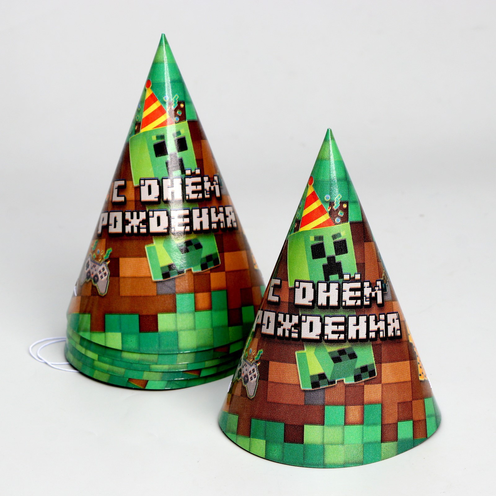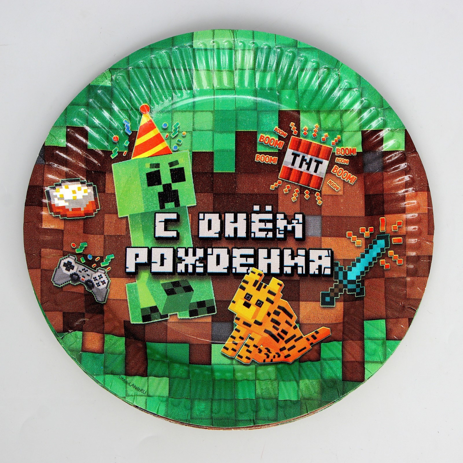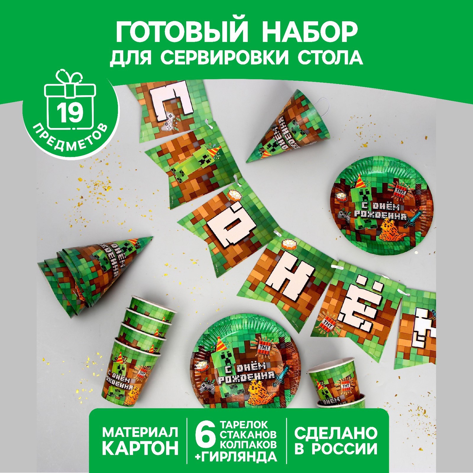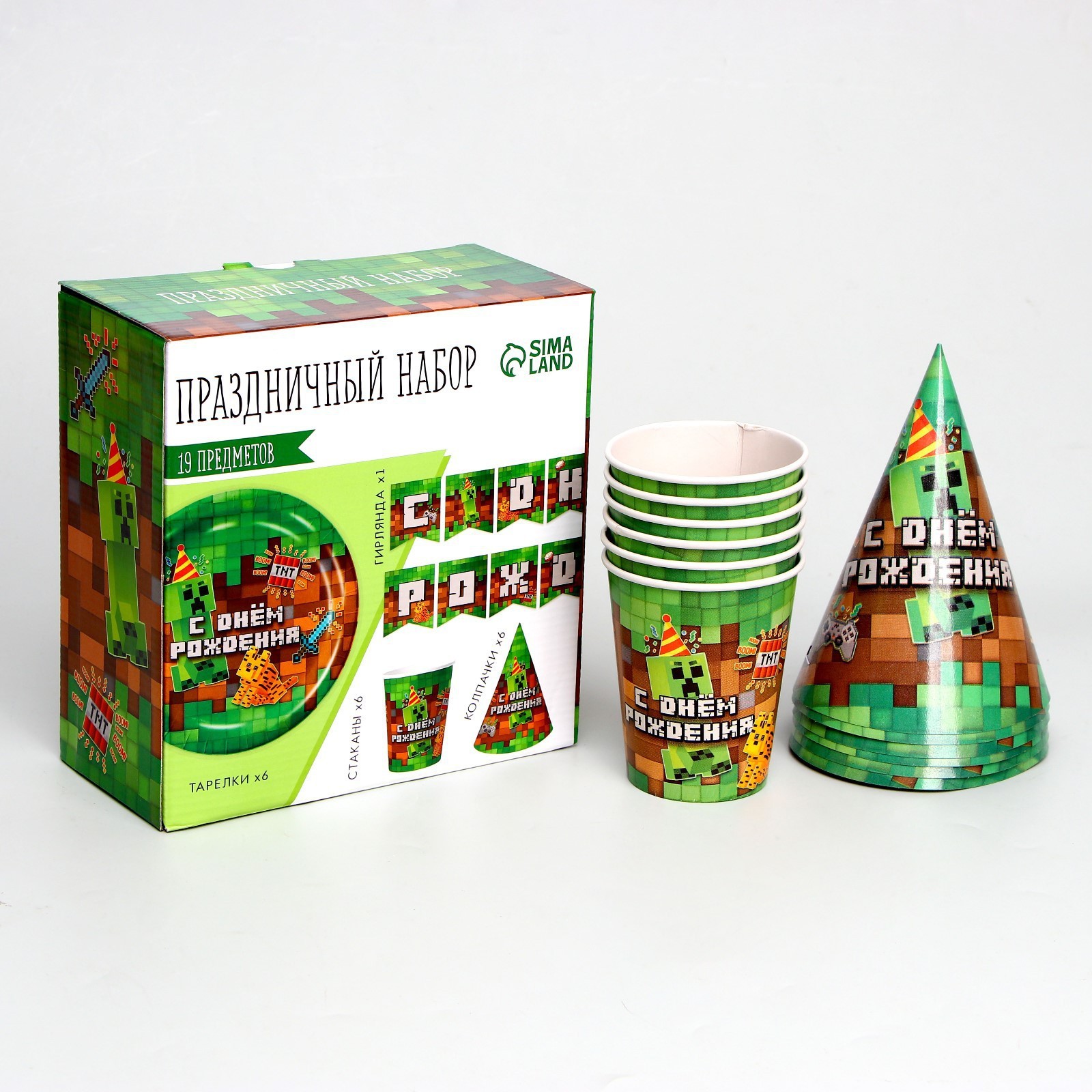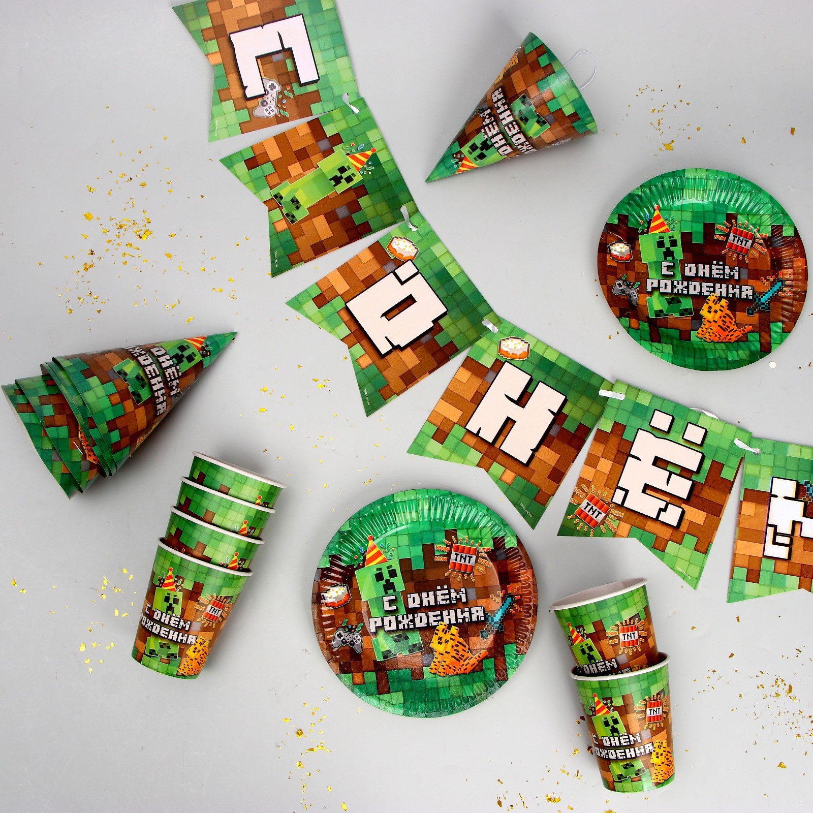 Набор бумажной посуды одноразовый с днём рождения», пиксели, 6 тарелок, 6 стаканов, 6 колпаков